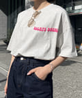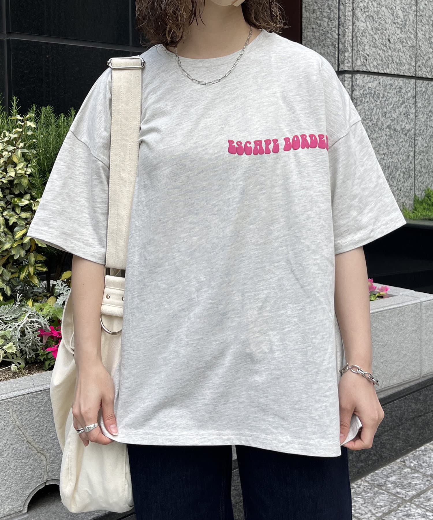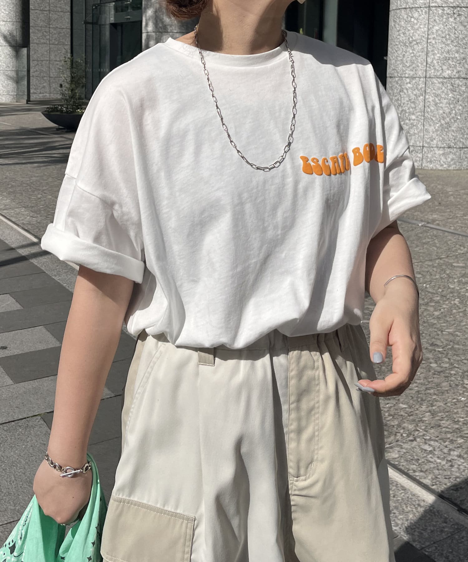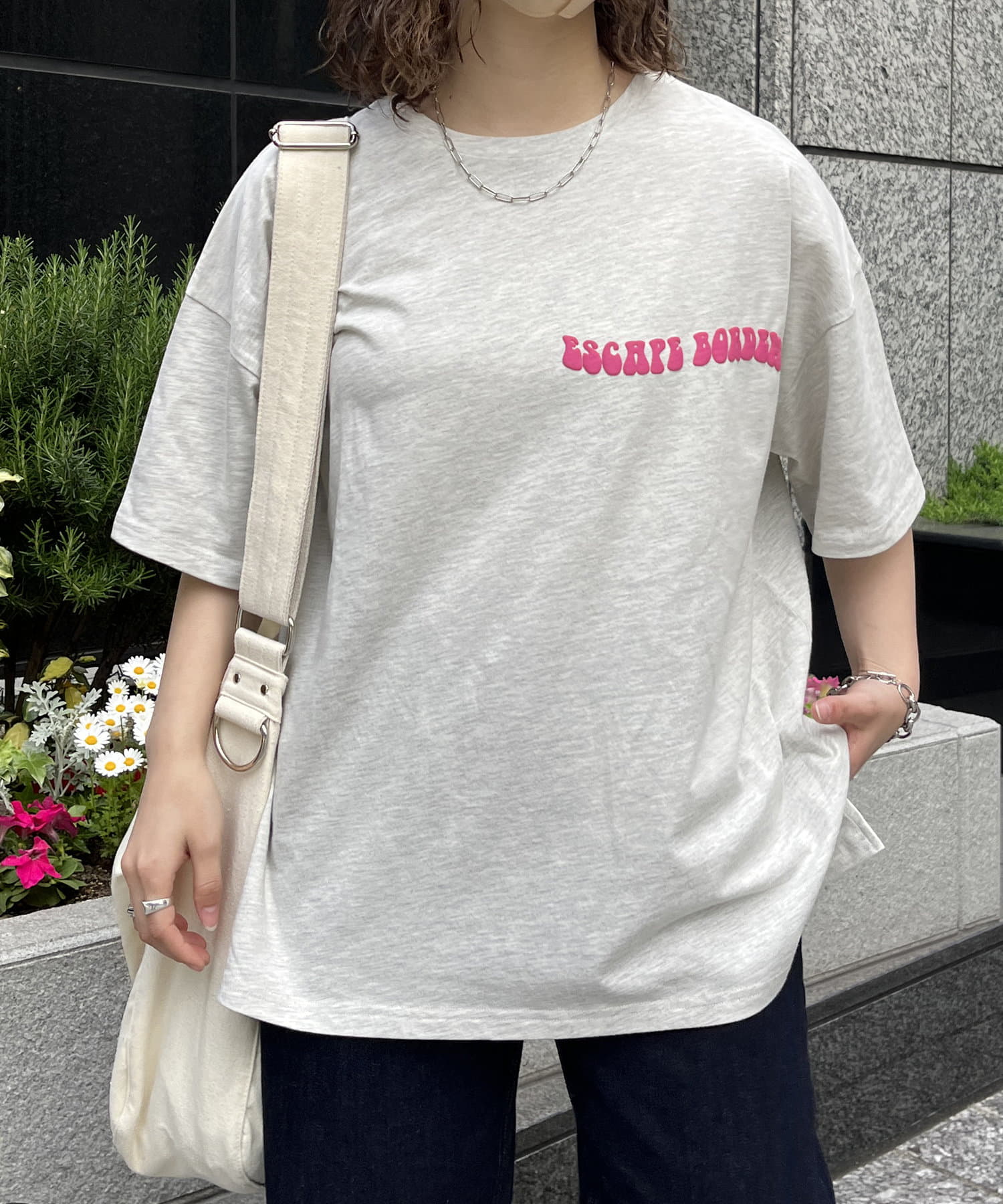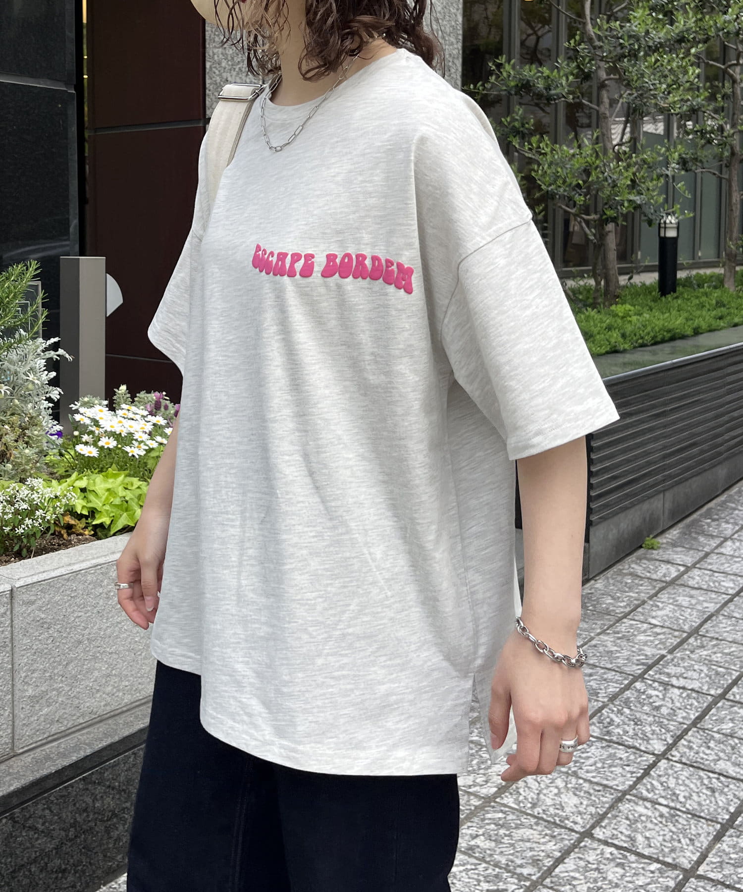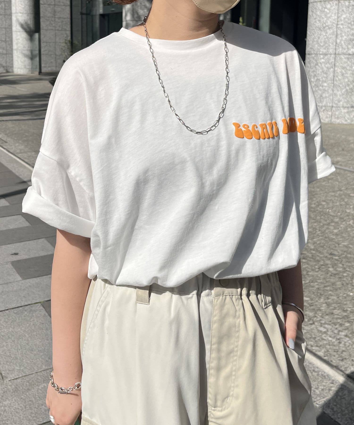 ゆったりとしたビッグシルエットなTシャツはボトムを選ばず、タイトなパンツからスカートまで幅広いボトムと好相性。