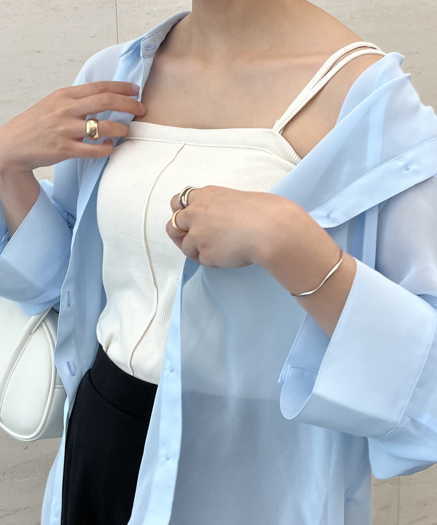 シアーシャツや透かし編みニットなどヘルシーな着こなしがオススメです。
