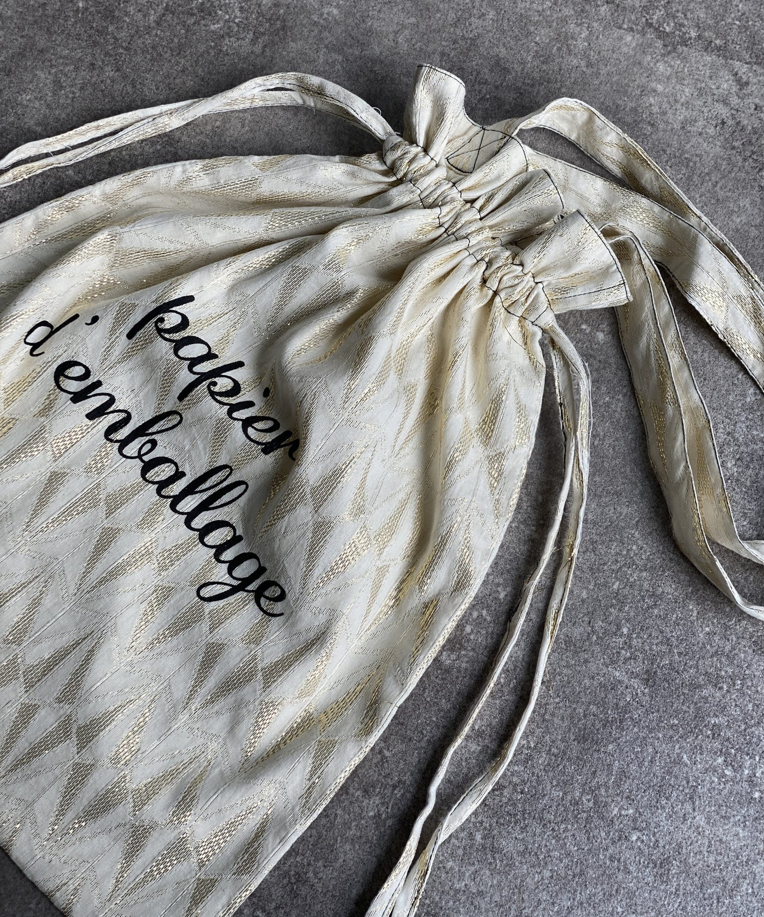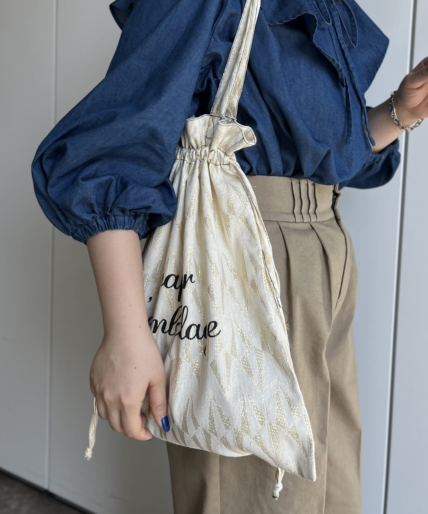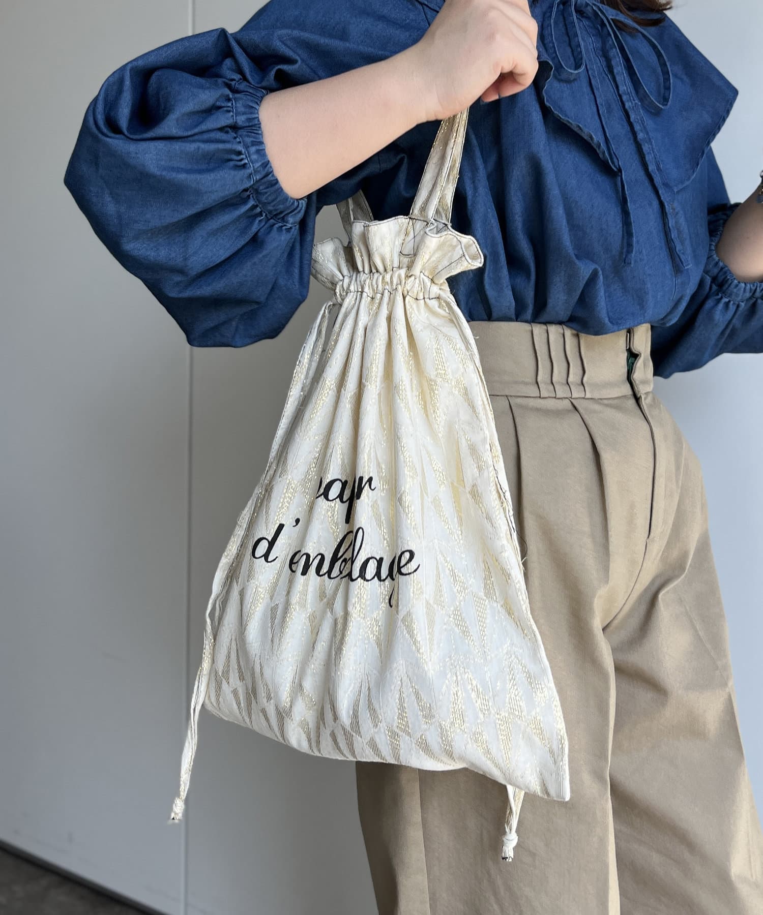 紐を絞るとくしゅっと巾着風にもなり雰囲気の違いを楽しめます。