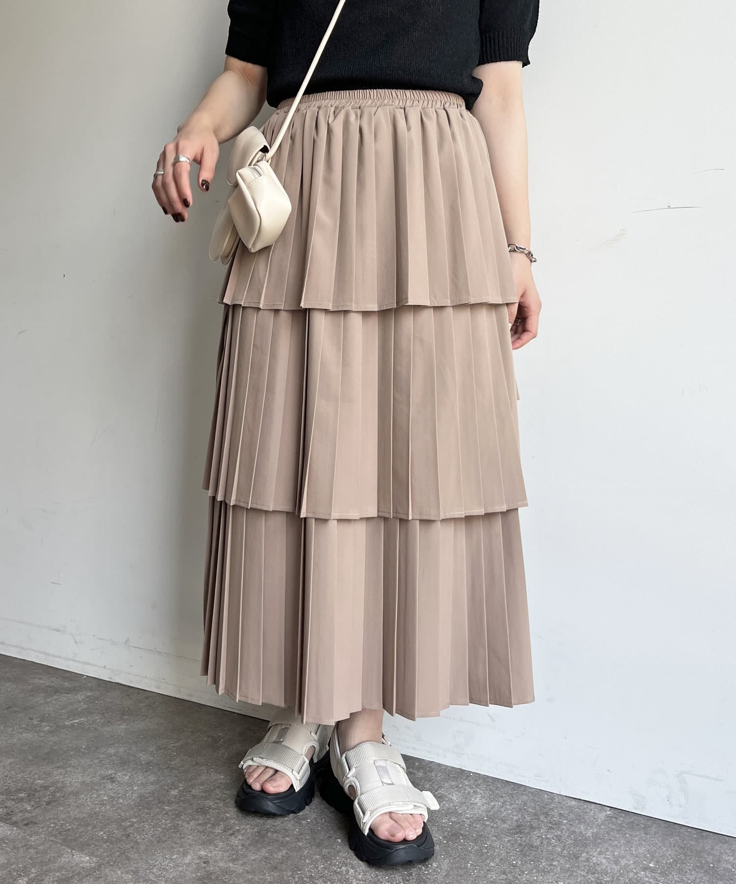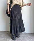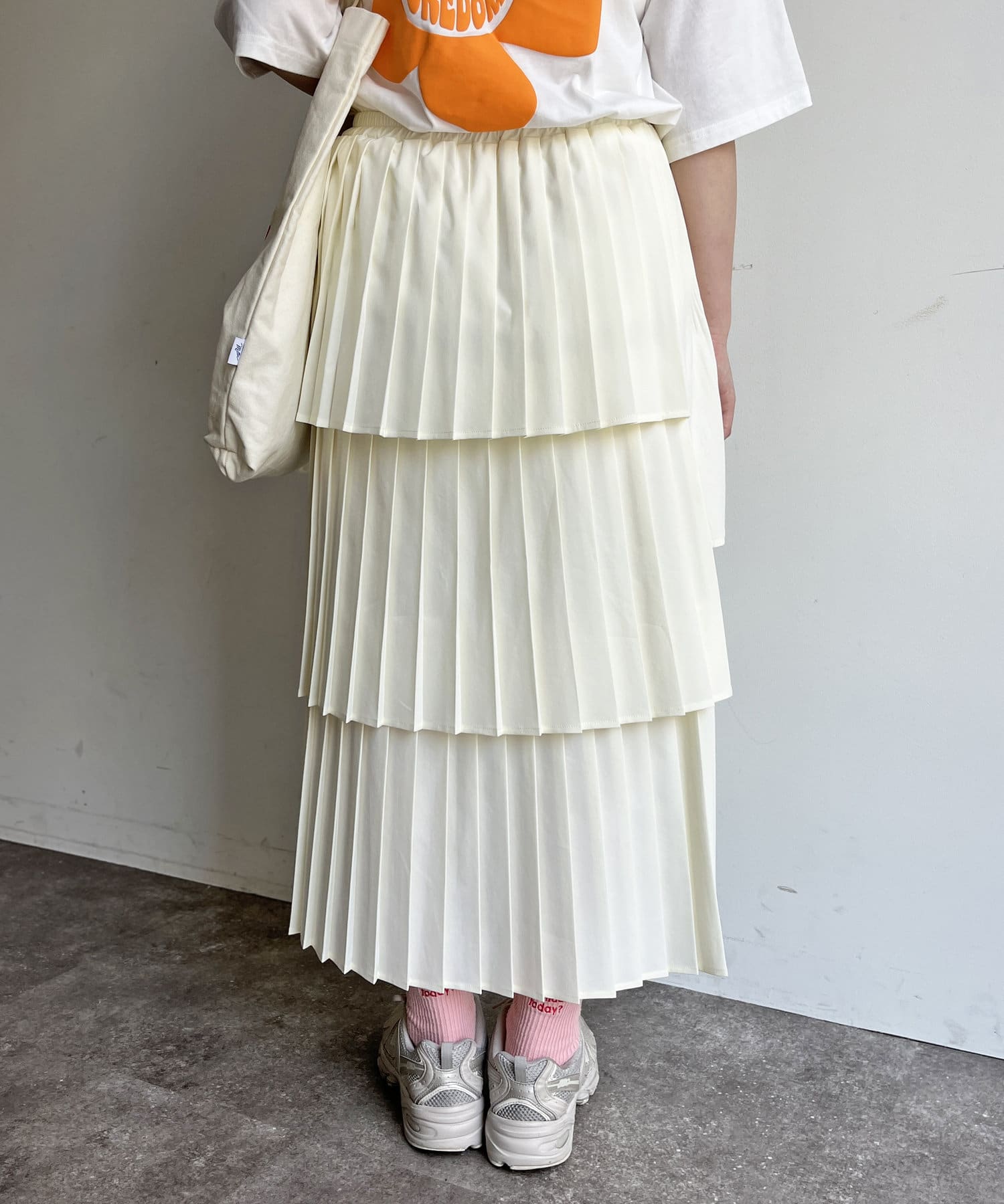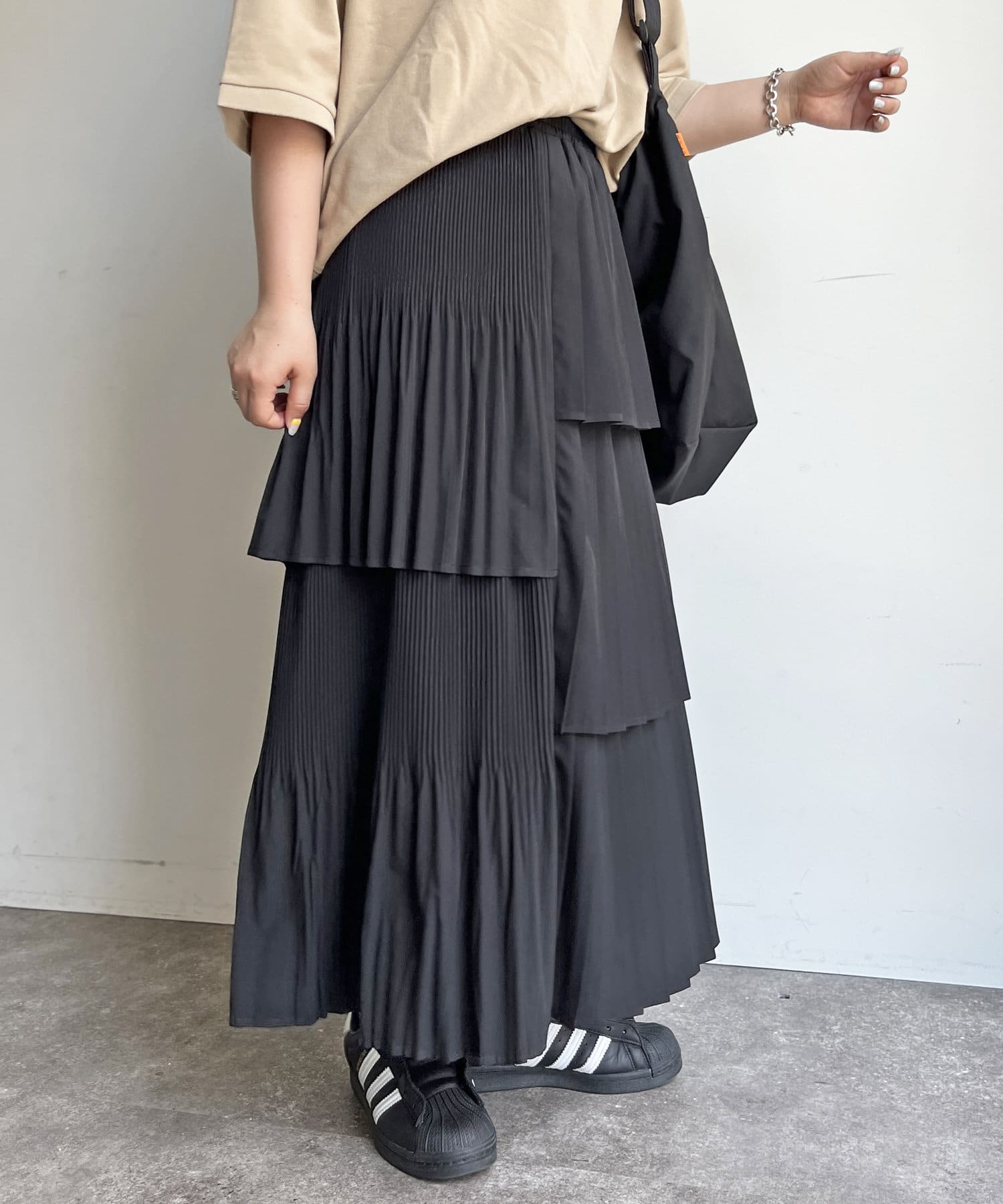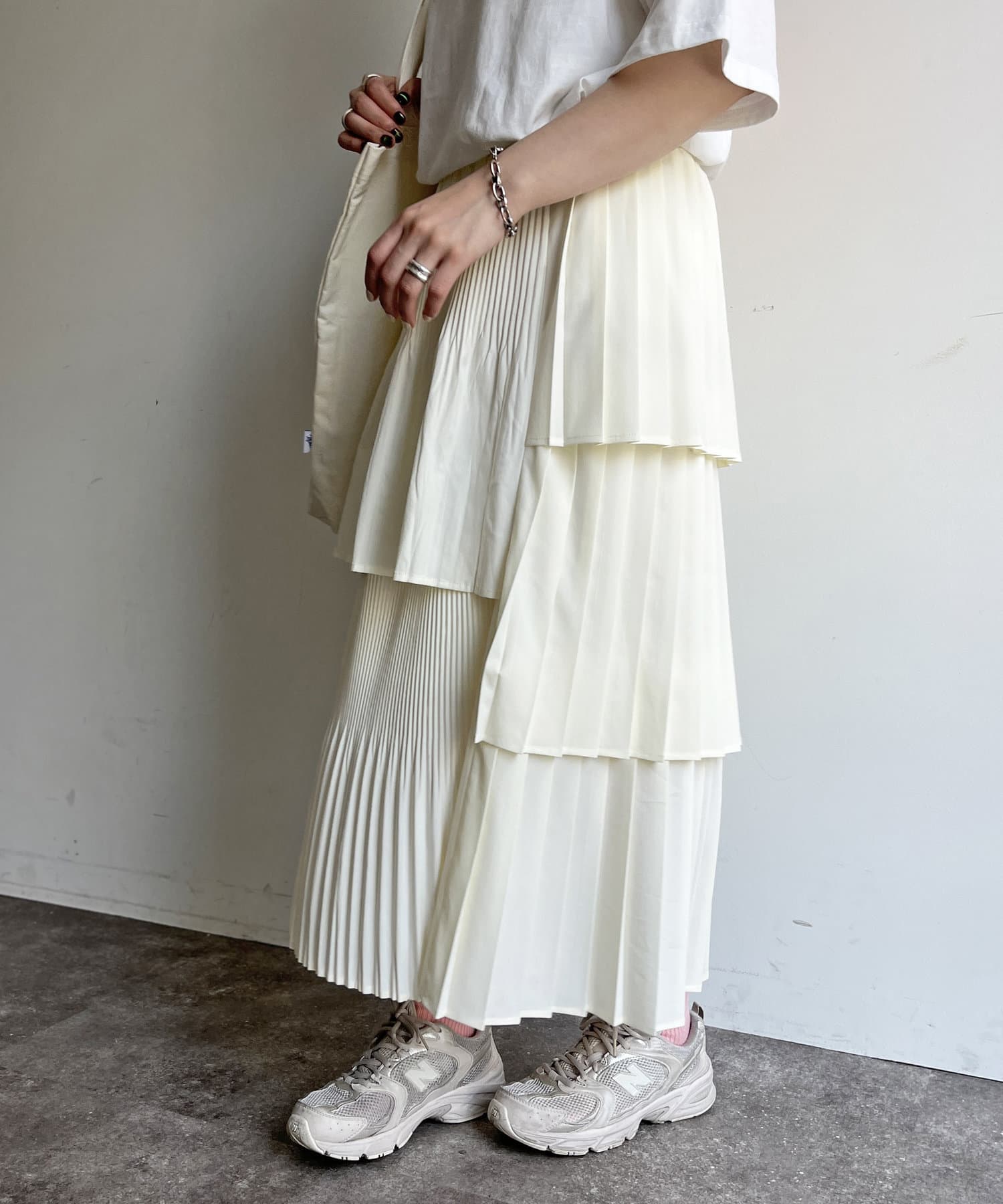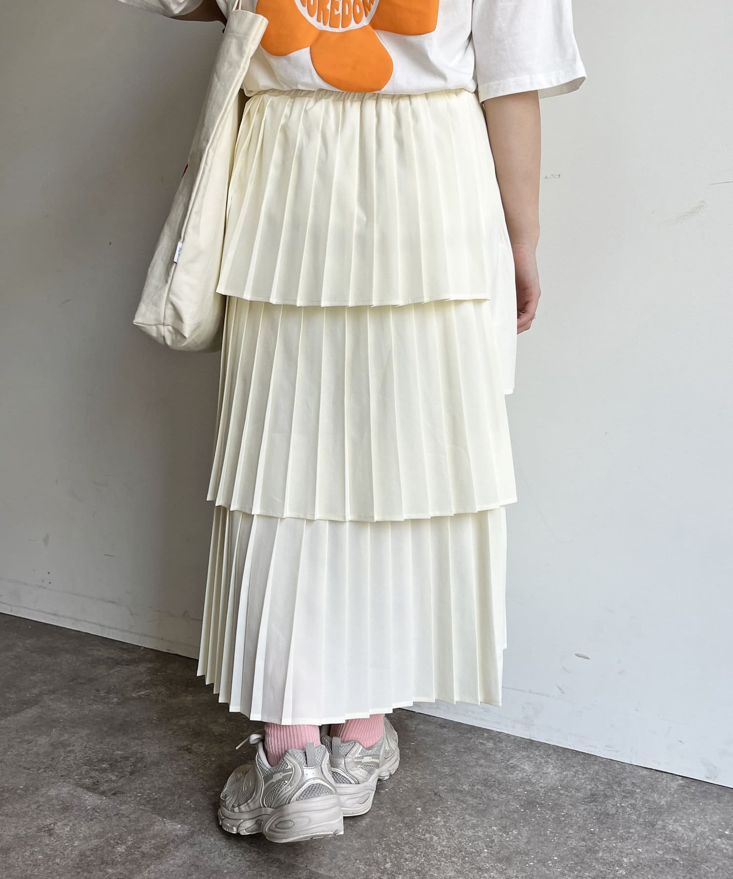 ふんわりと広がるティアードと歩くたびに軽やかに揺れるプリーツを合わせた贅沢スカート。
