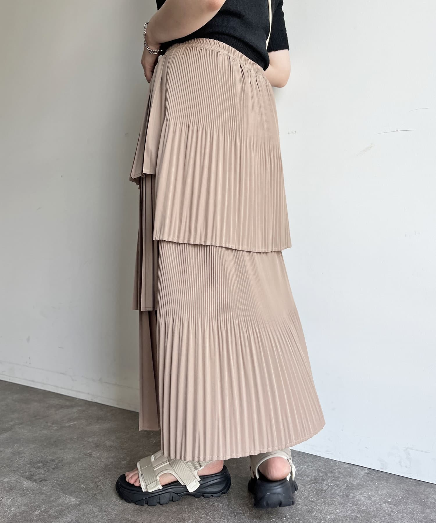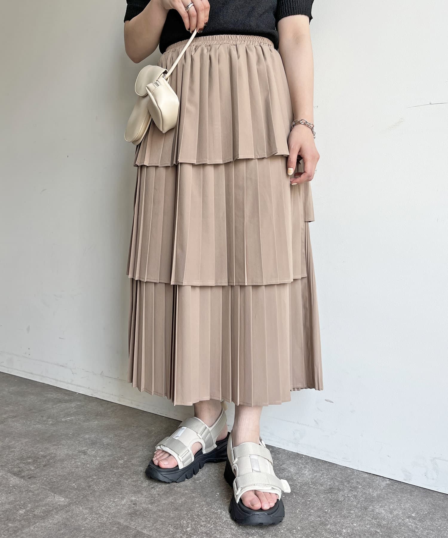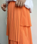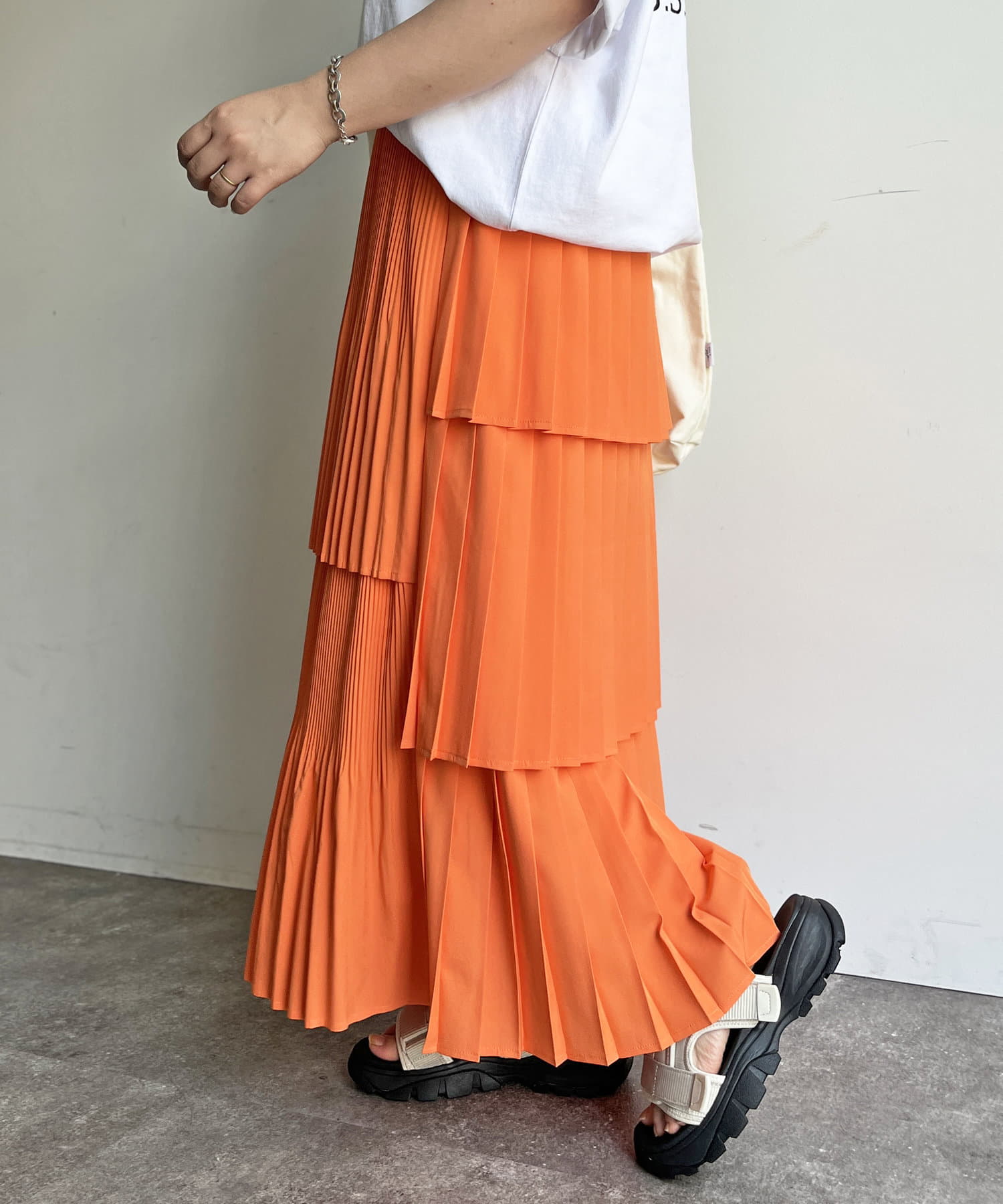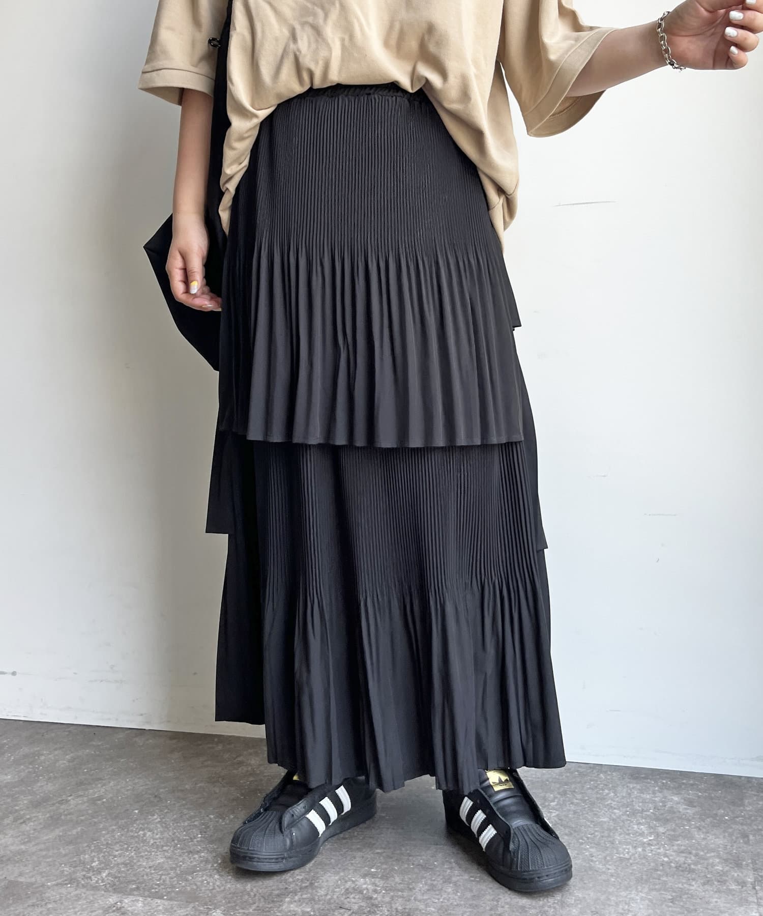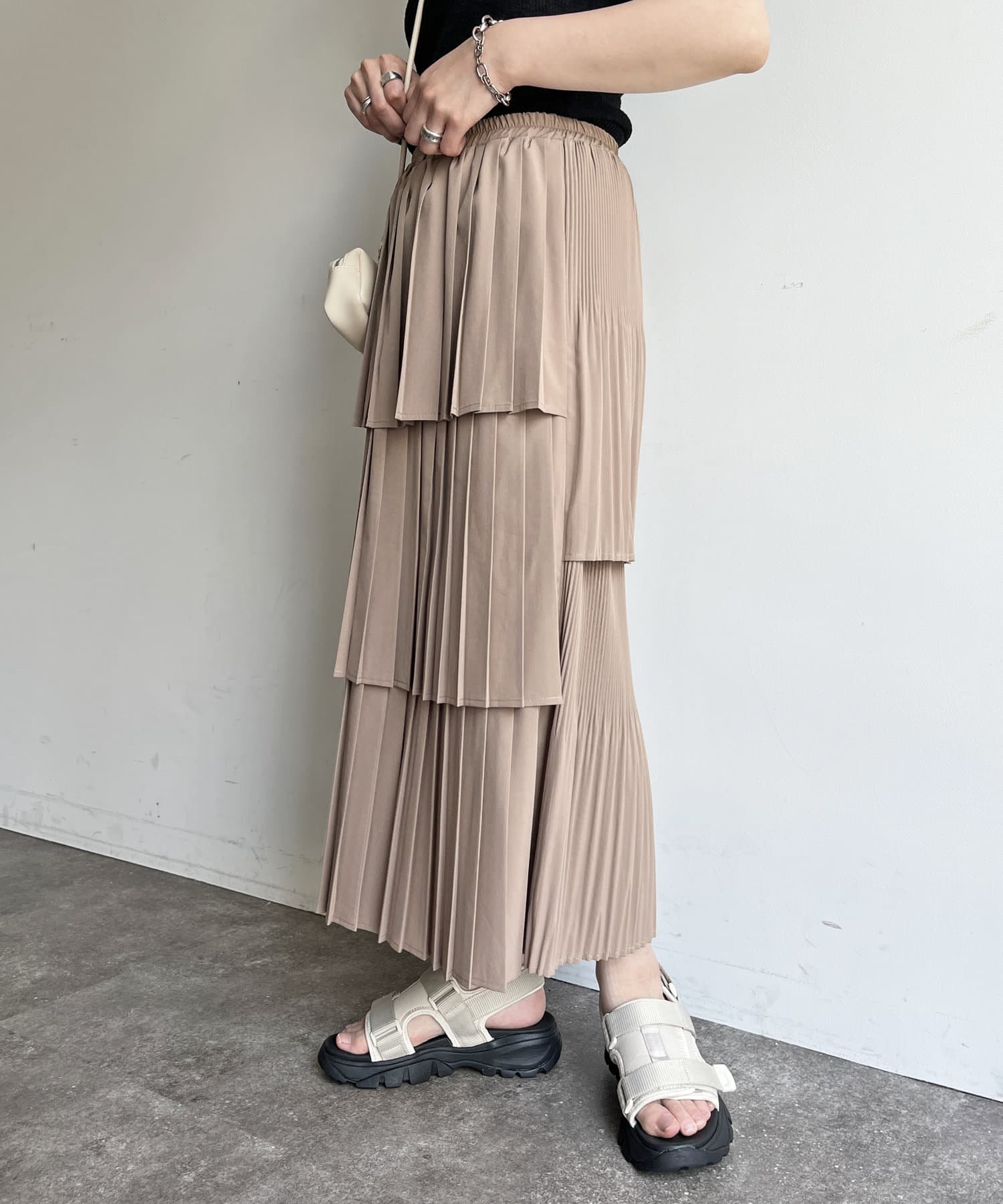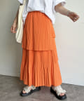 ふんわりと広がるティアードと歩くたびに軽やかに揺れるプリーツを合わせた贅沢スカート。