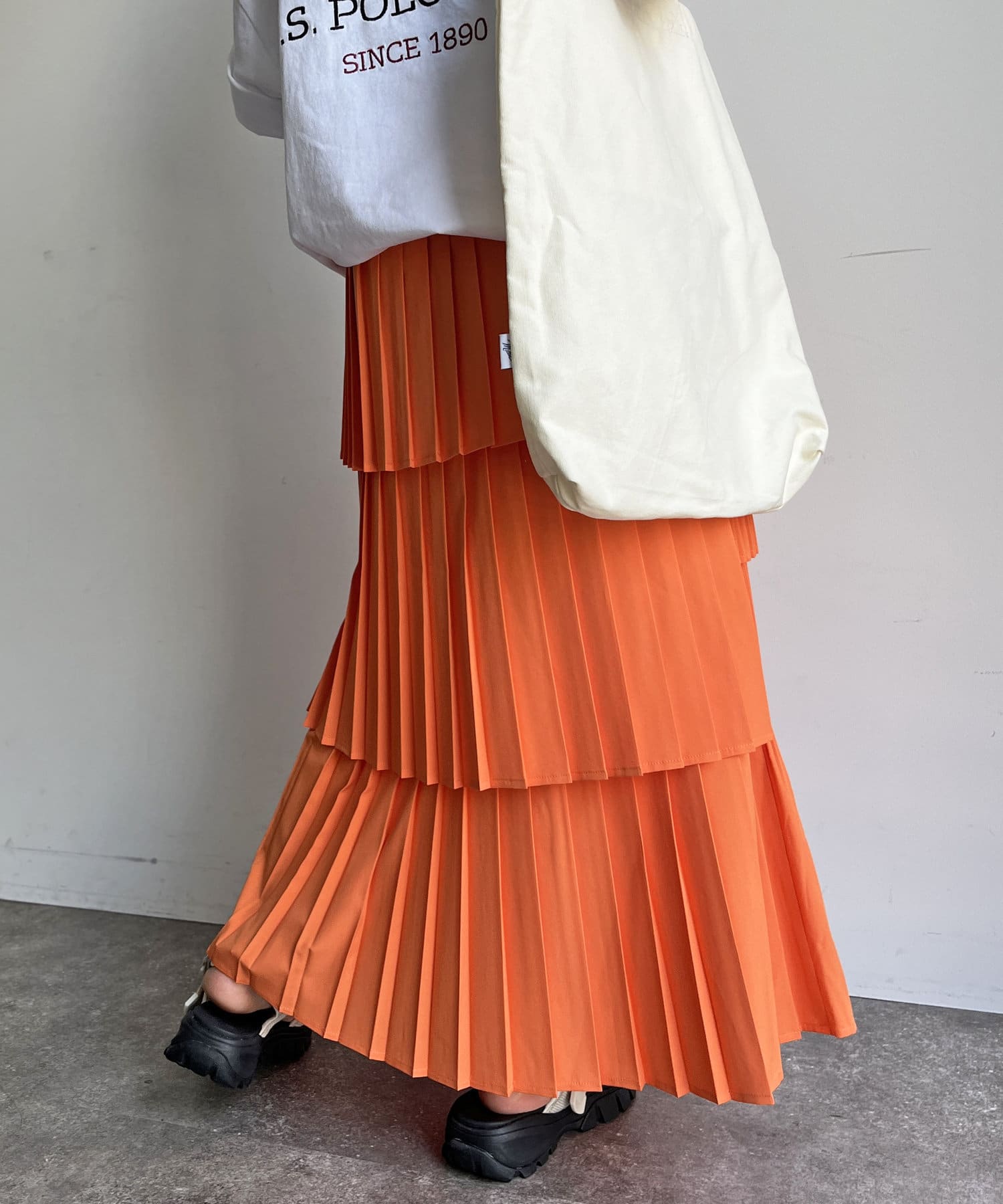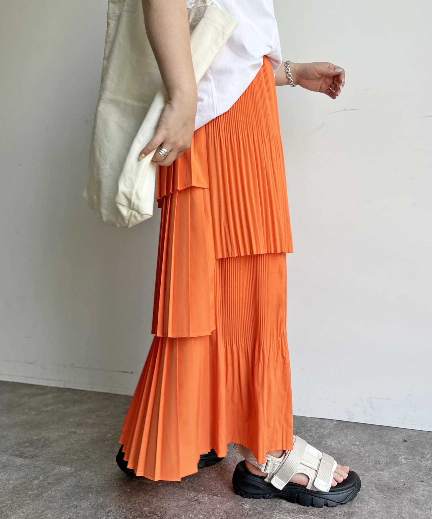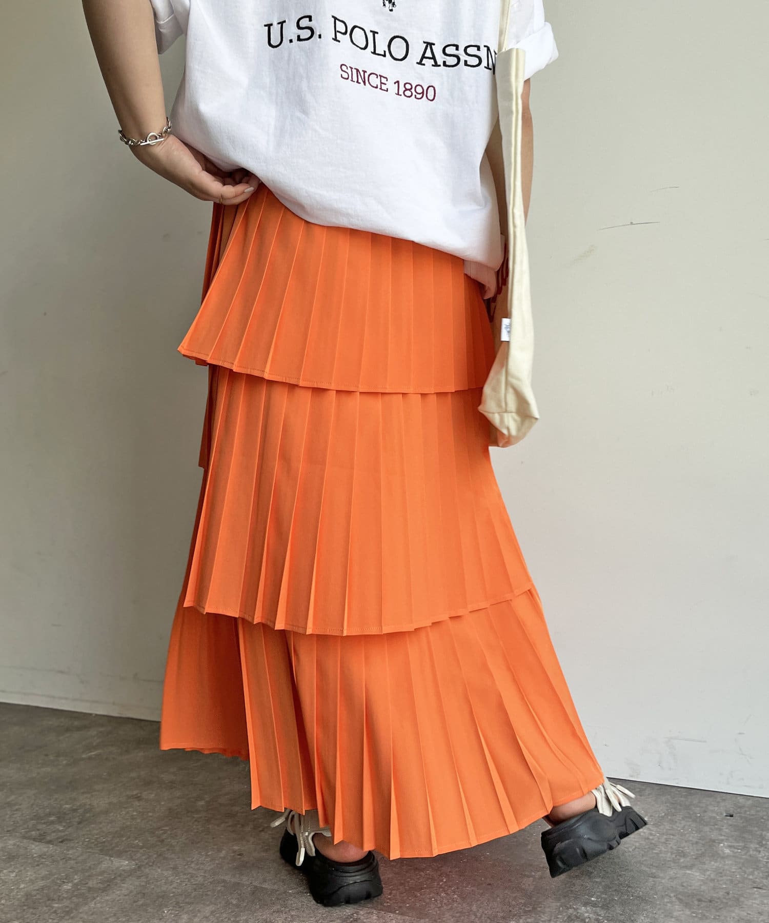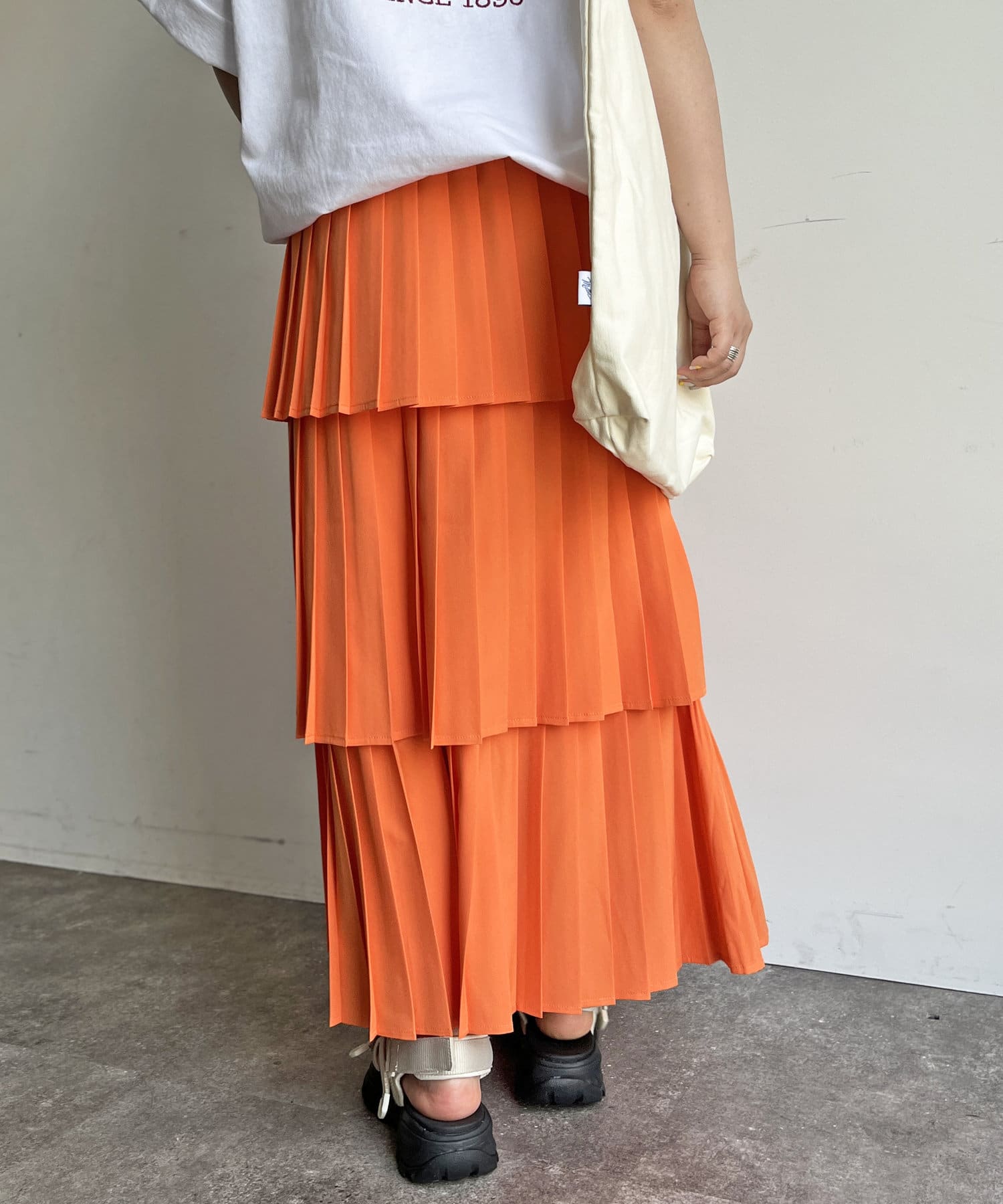 ふんわりと広がるティアードと歩くたびに軽やかに揺れるプリーツを合わせた贅沢スカート。