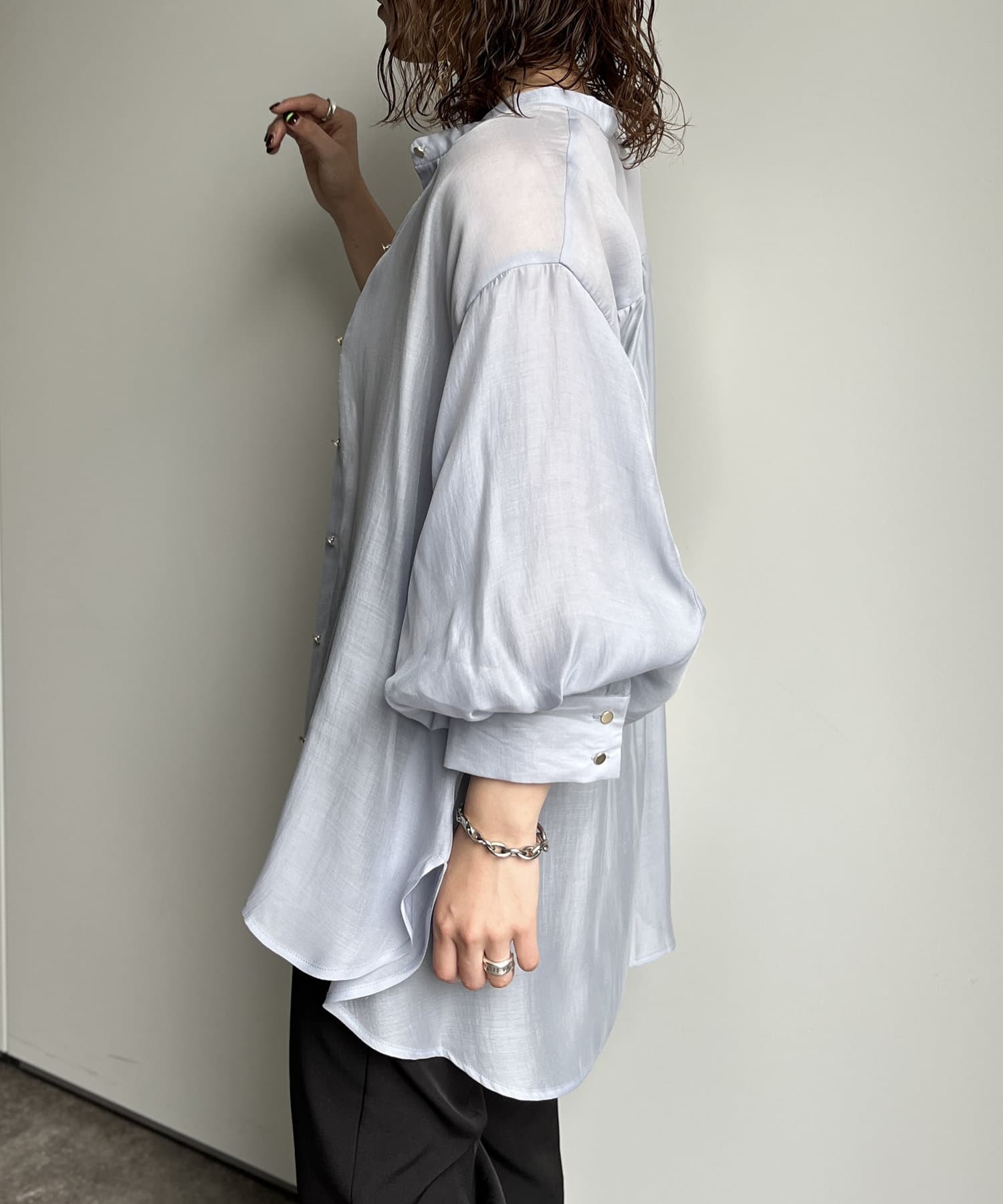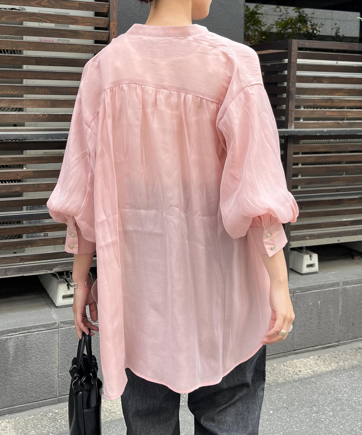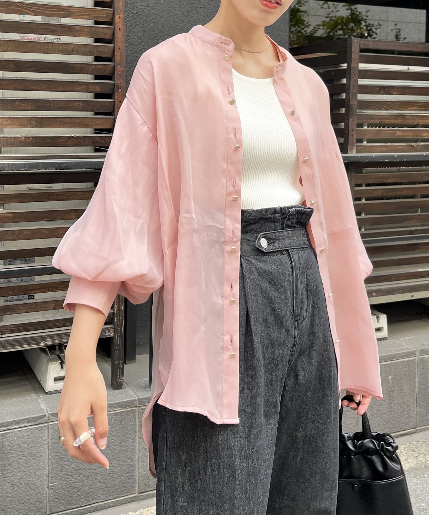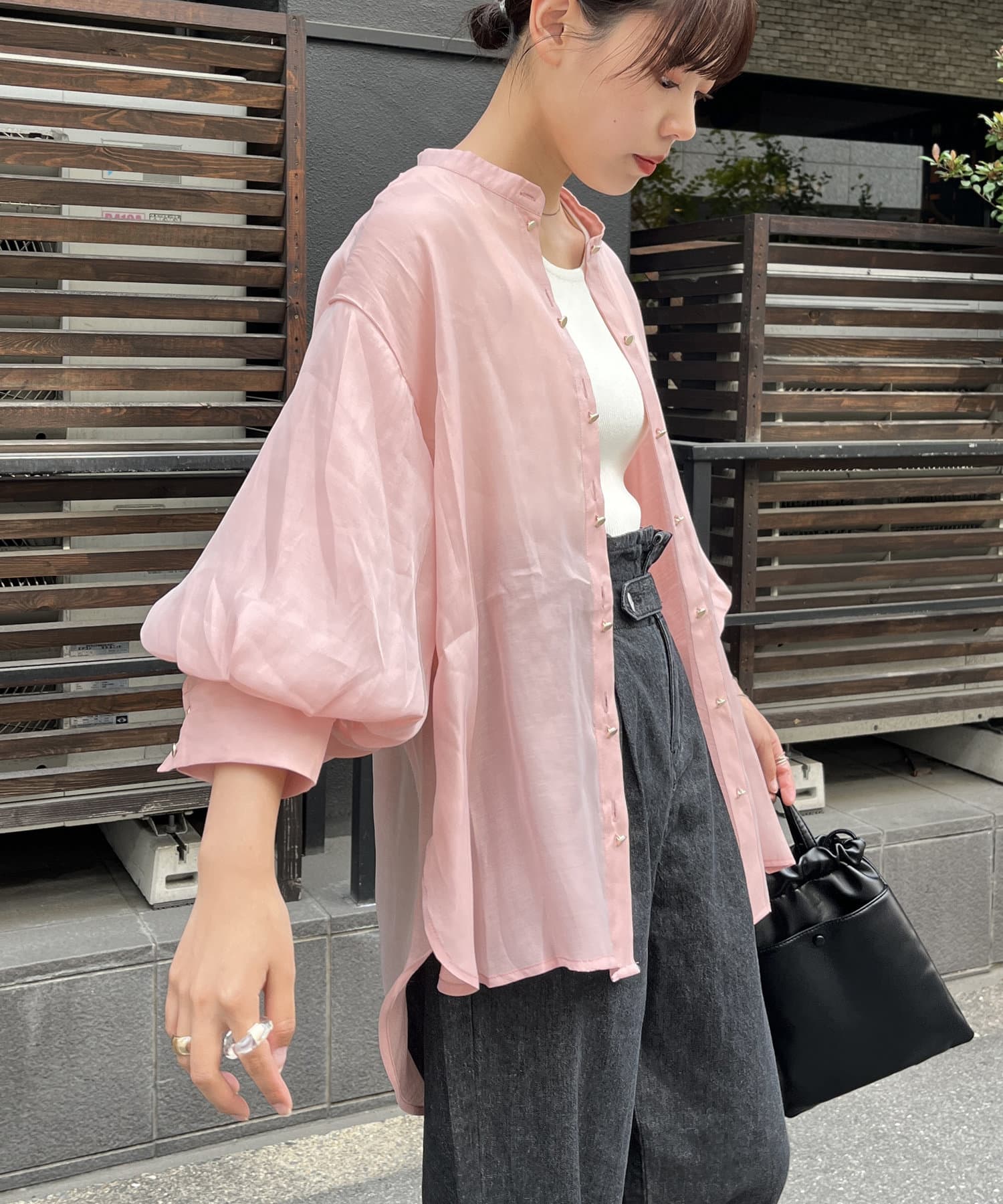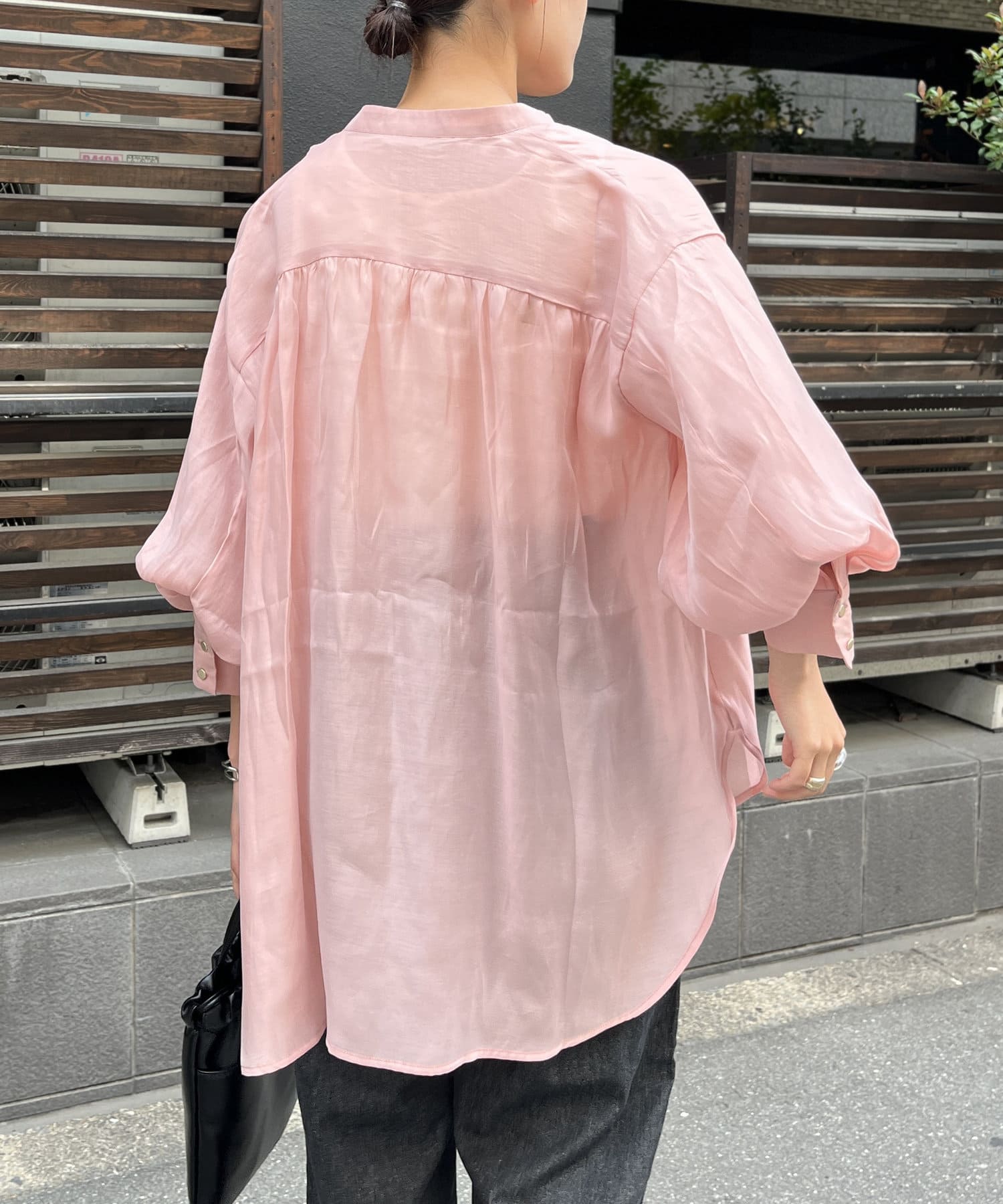 すっきりとした印象を与えてくれるバンドカラーで甘くなりすぎず着回し力の高い1枚です。