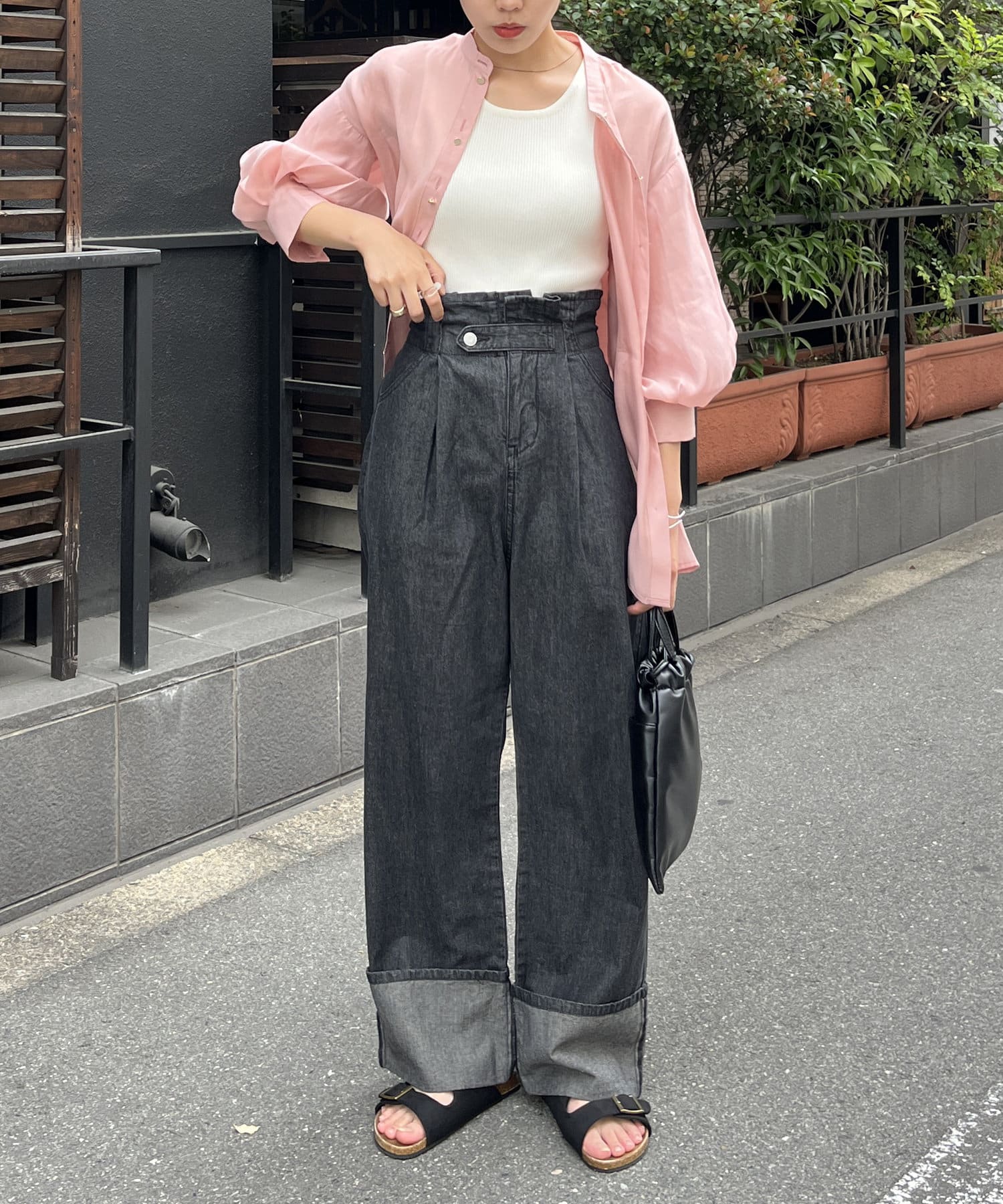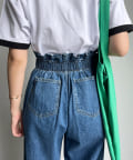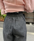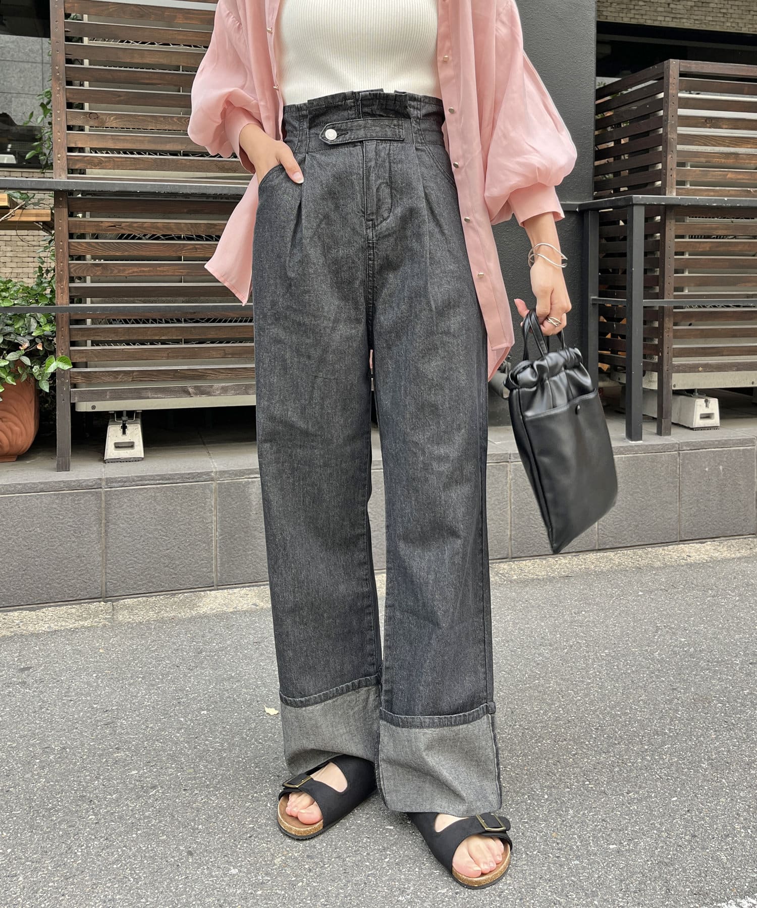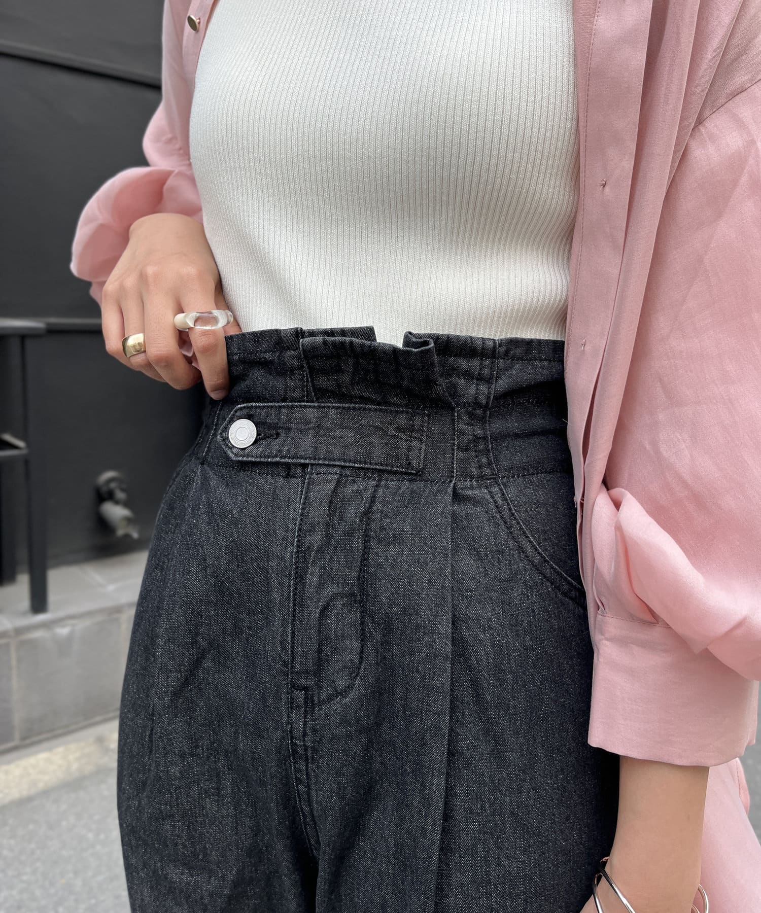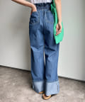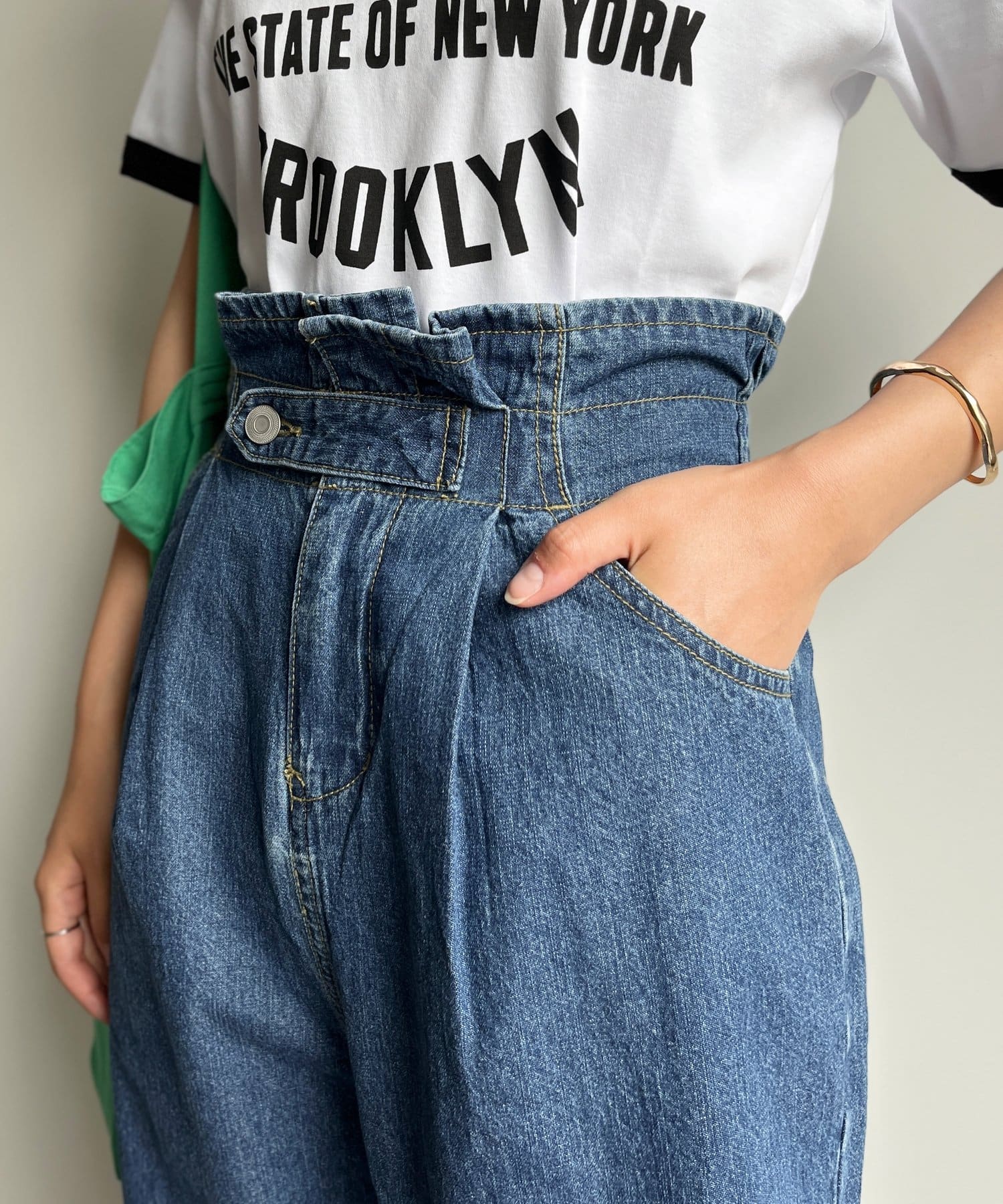 ウエストに入ったギャザーや裾の折り返しデザインなどディティールにこだわったデニムパンツ。