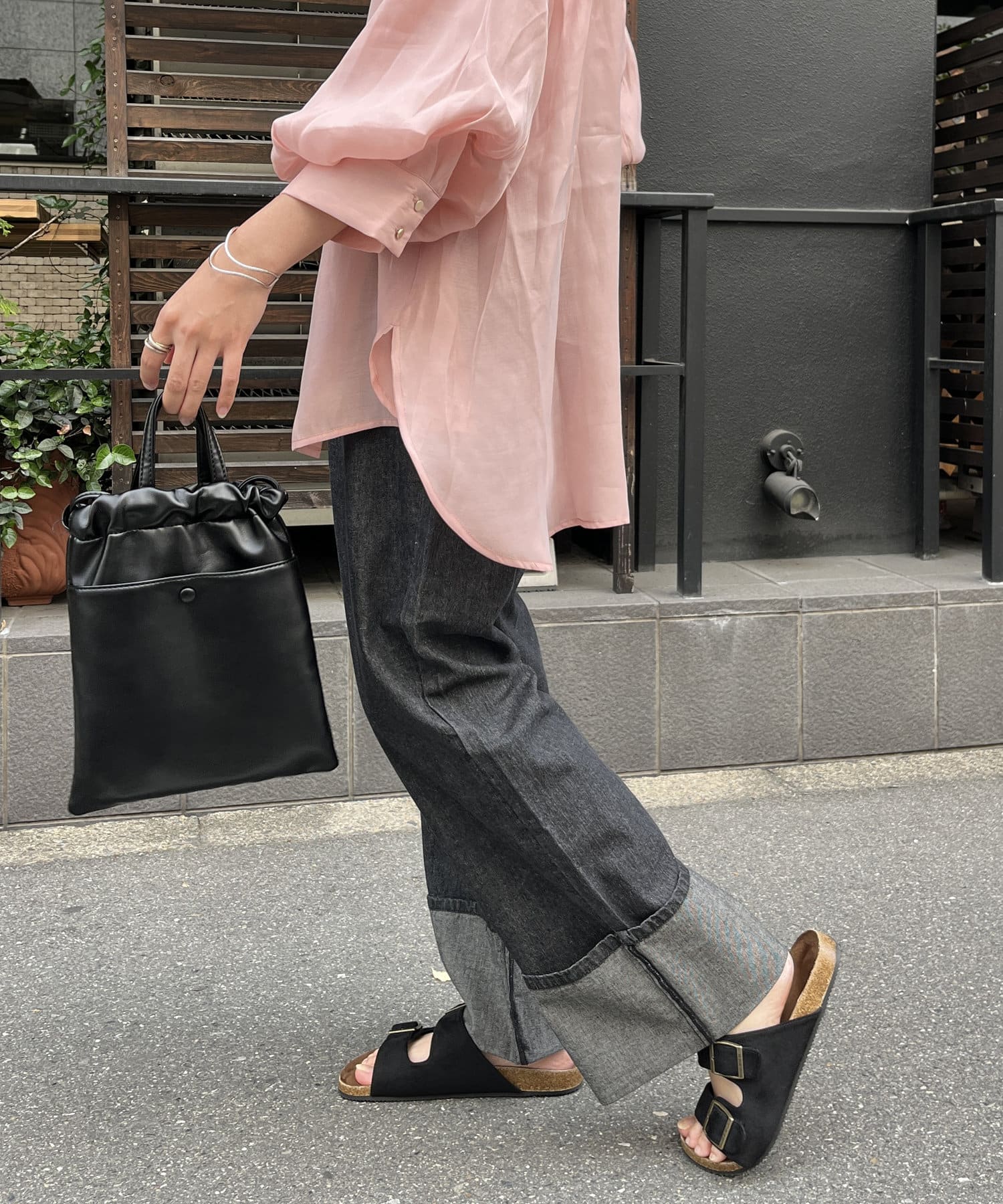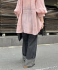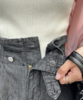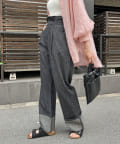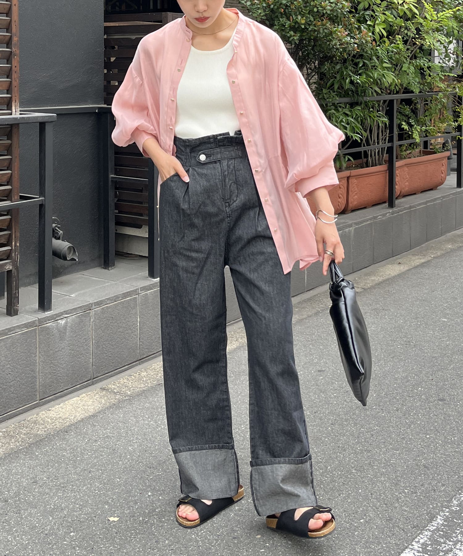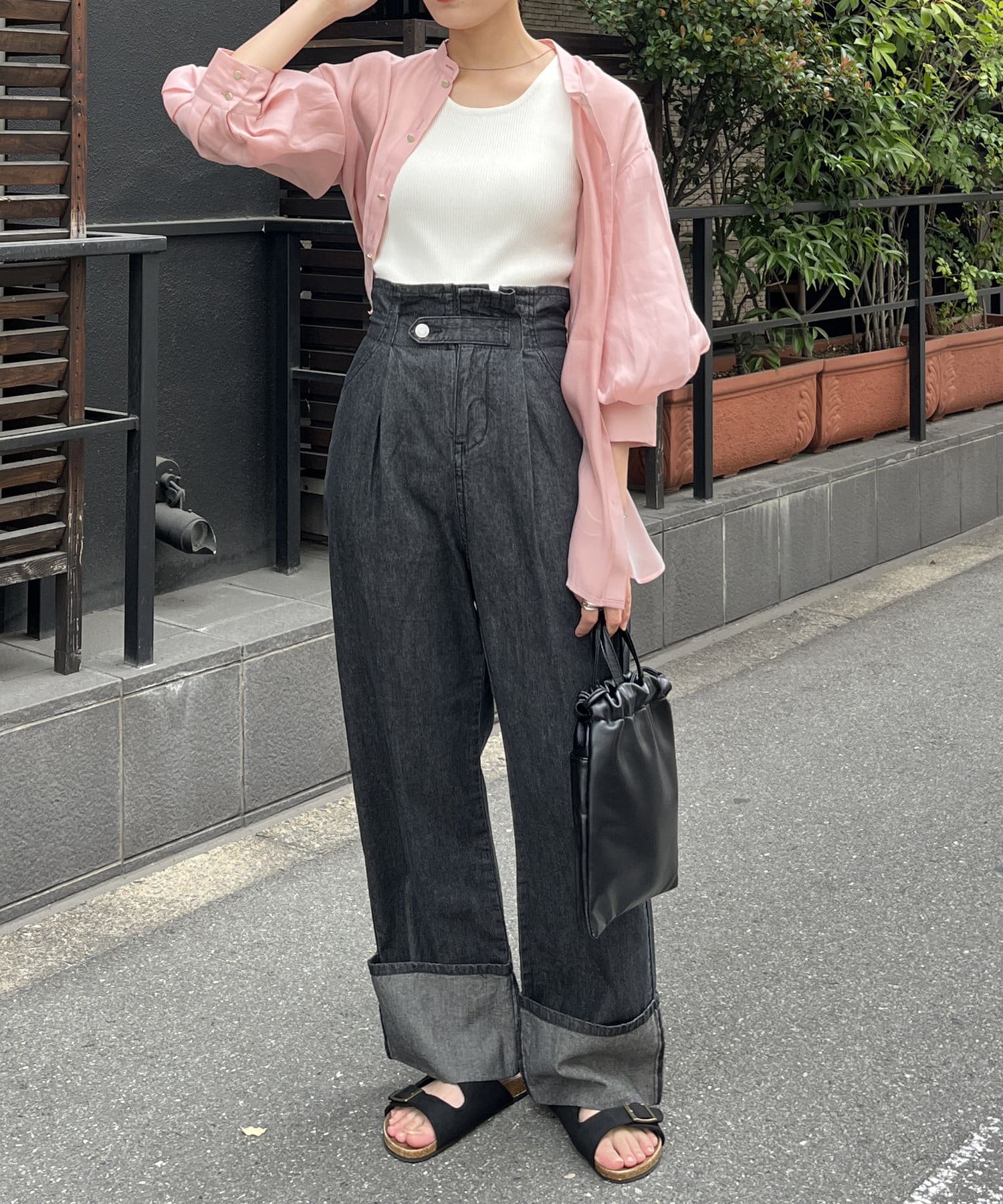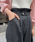 ウエストに入ったギャザーや裾の折り返しデザインなどディティールにこだわったデニムパンツ。