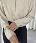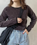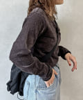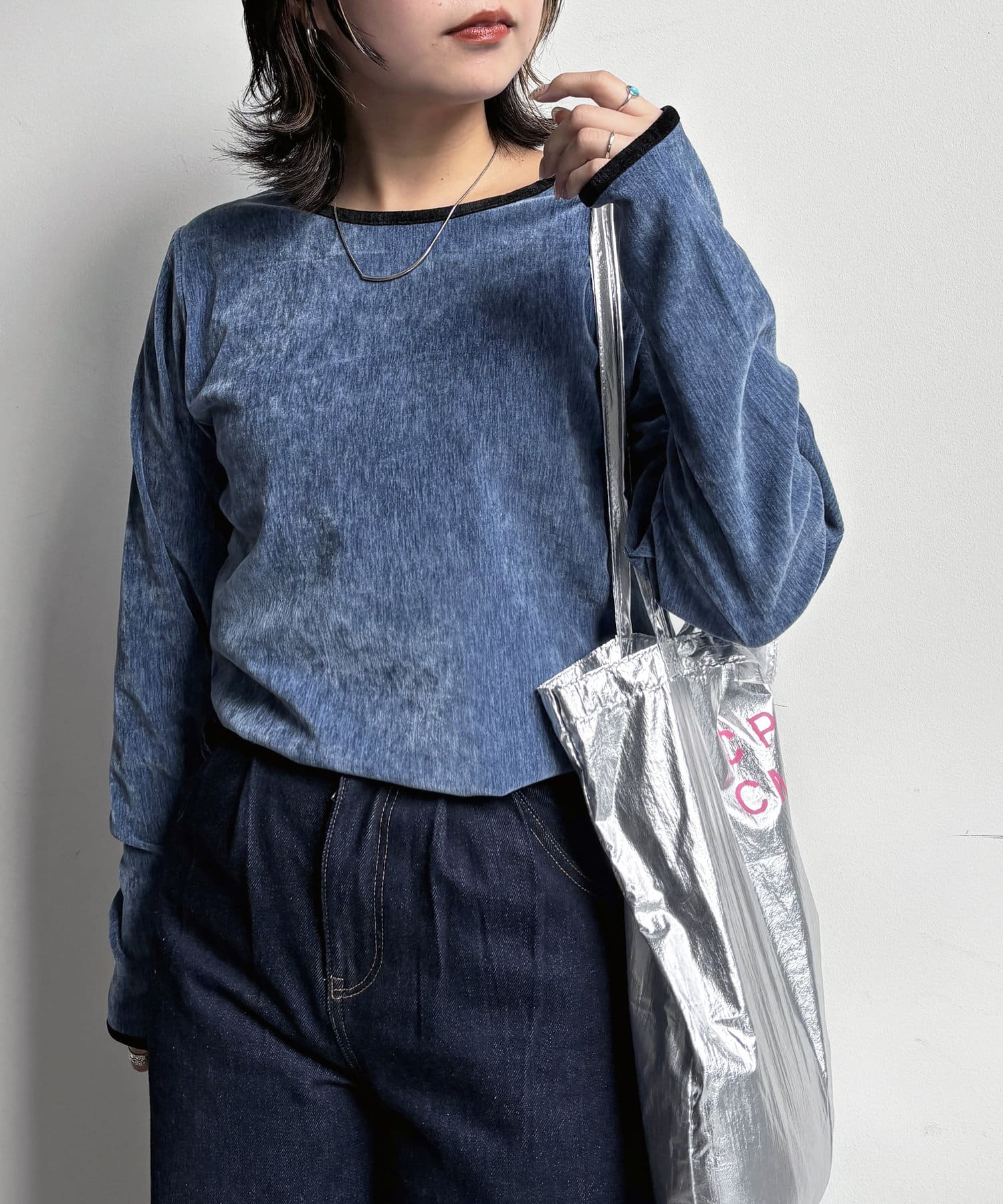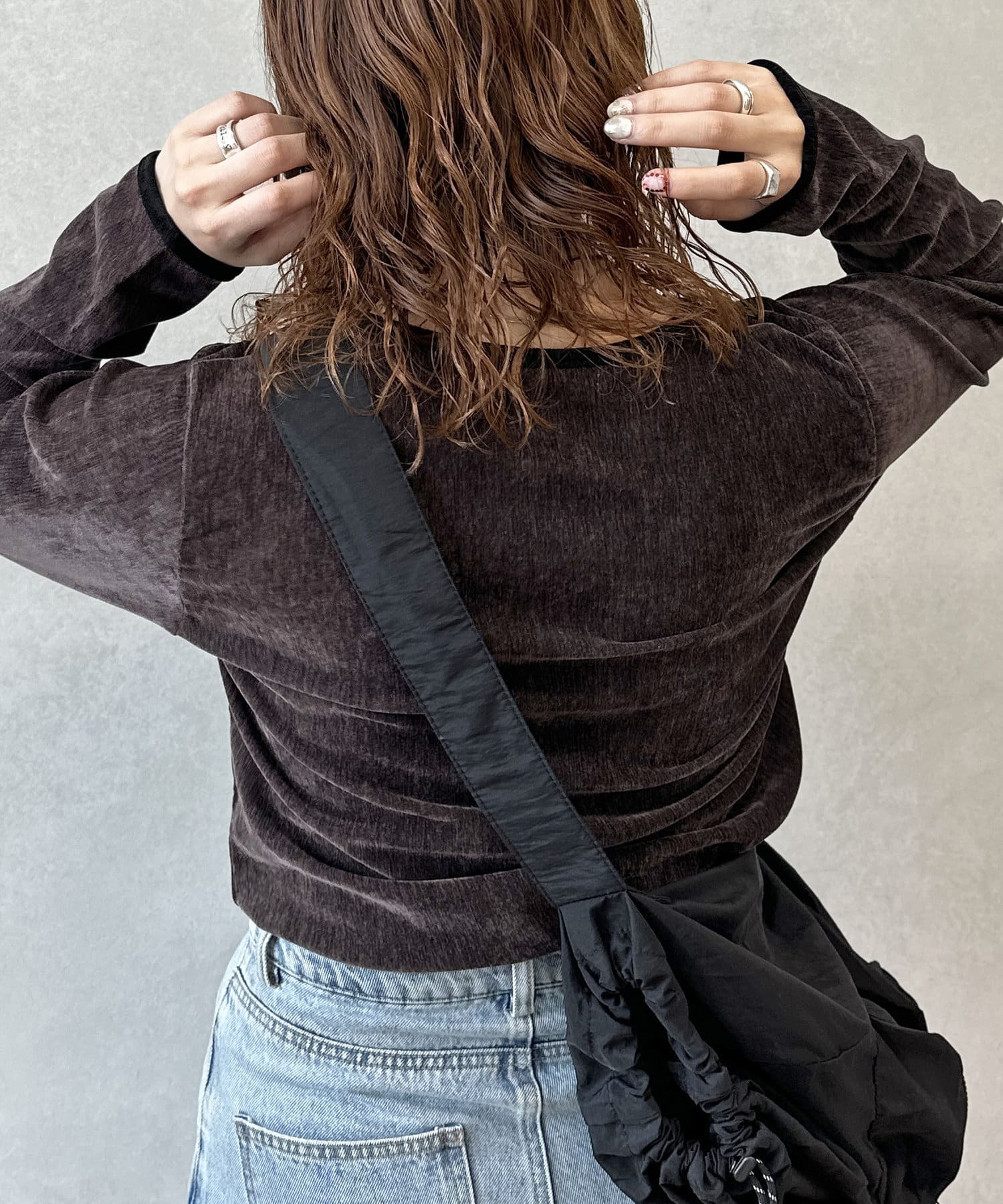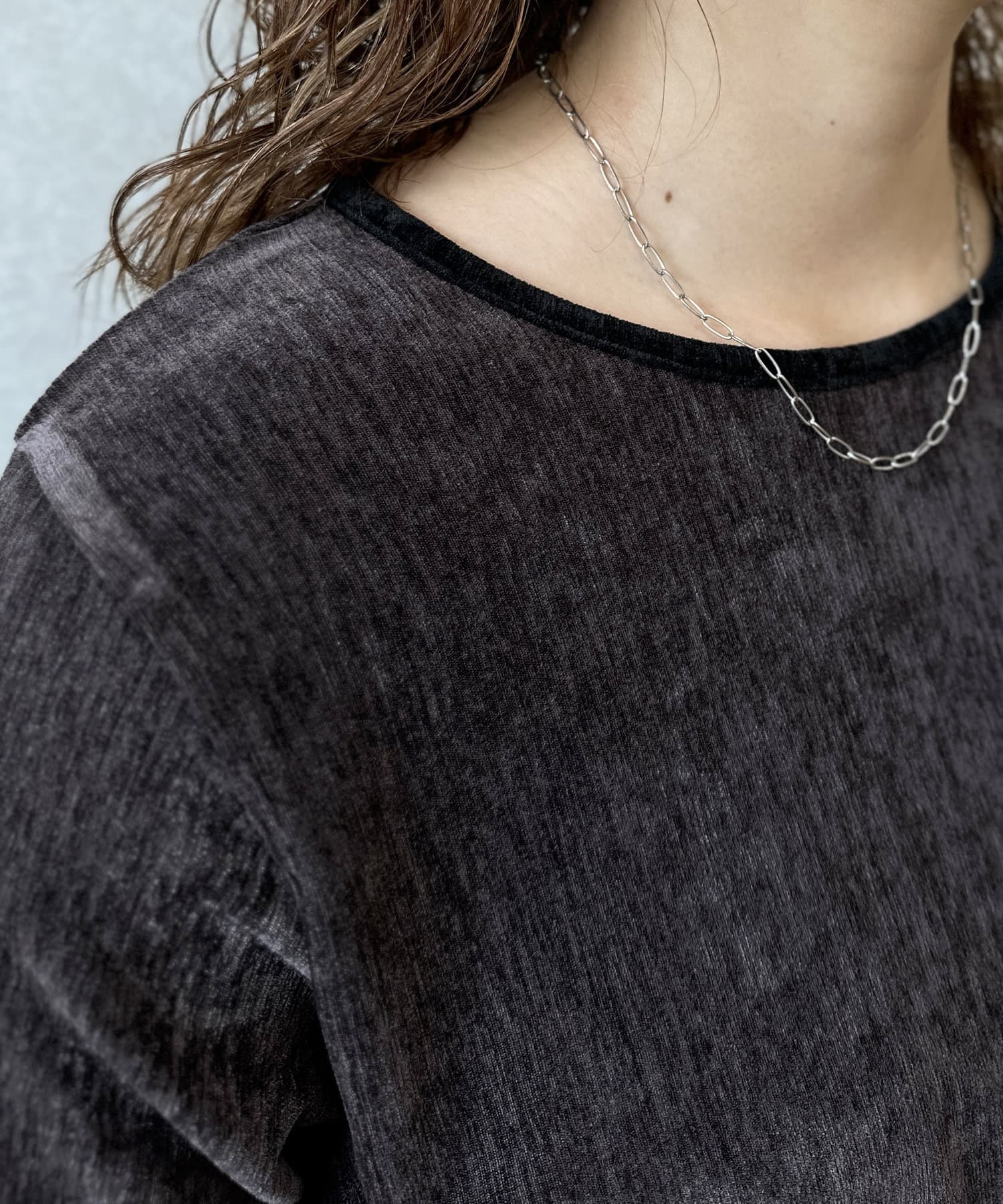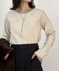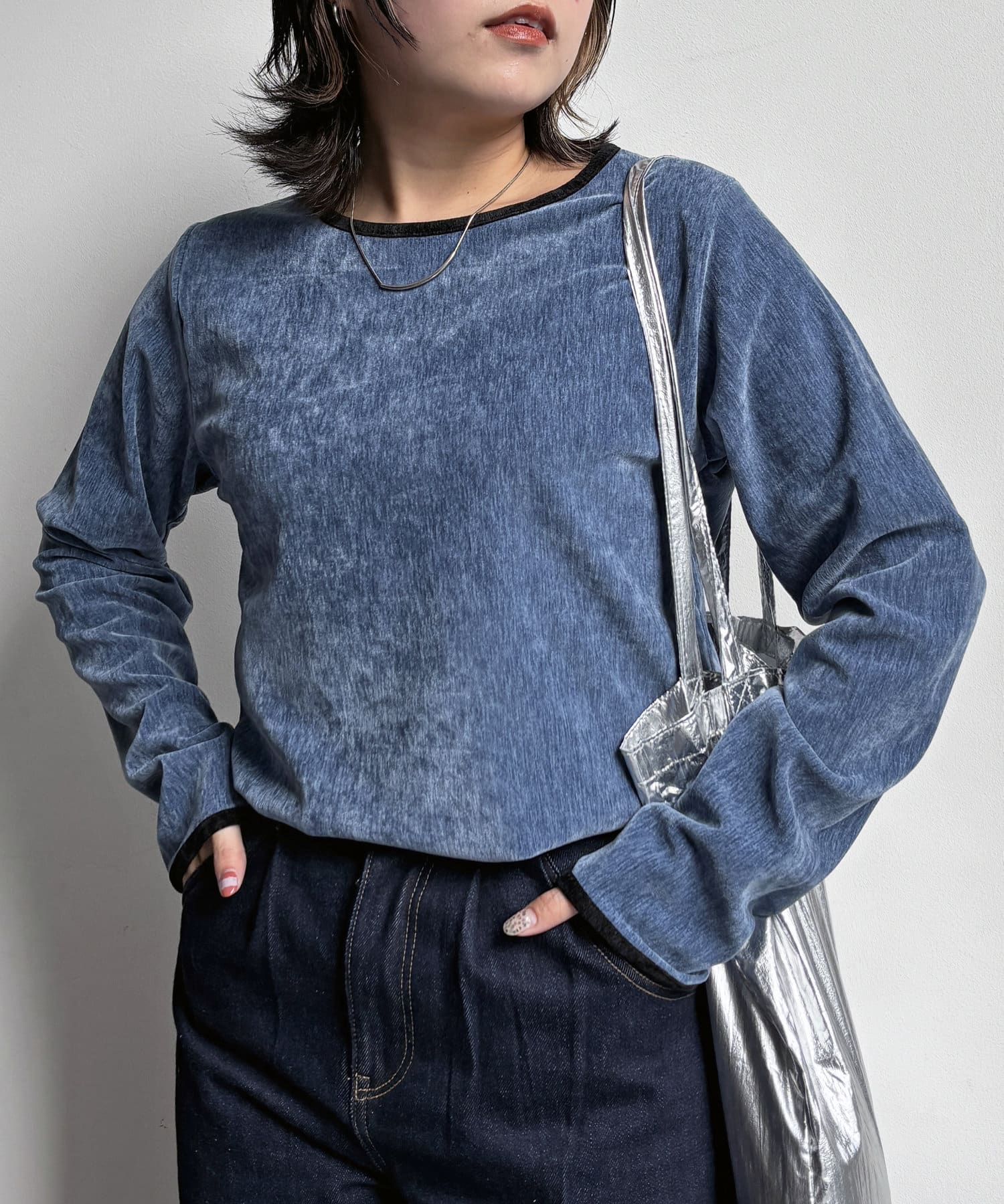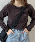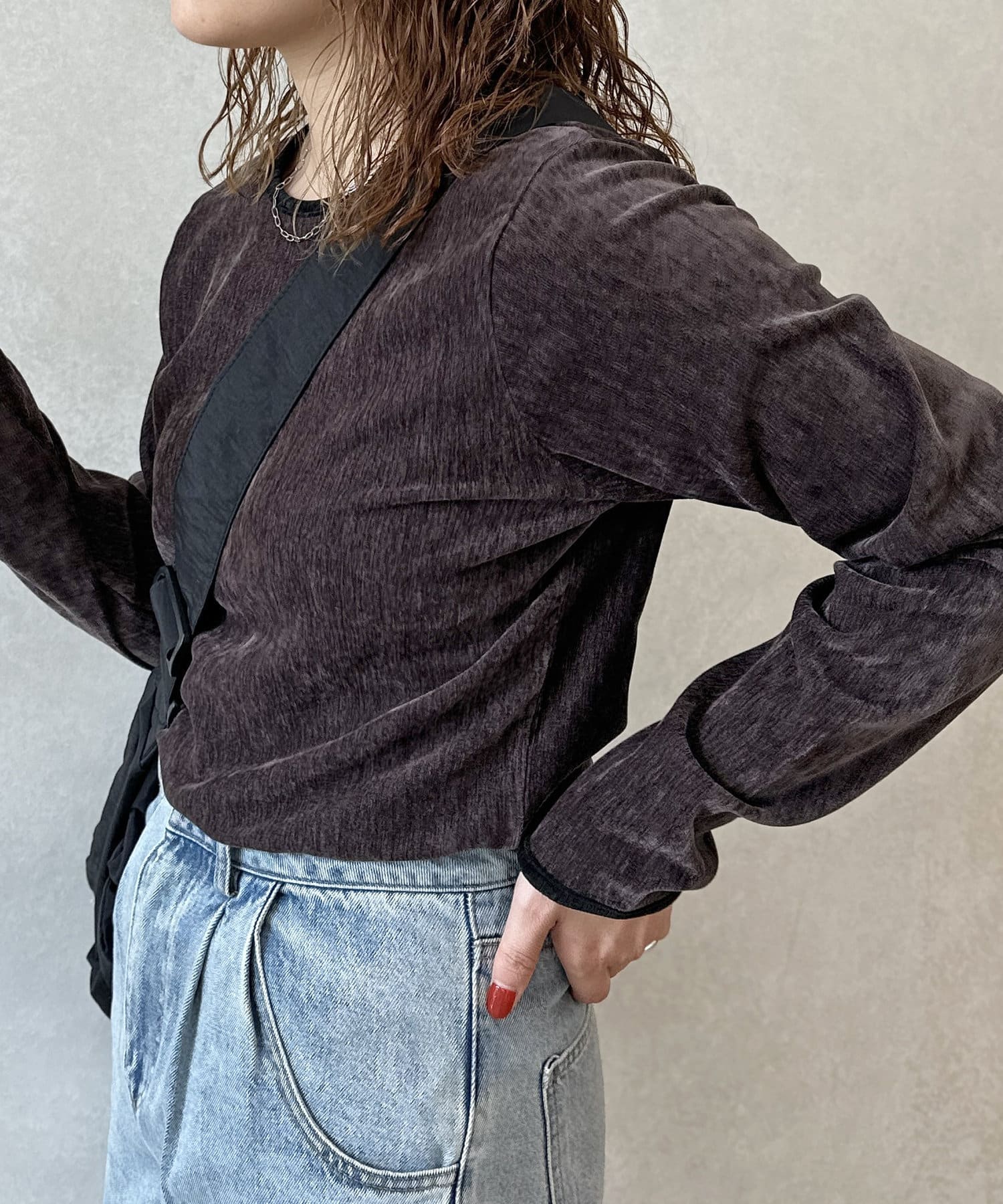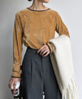 ヴィンテージライクな印象のクラッシュベロアを採用したデザイントップス。