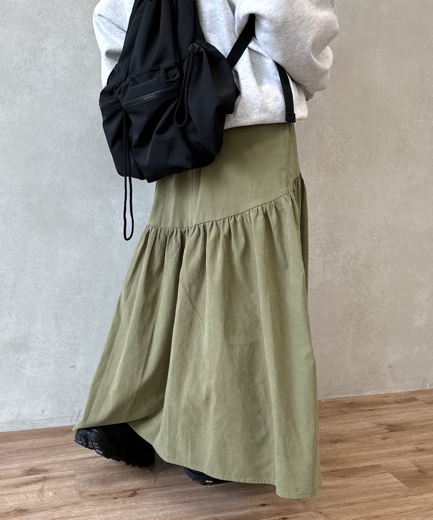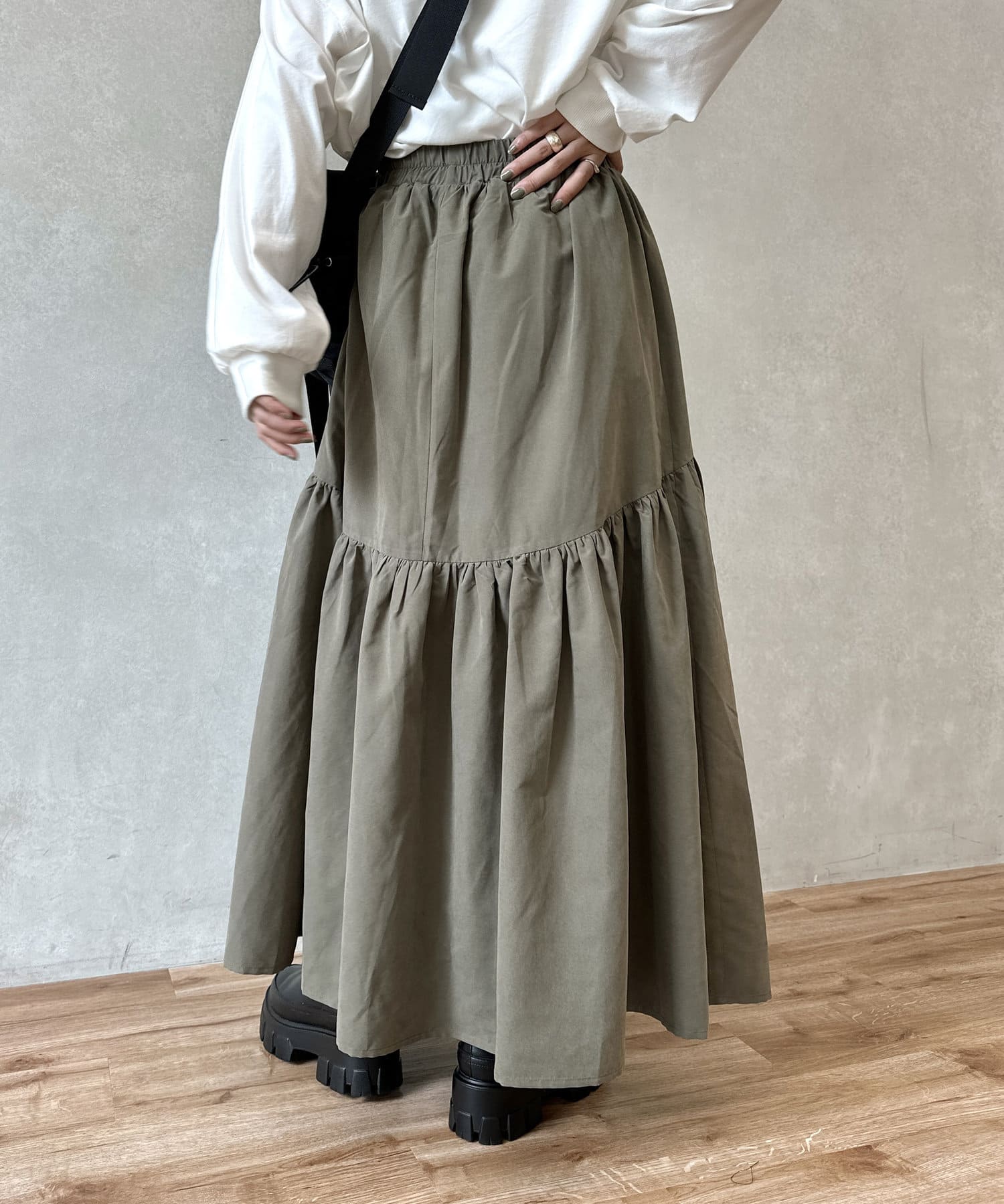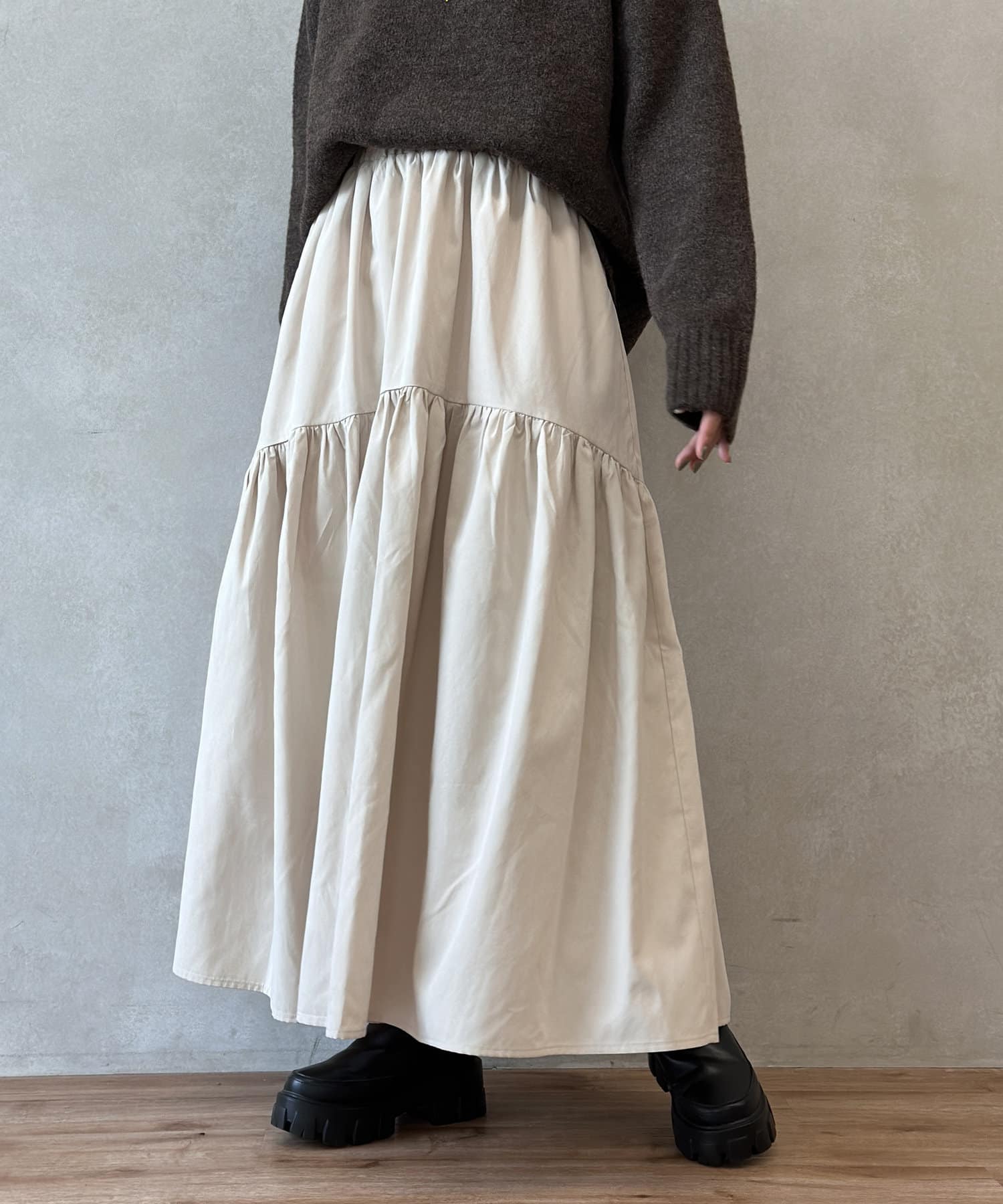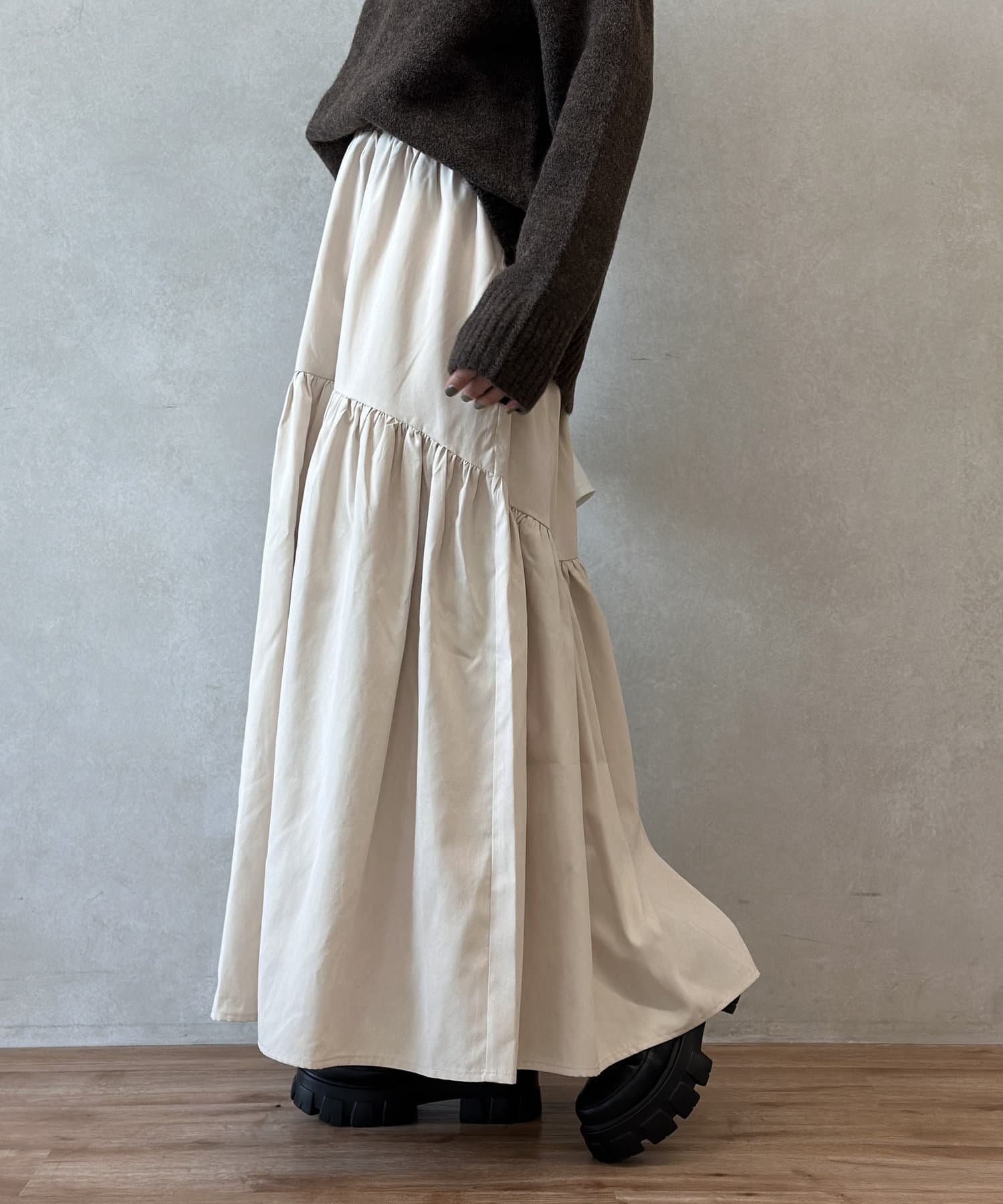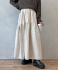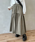 クシュっとしたギャザー寄せがポイントのロングスカート。