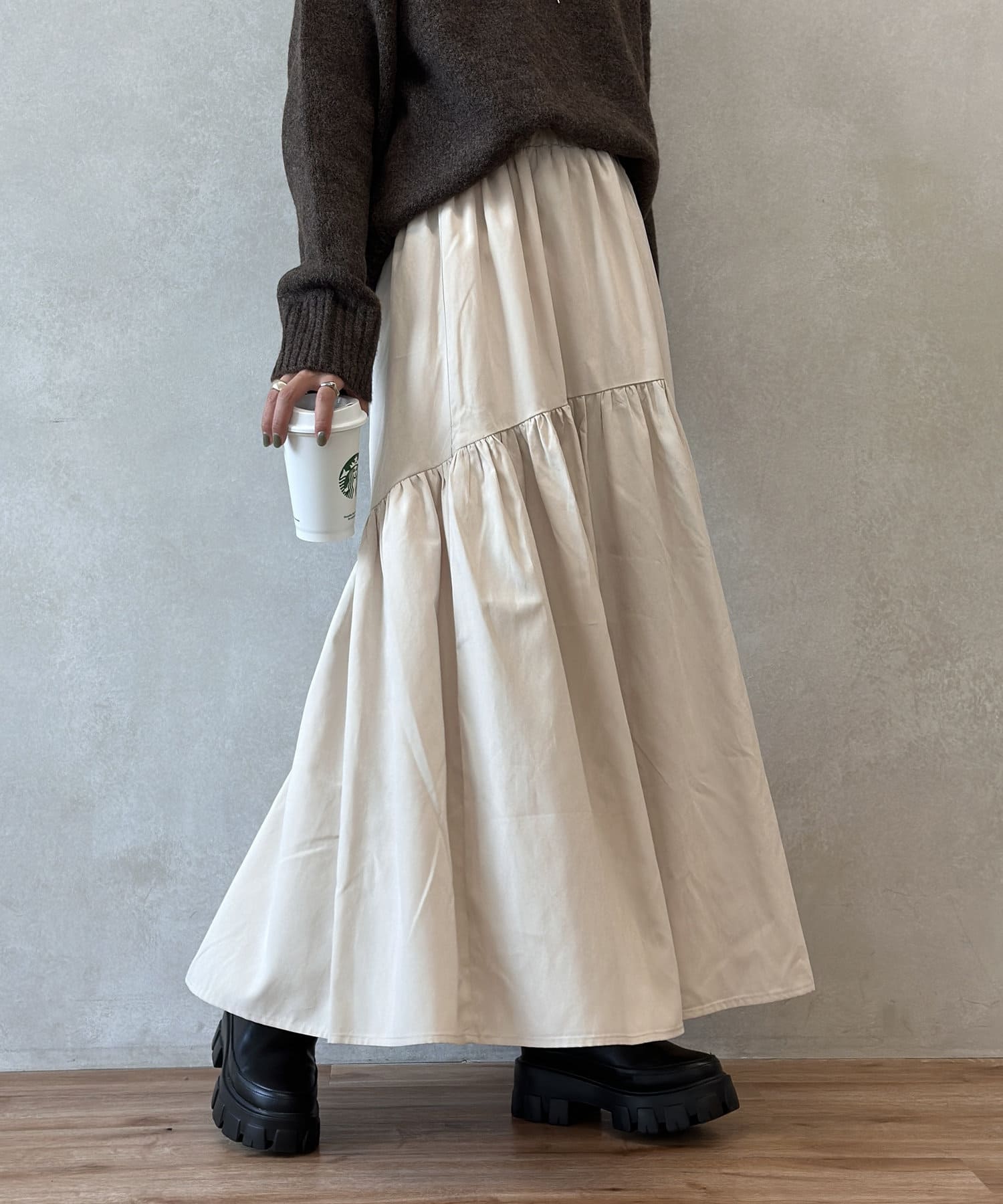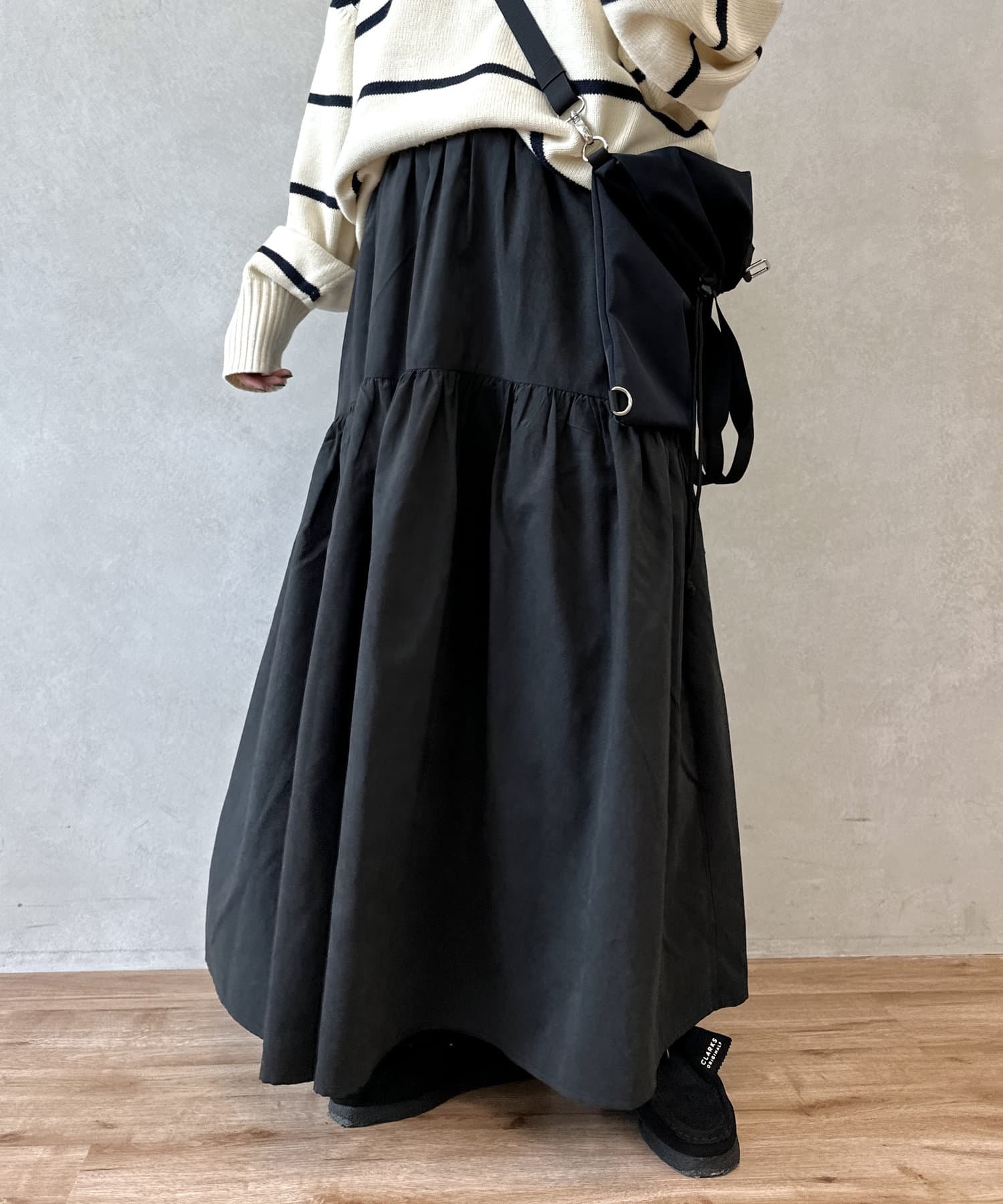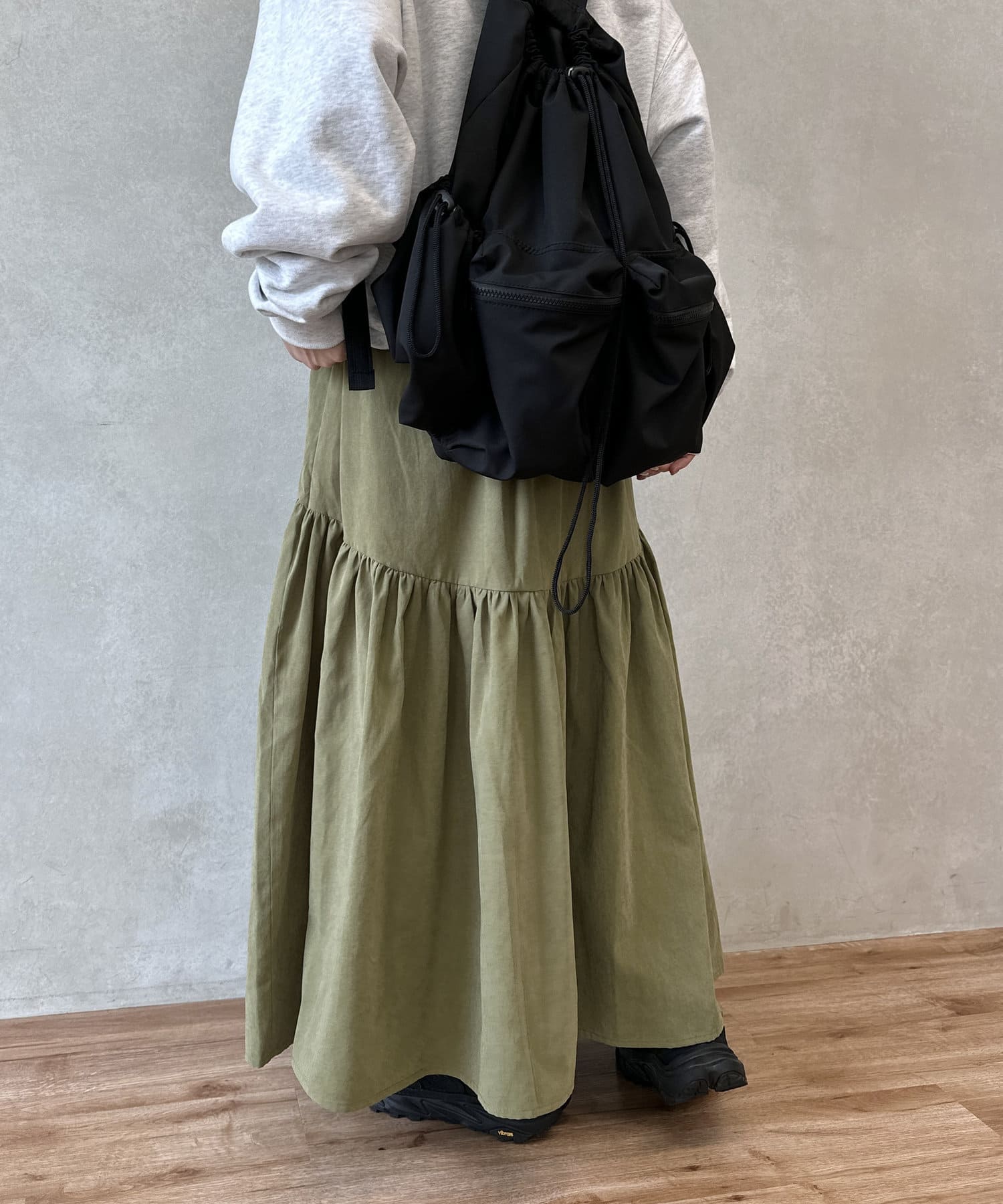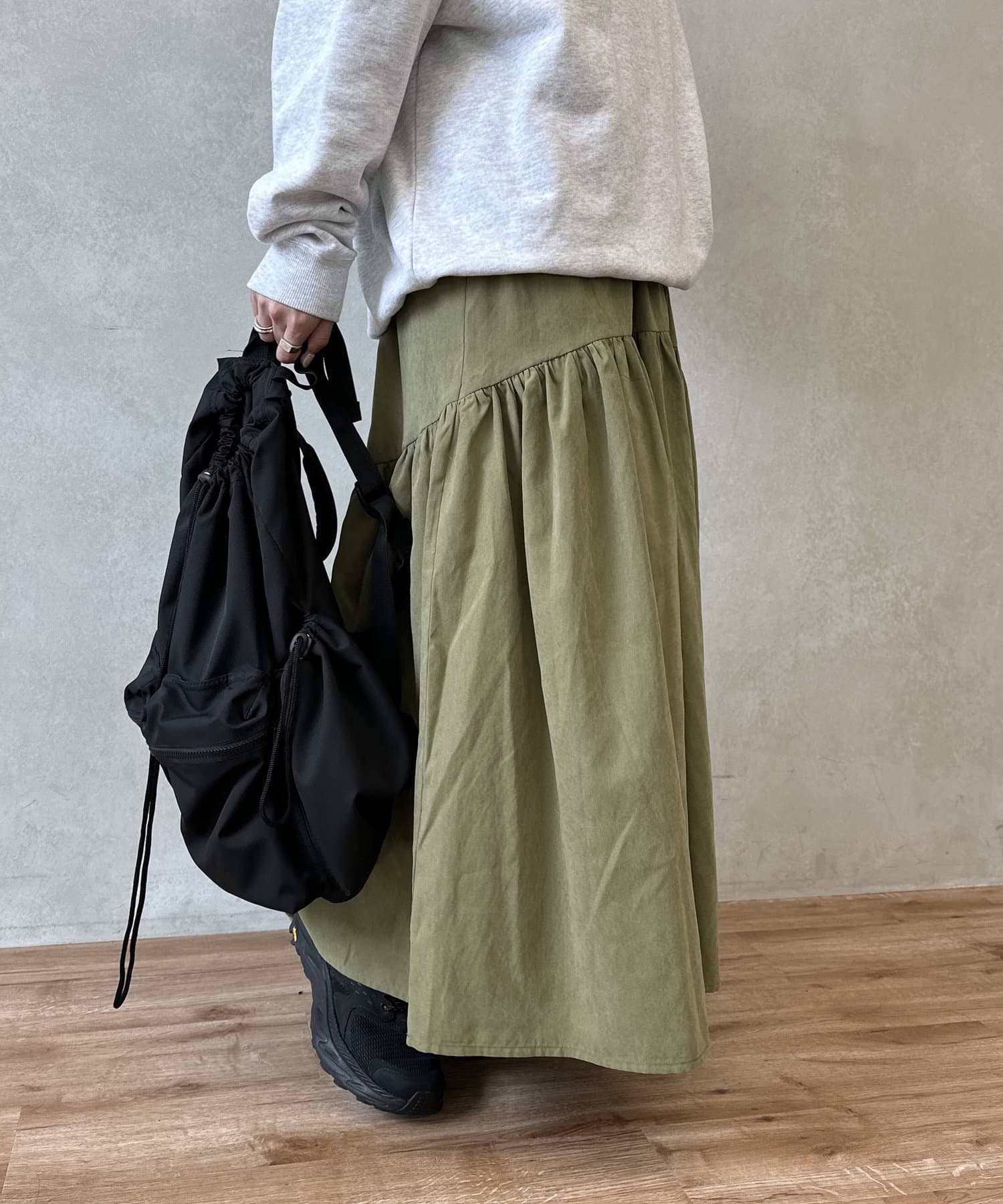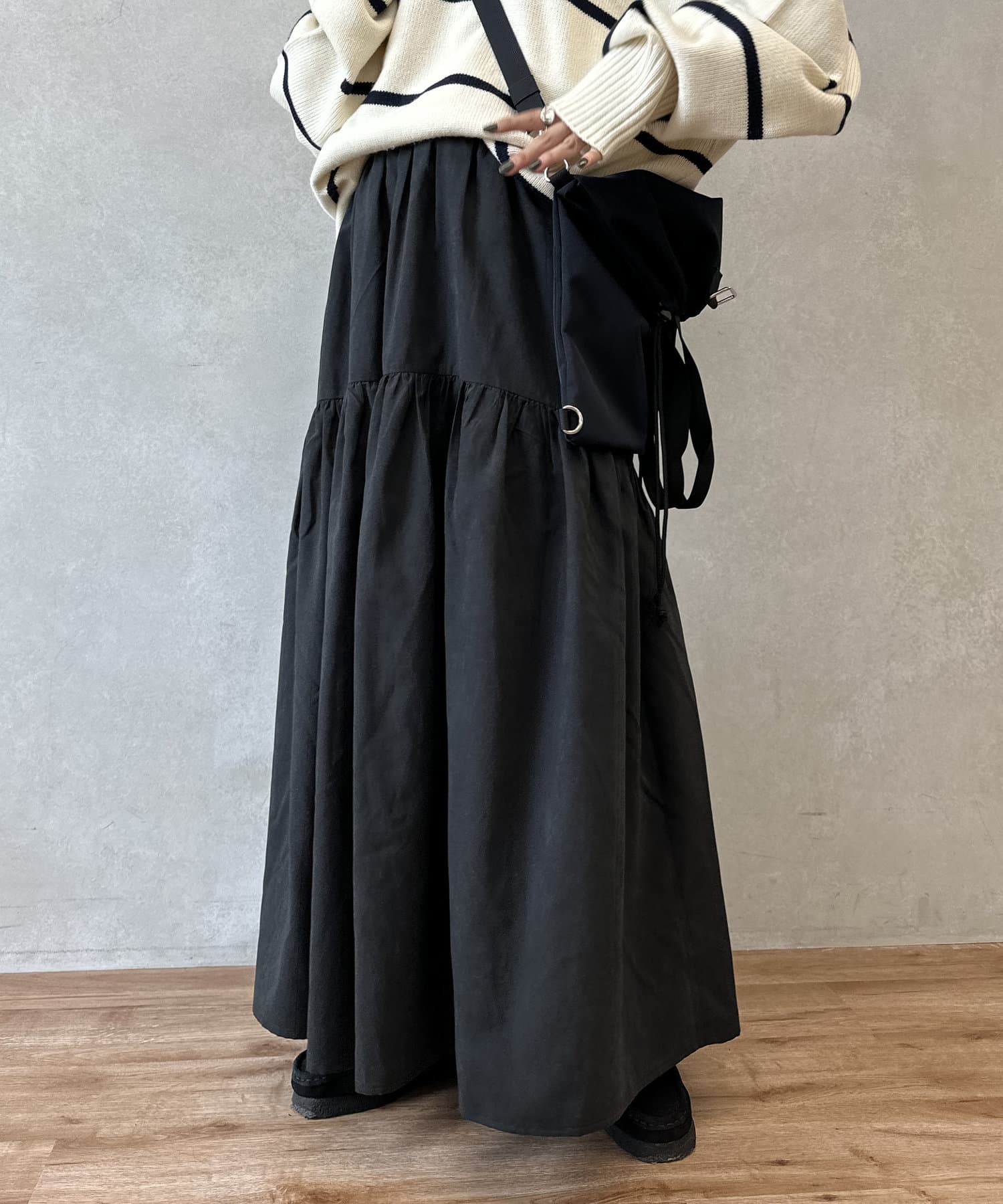 クシュっとしたギャザー寄せがポイントのロングスカート。