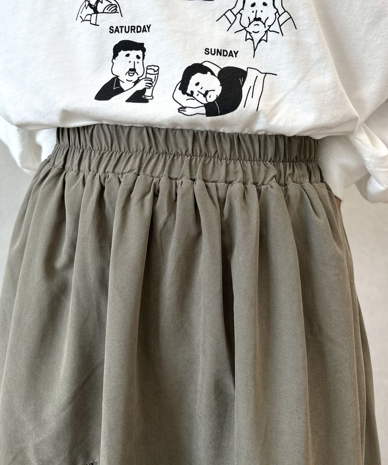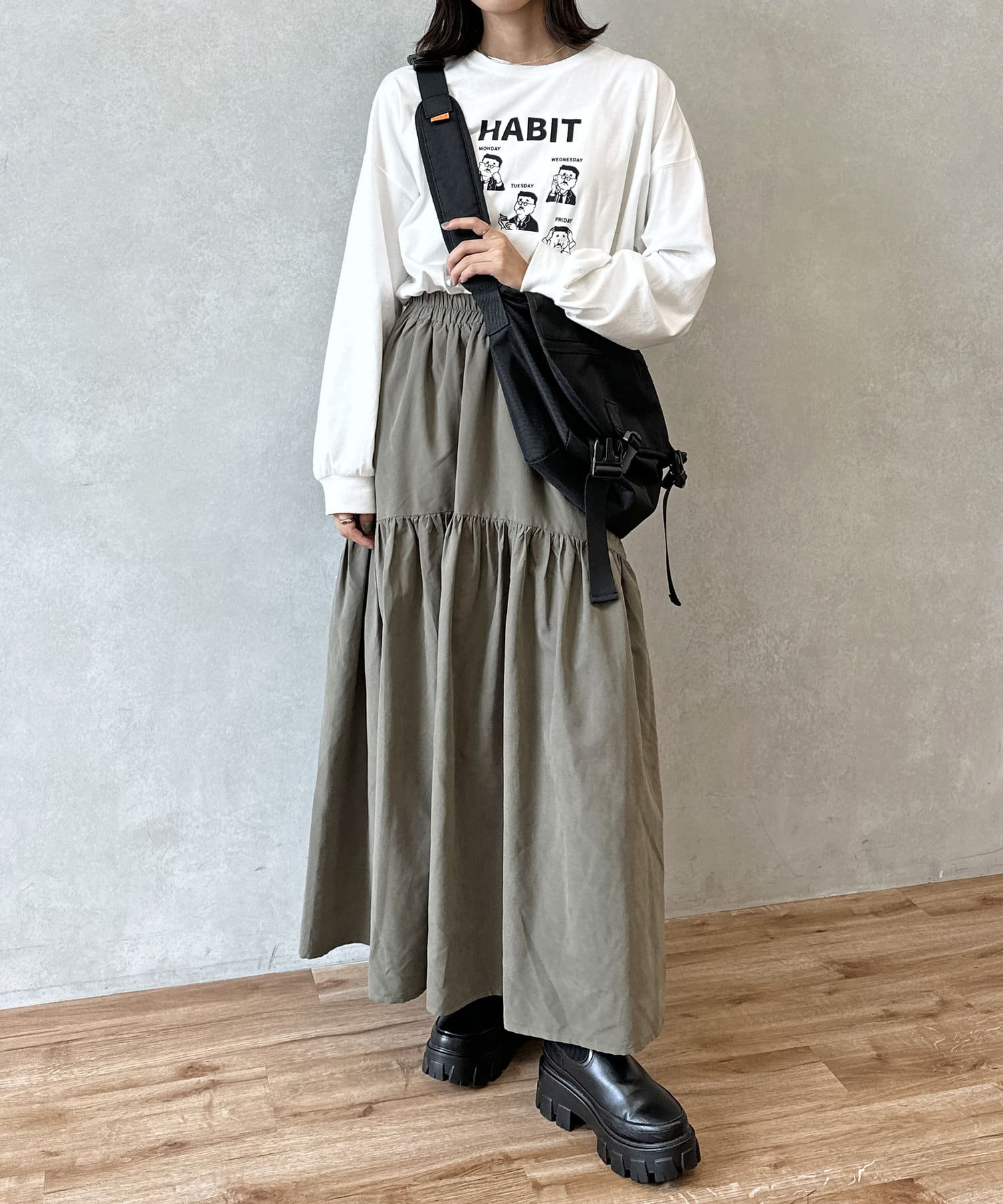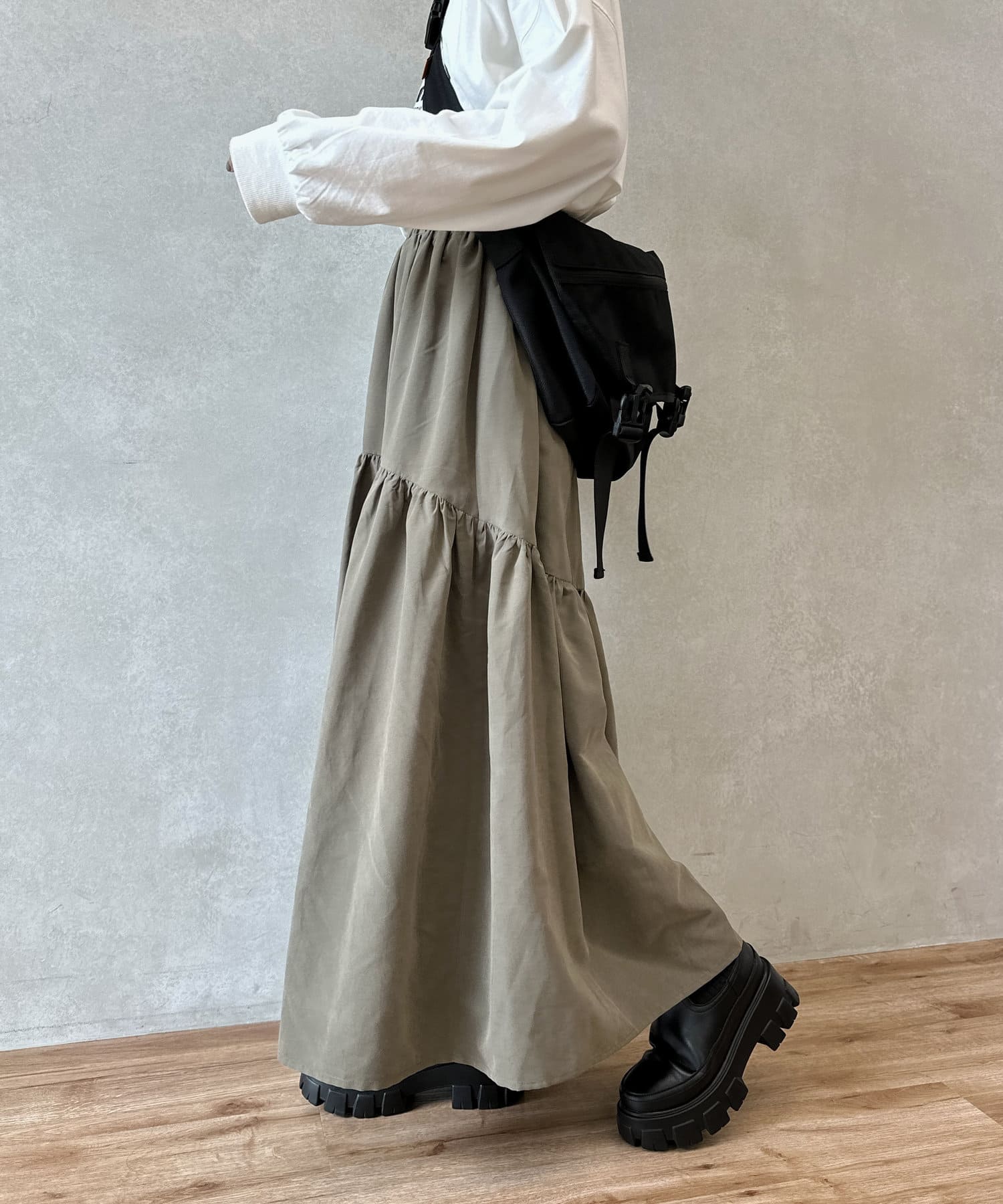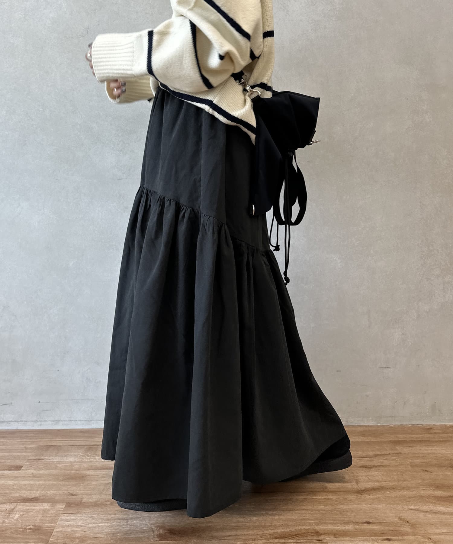 クシュっとしたギャザー寄せがポイントのロングスカート。