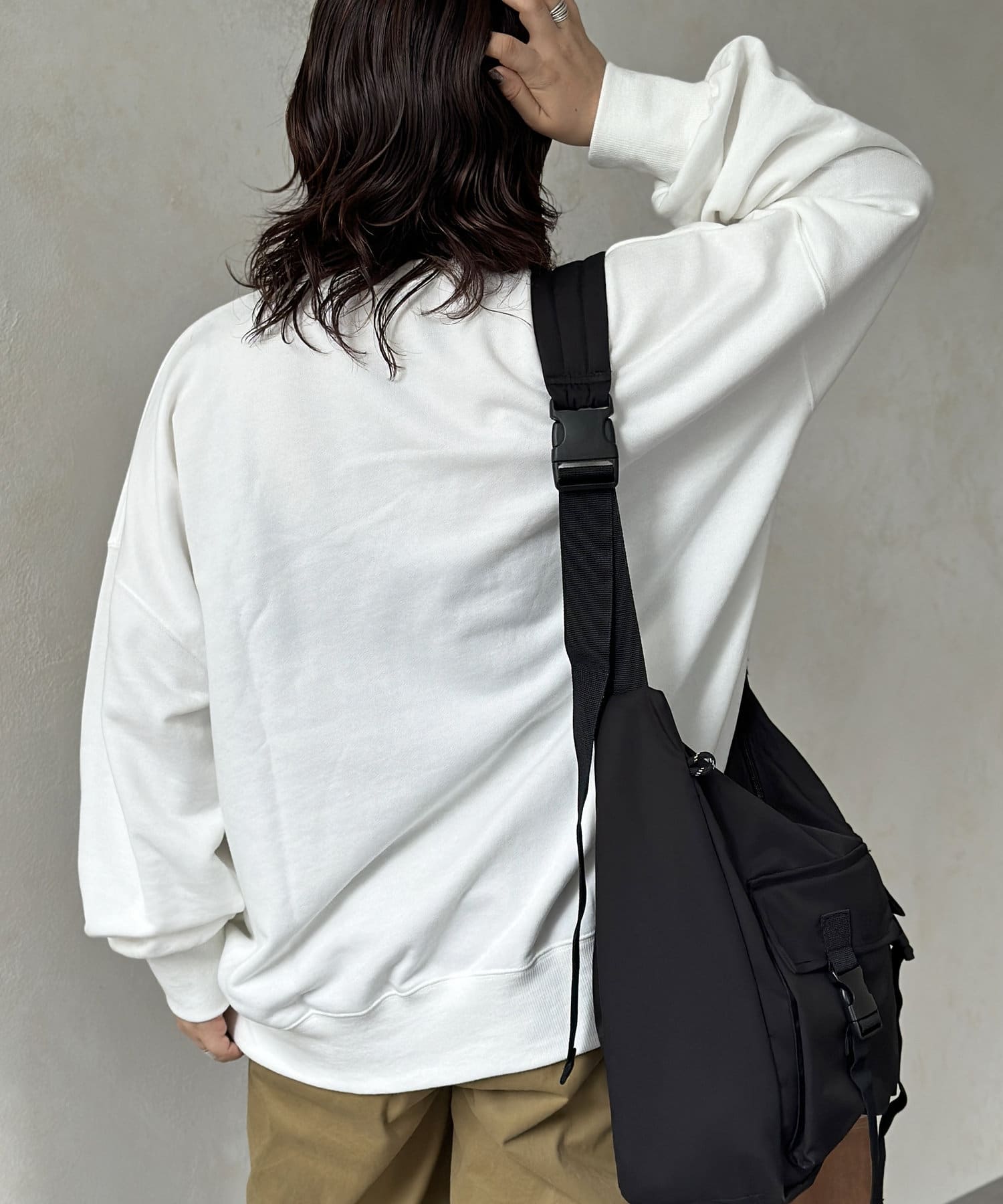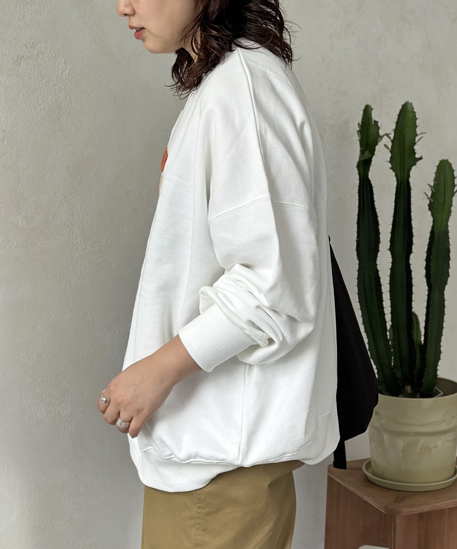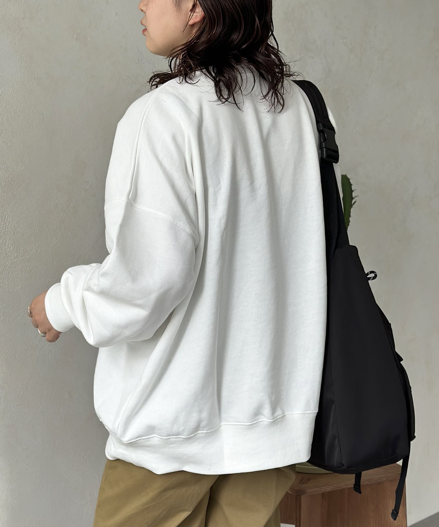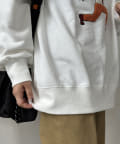 ゆったりとしたビッグシルエットなスウェットはボトムを選ばず、デニムからスラックスまで幅広い着こなしに活躍します。