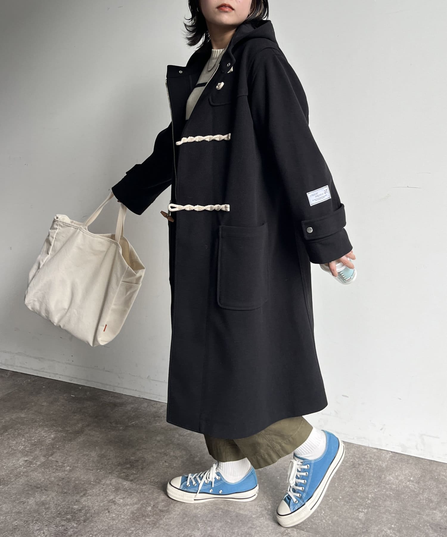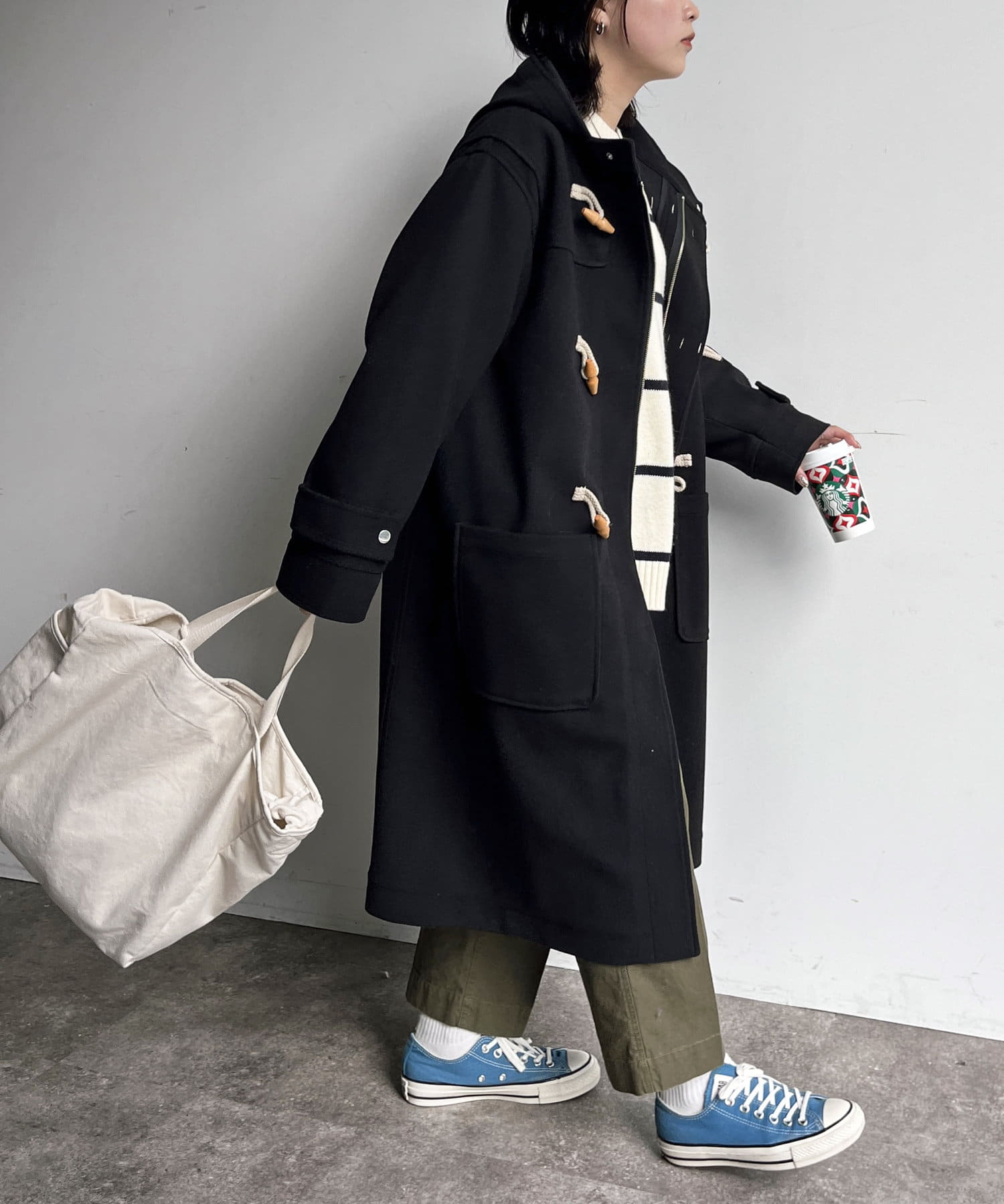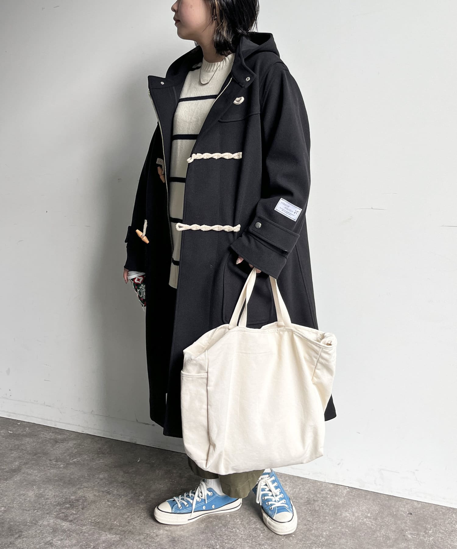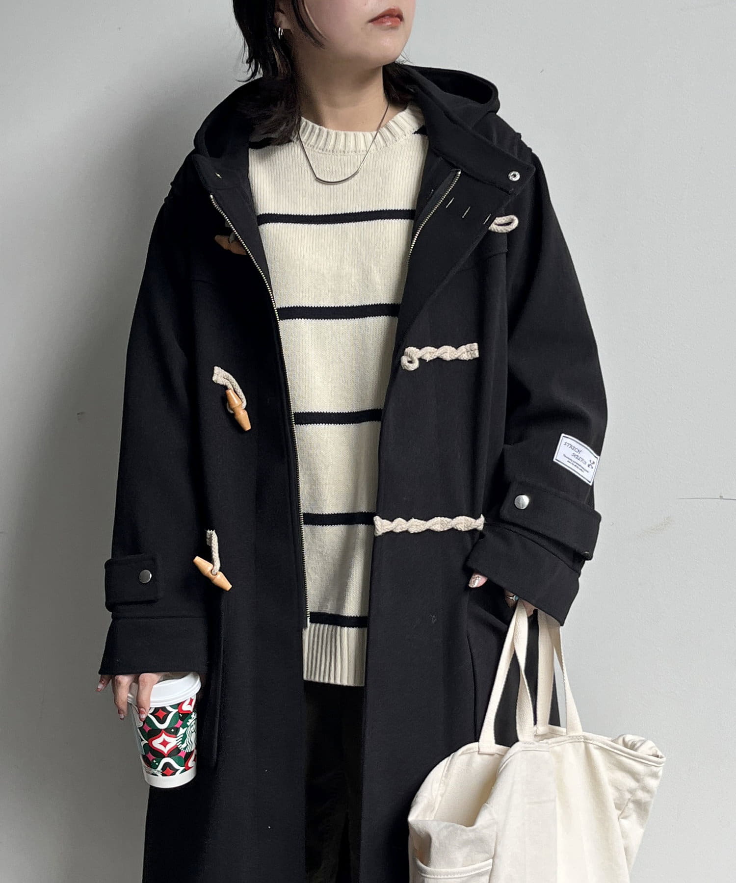 さまざまなアイテムとの相性抜群なダッフルコートですが、軽量なのでインナーを選ばずに着用できます。