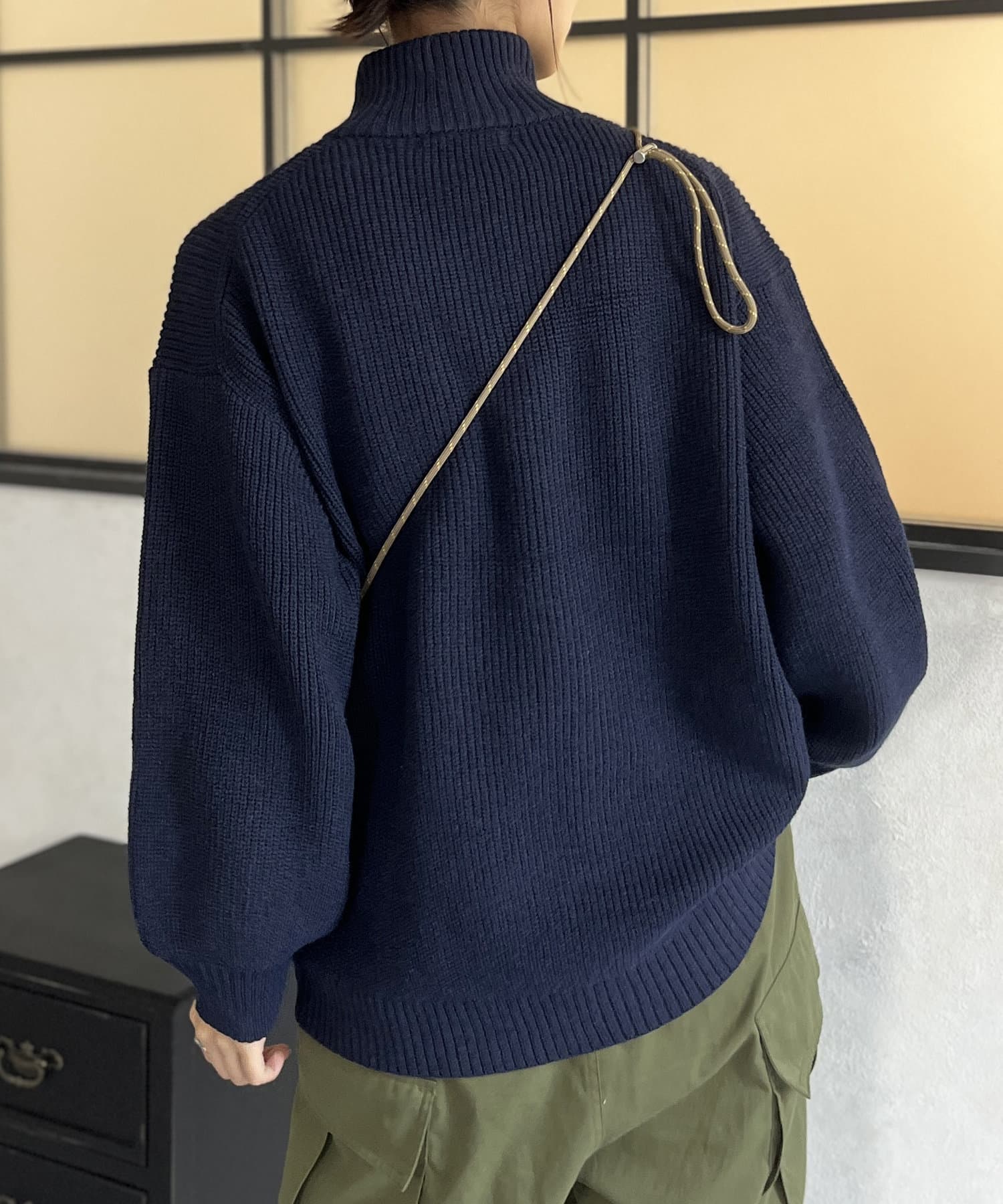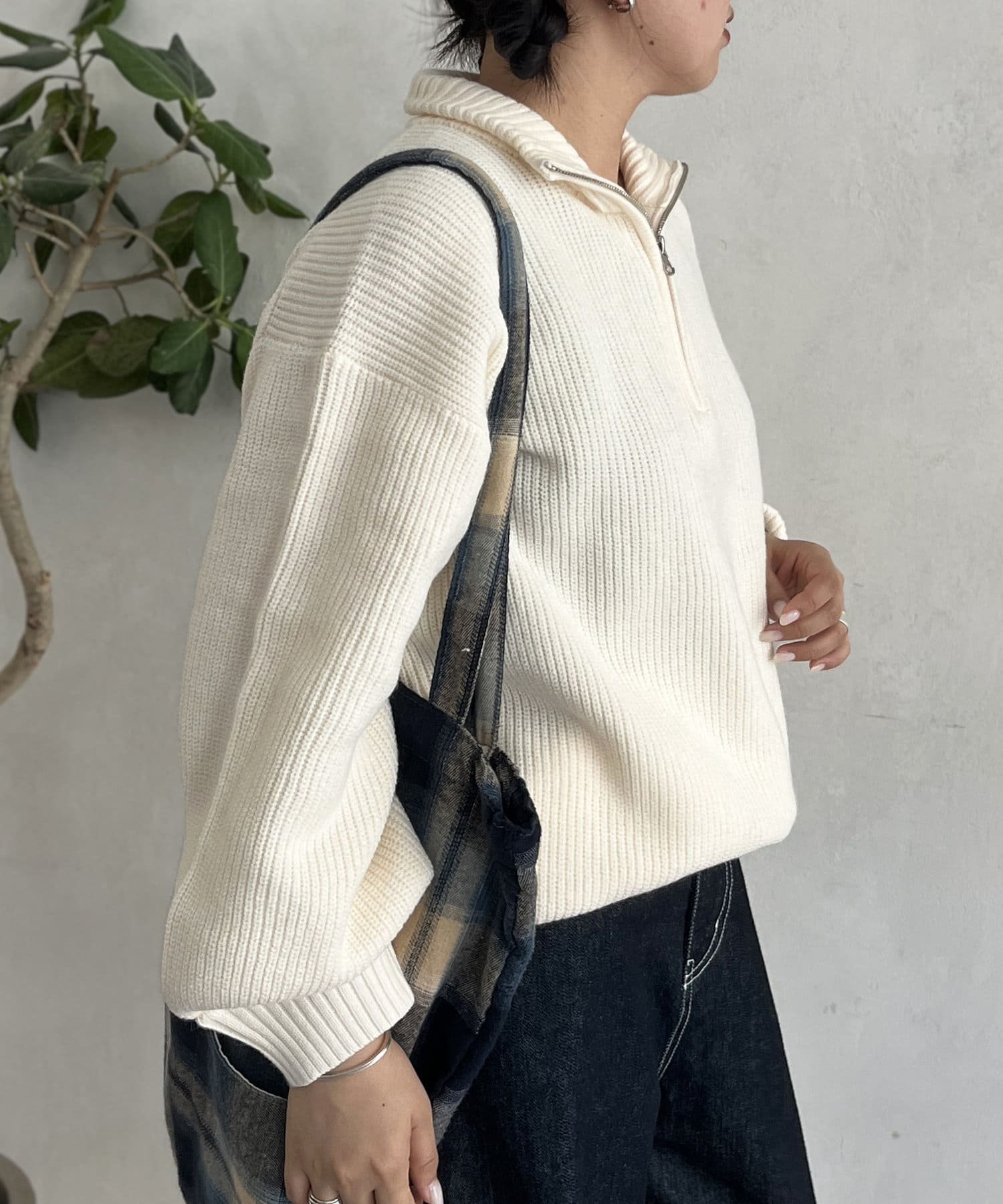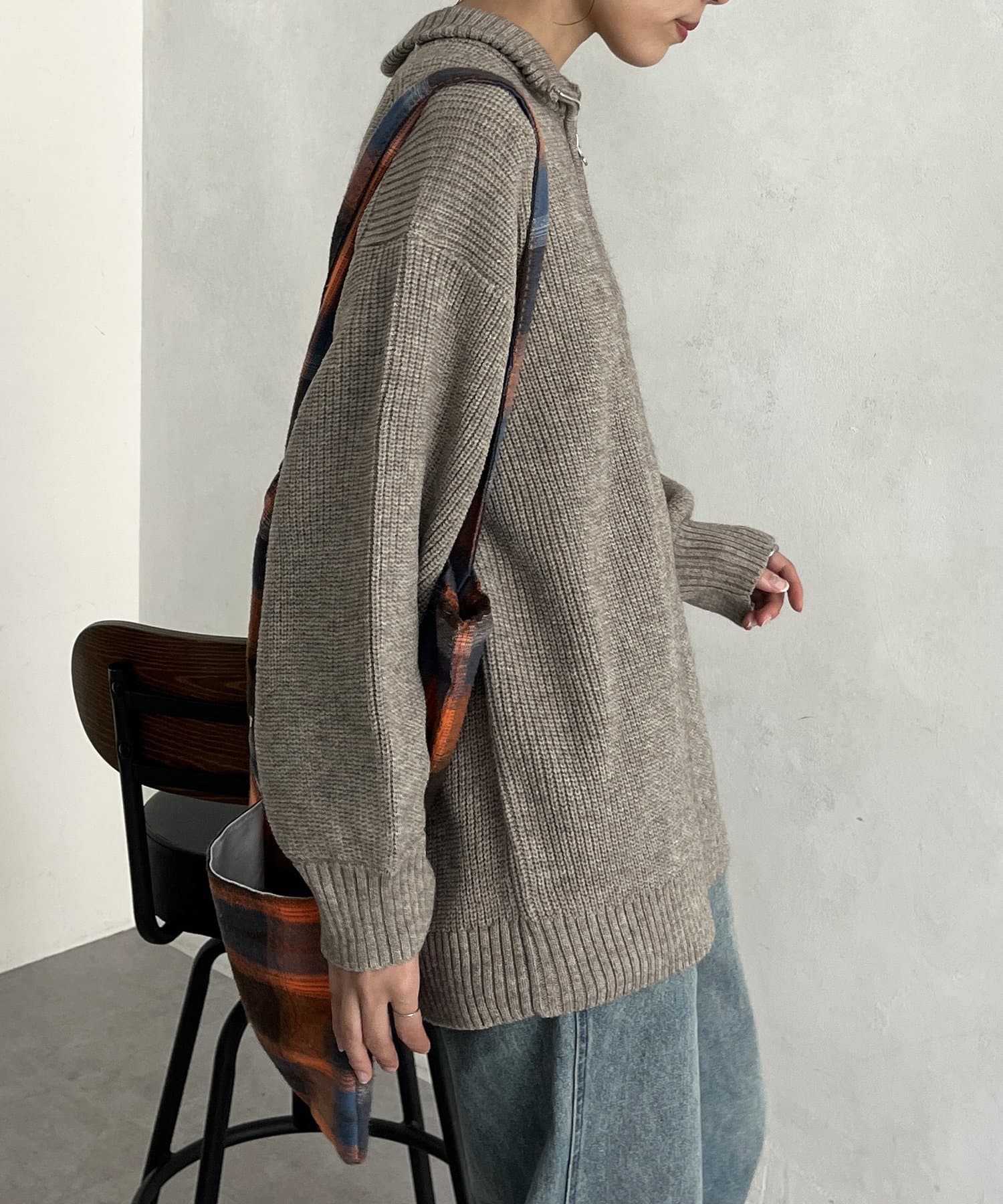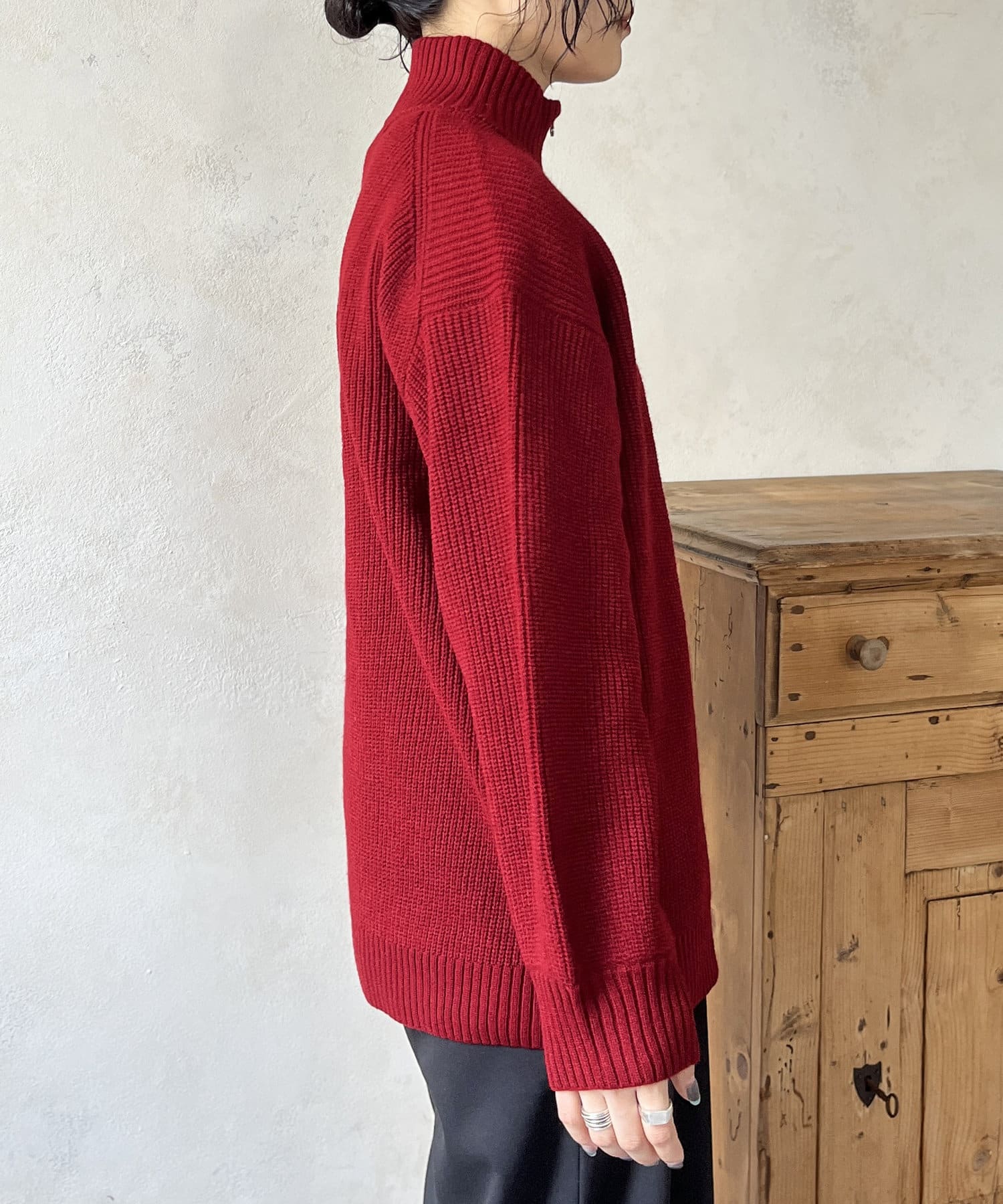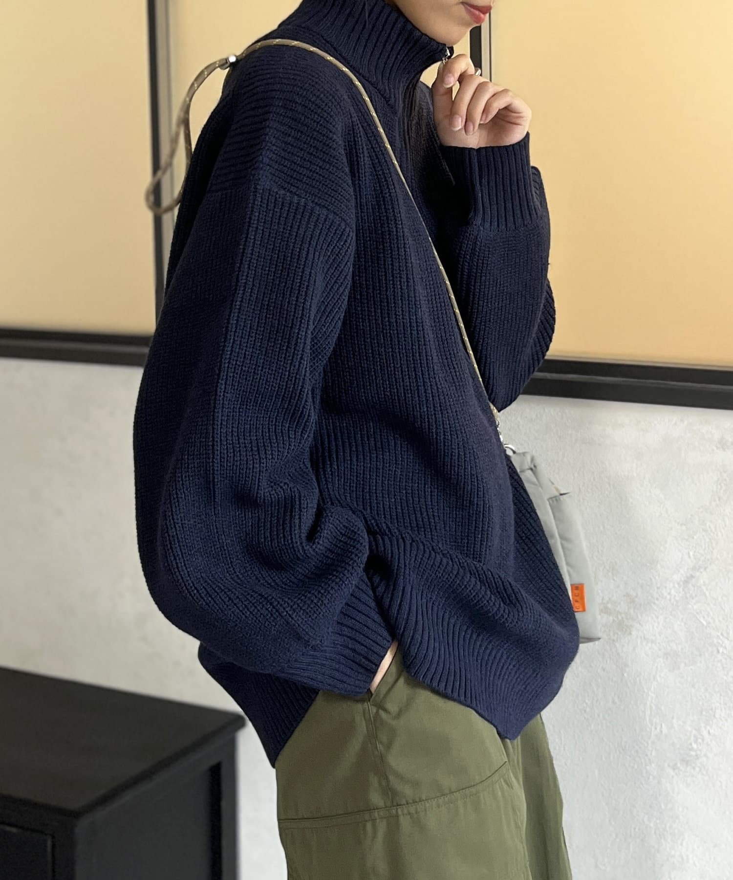 ハーフジップデザインにより多彩なスタイルを楽しめる畦編みニット