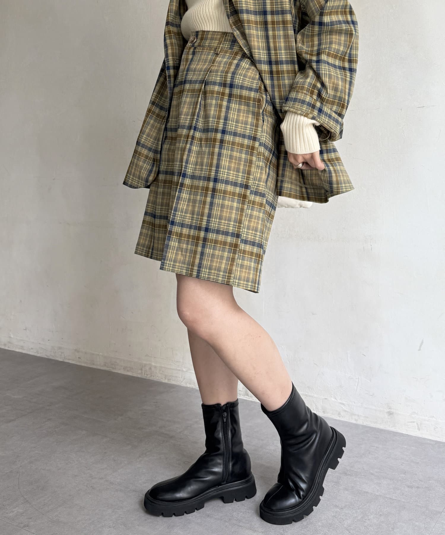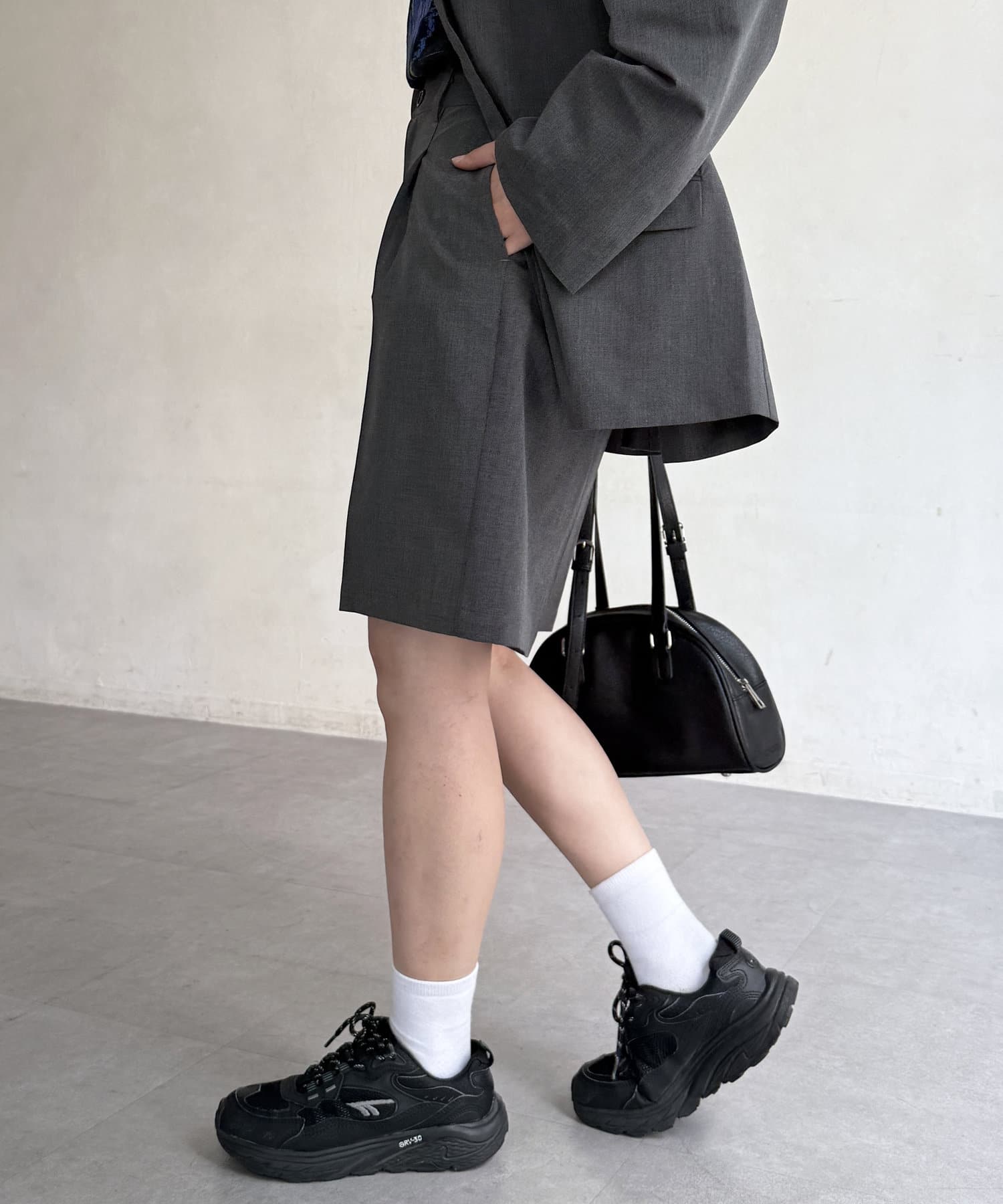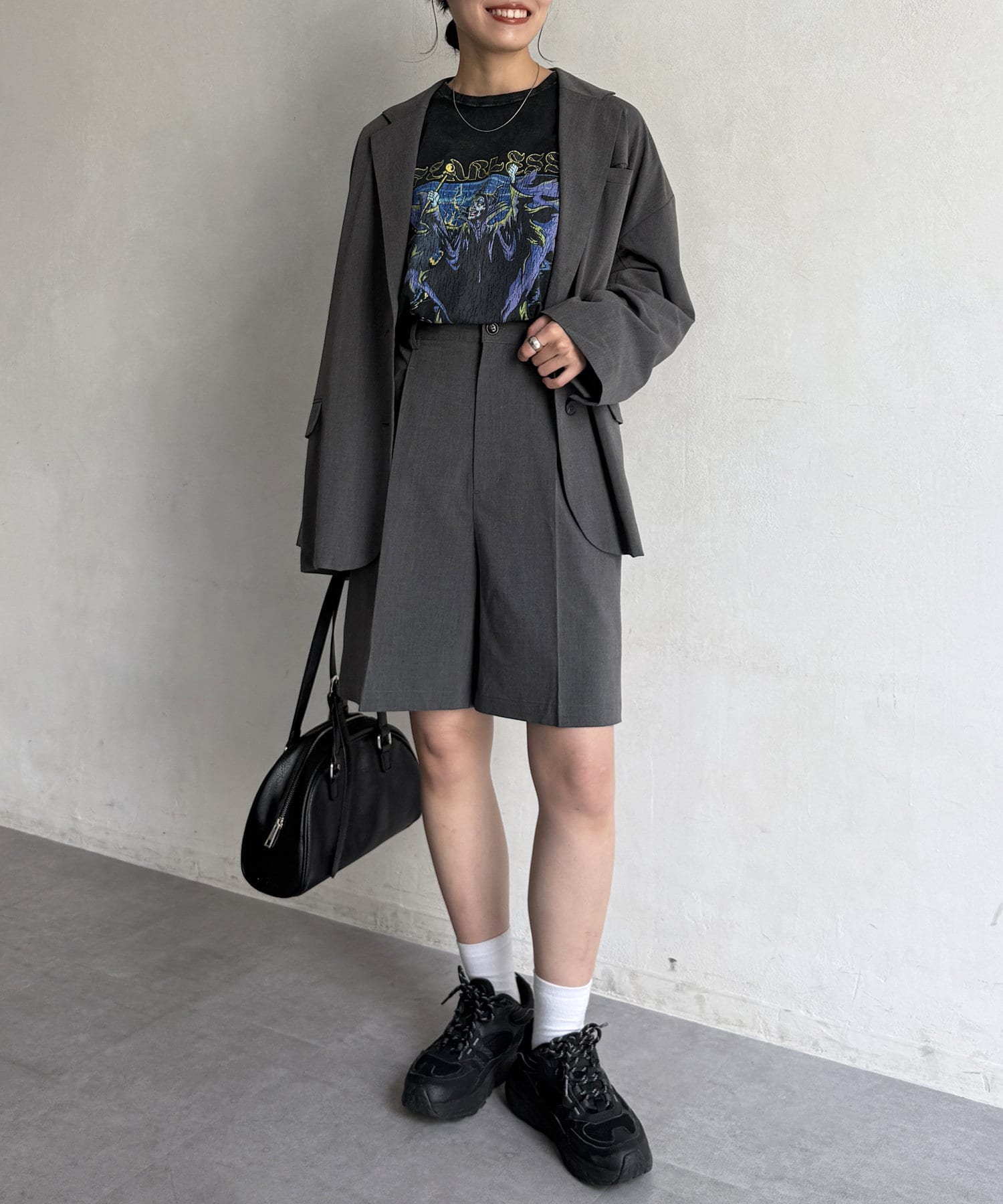 同素材のオーバーサイズテーラードジャケットとのセットアップ着用もおすすめ◎