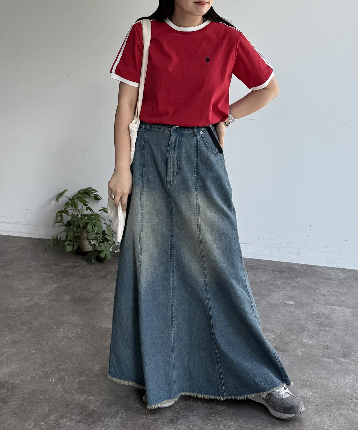 シンプルにデニムと合わせたカジュアルコーデや