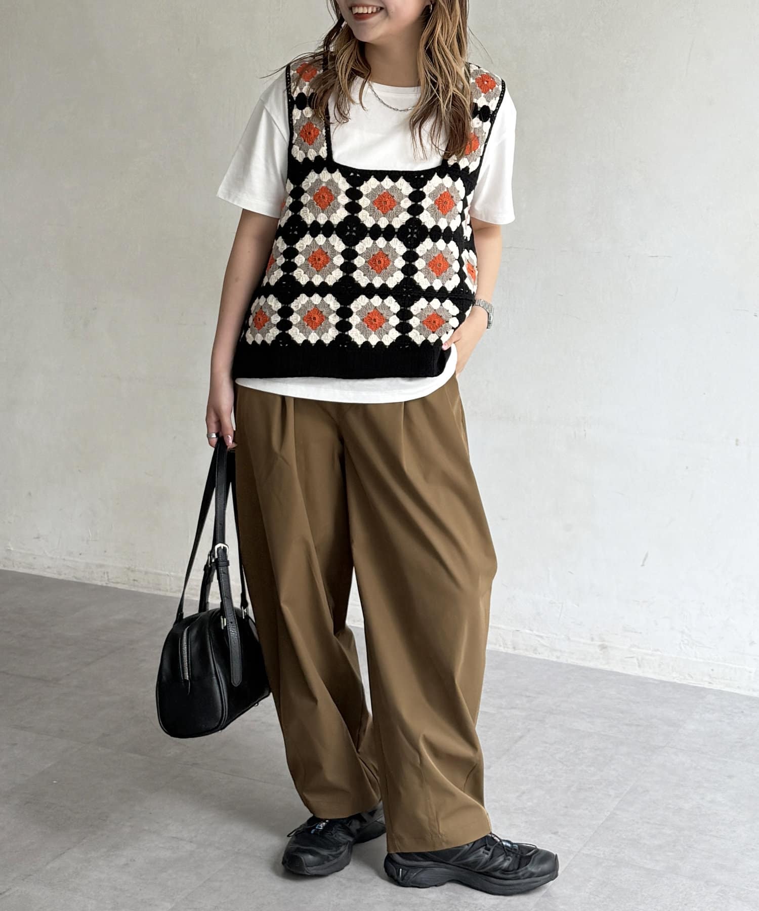 ・花柄メッシュやクロシェベストと合わせたこなれ感あるカジュアルスタイル