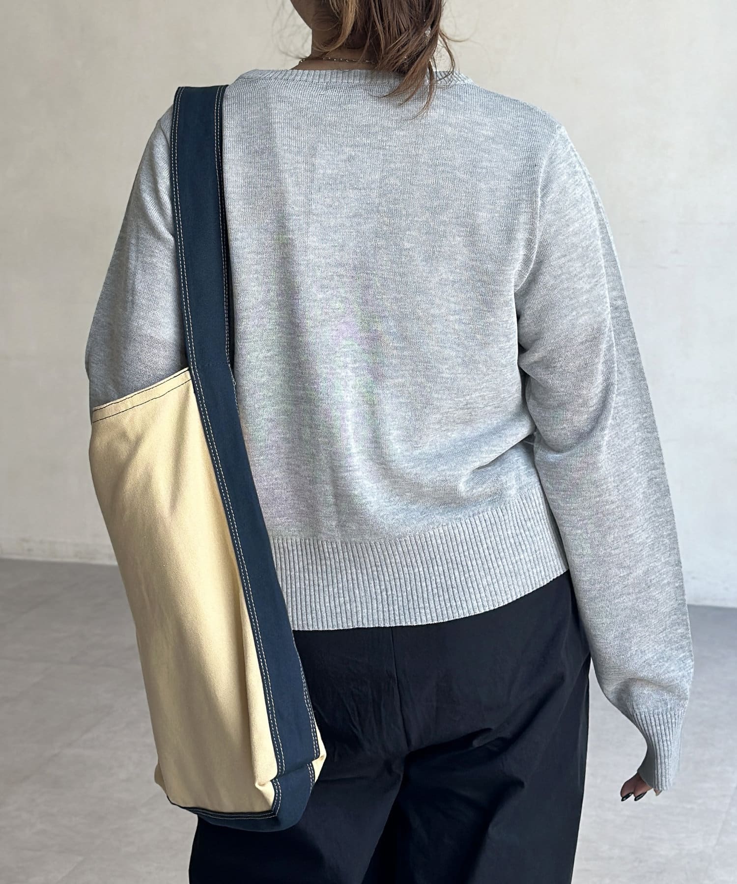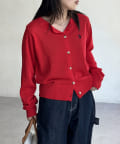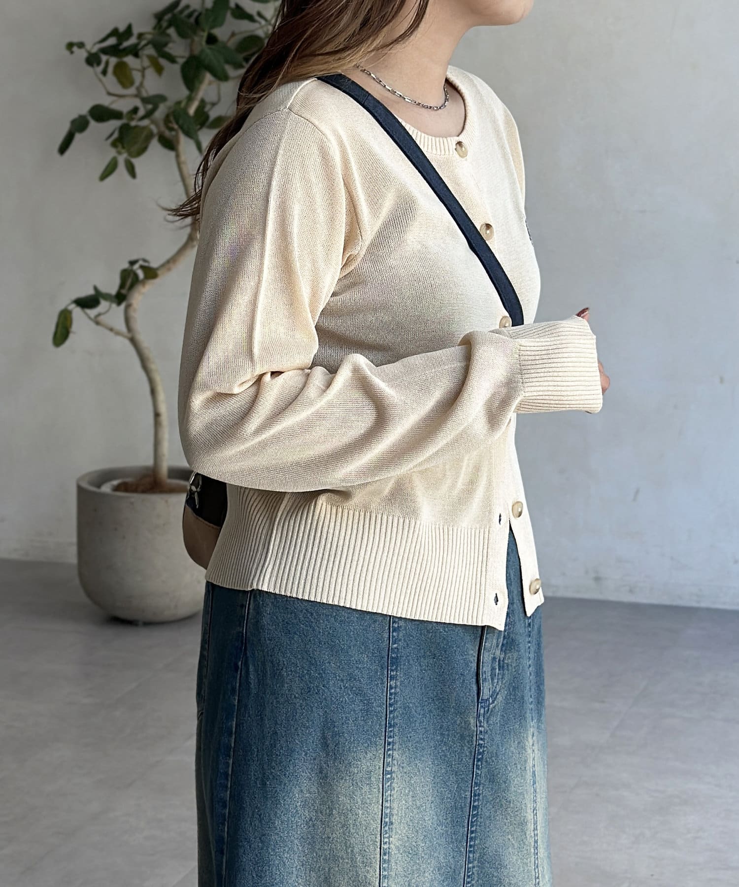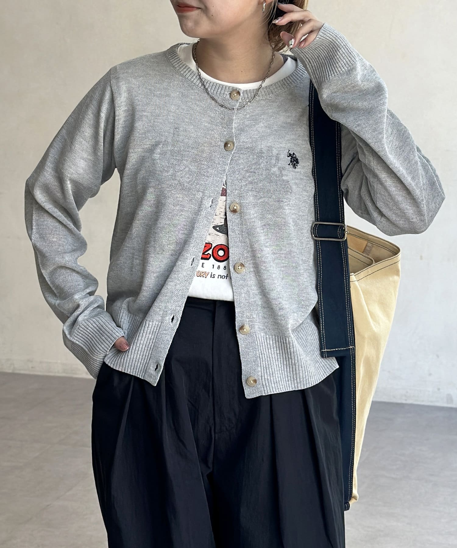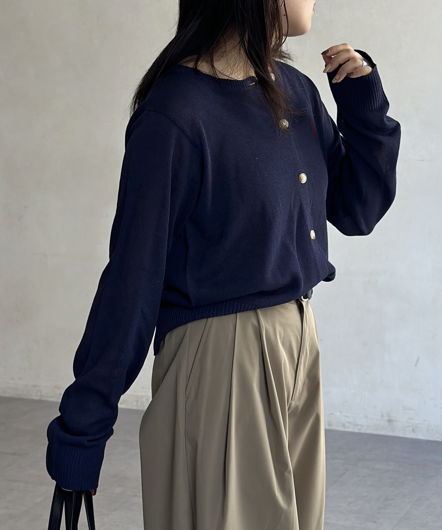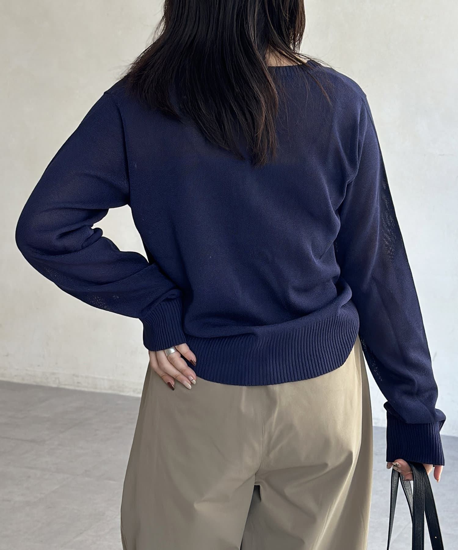 シアー感とさりげないロゴがポイント!これからの時期に重宝するクルーネックカーディガン