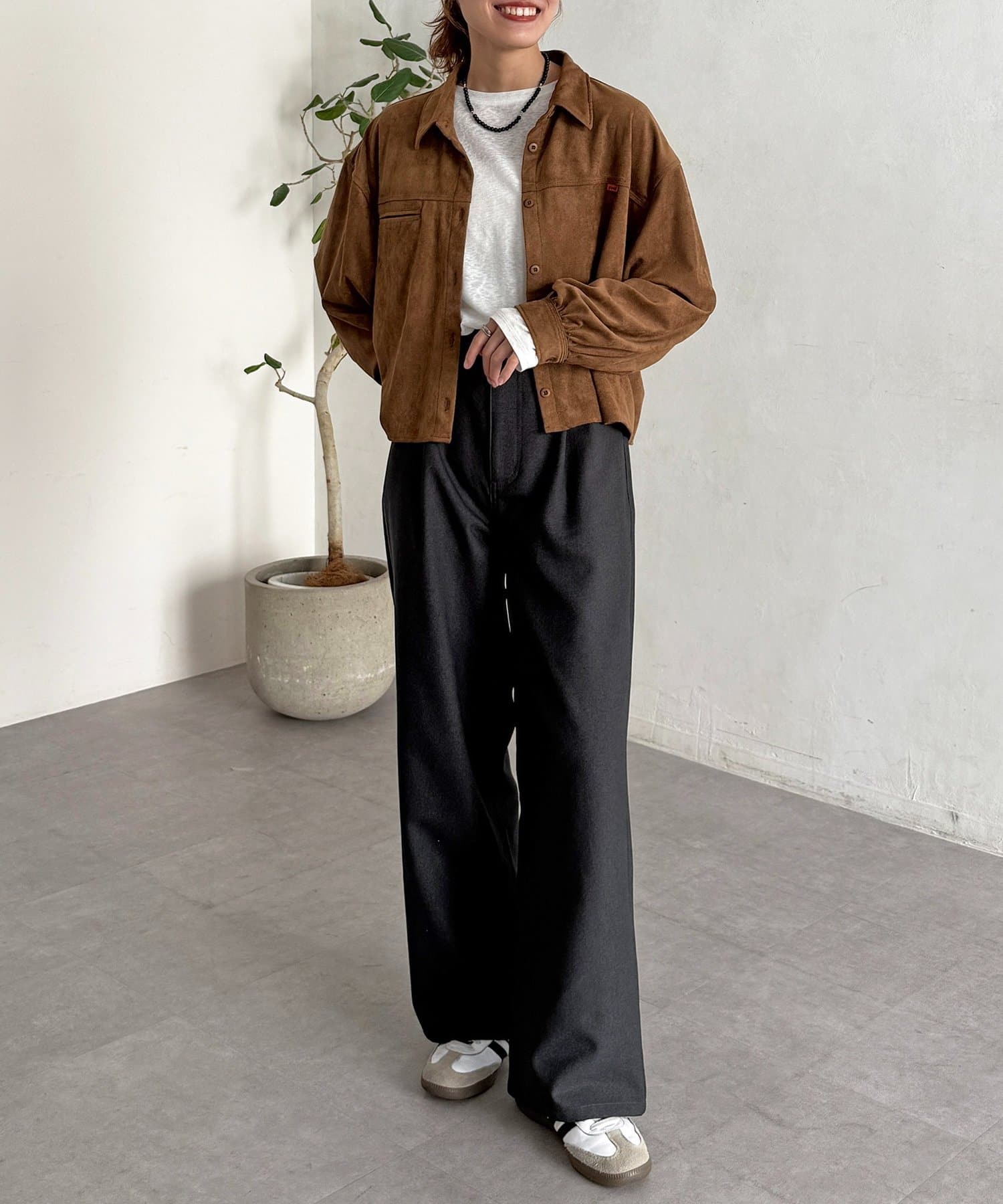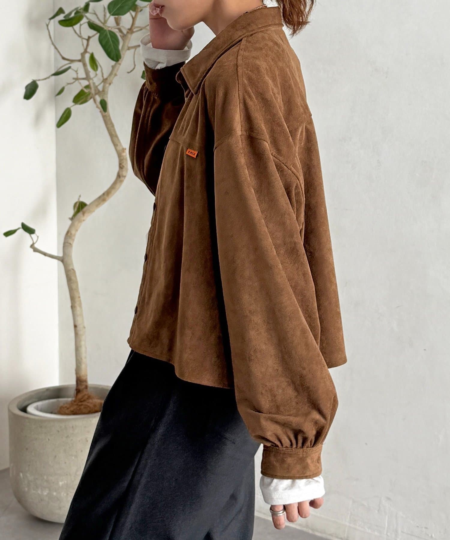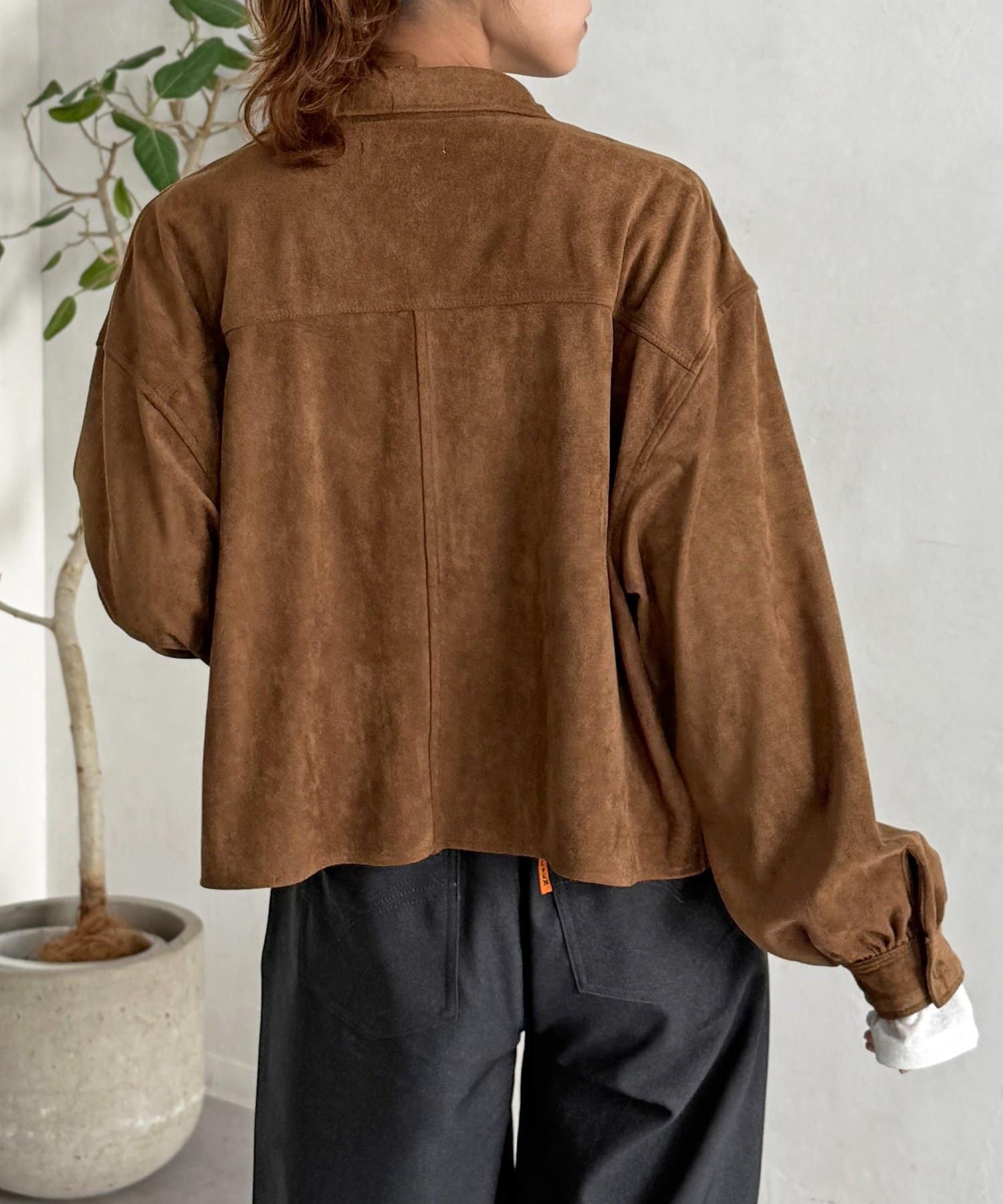 短めの丈感でスタイルアップできる秋冬にぴったりなスエードシャツ!