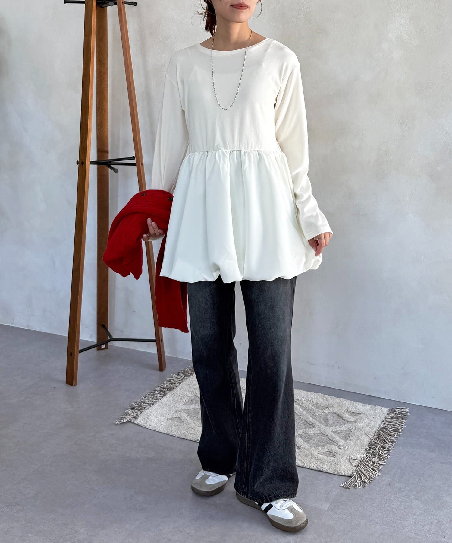 ふんわりと広がるシルエットが、普段のコーデにトレンド感をプラス◎