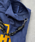 ・オーバーサイズのスウェットにデニムを合わせた定番カジュアルスタイルに、アクセントとしてプラス