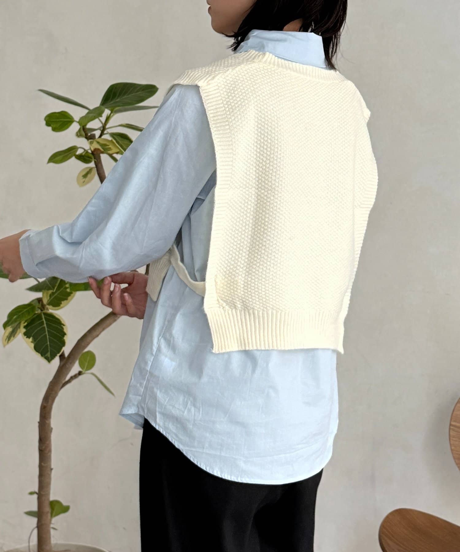 ショート丈のベストがウエスト位置を高く見せ、自然なスタイルアップを叶えます。
