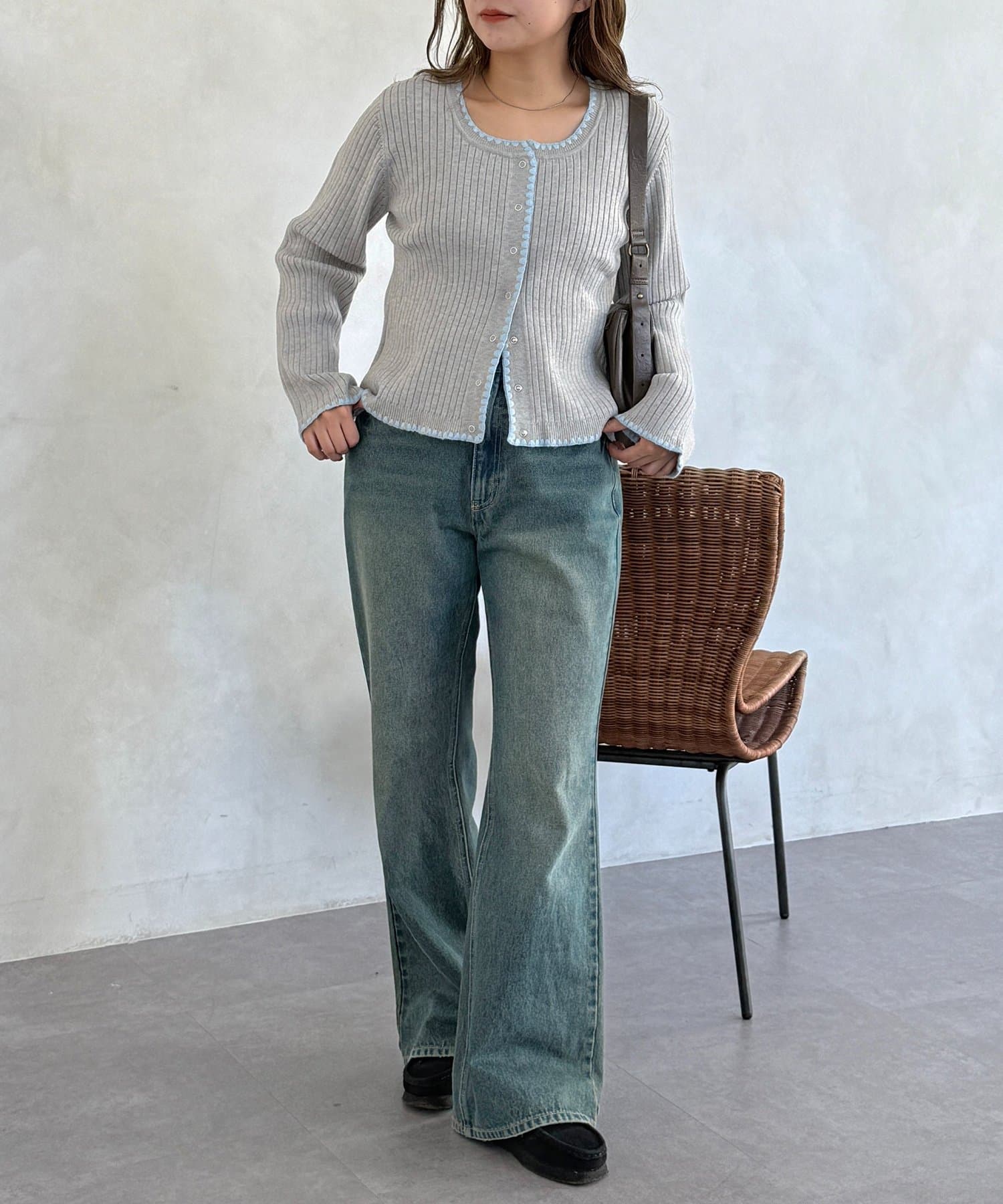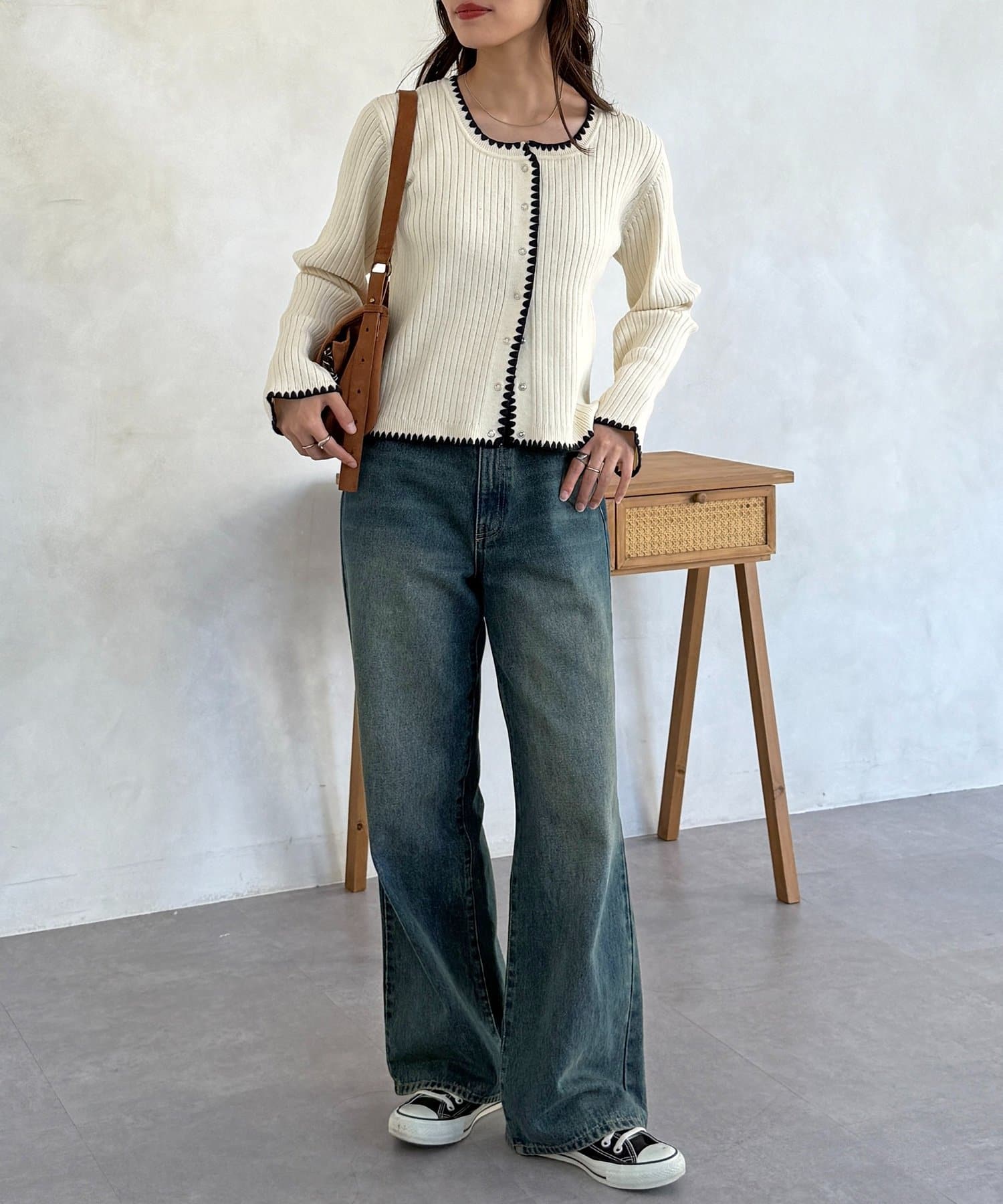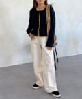 ・デニムパンツと合わせて、大人カジュアルスタイルに。足元はスニーカーで抜け感をプラス