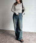 ・デニムと合わせて、こなれ感のある大人カジュアルスタイルに。足元はスニーカーでカジュアルに、ブーツで少し上品にしても◎。