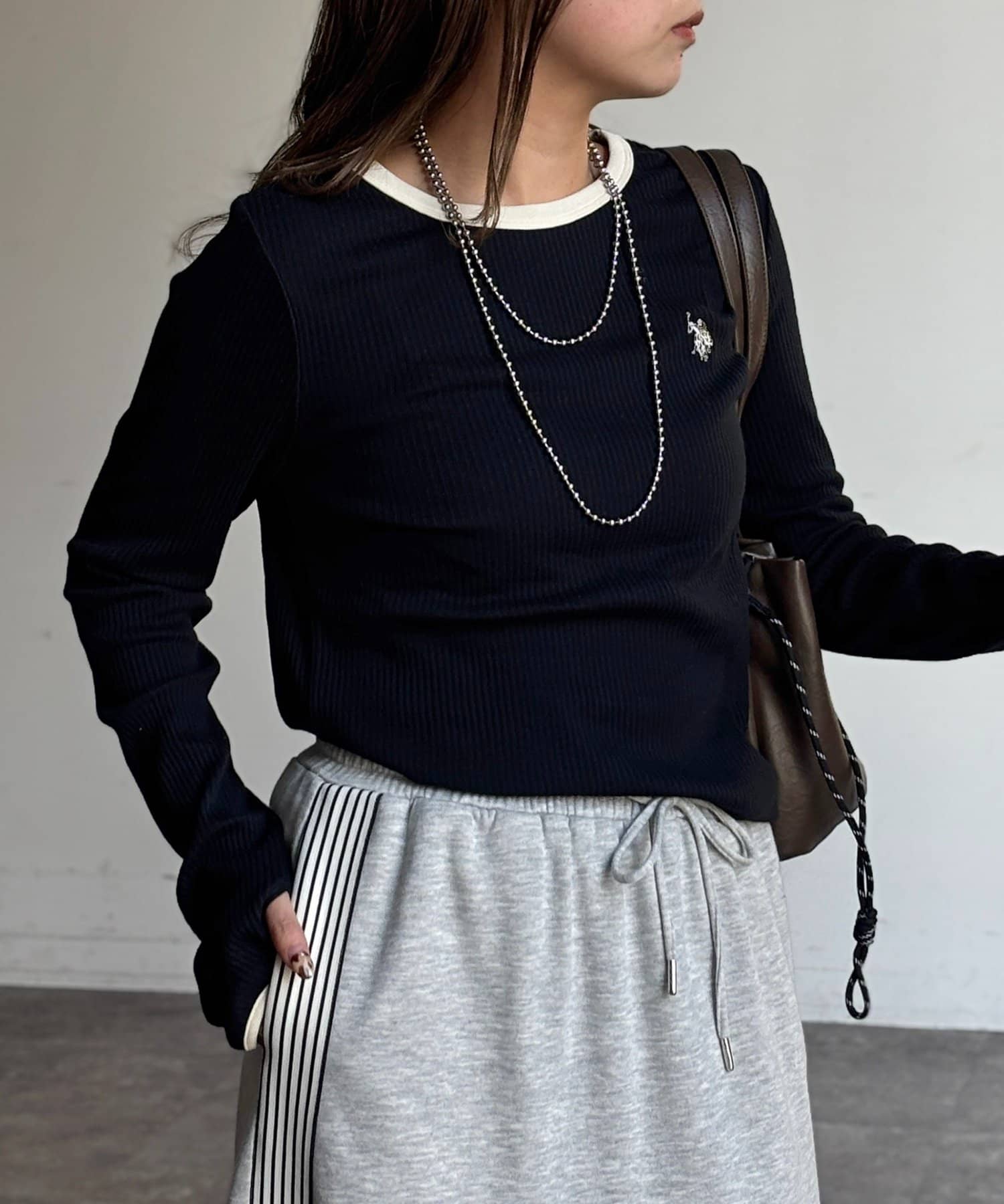 袖口とネックラインの配色がアクセントになり、シンプルながらも洗練された印象に。