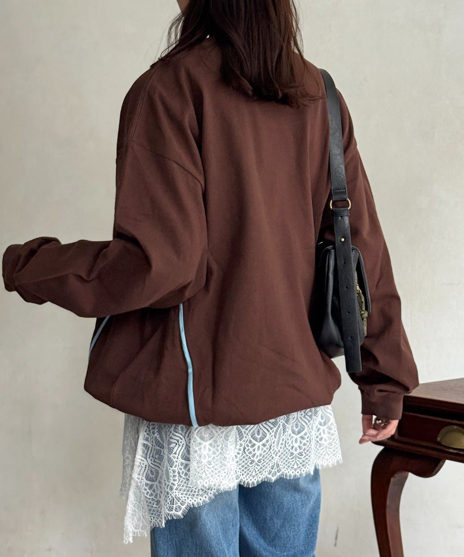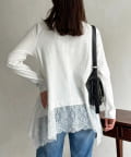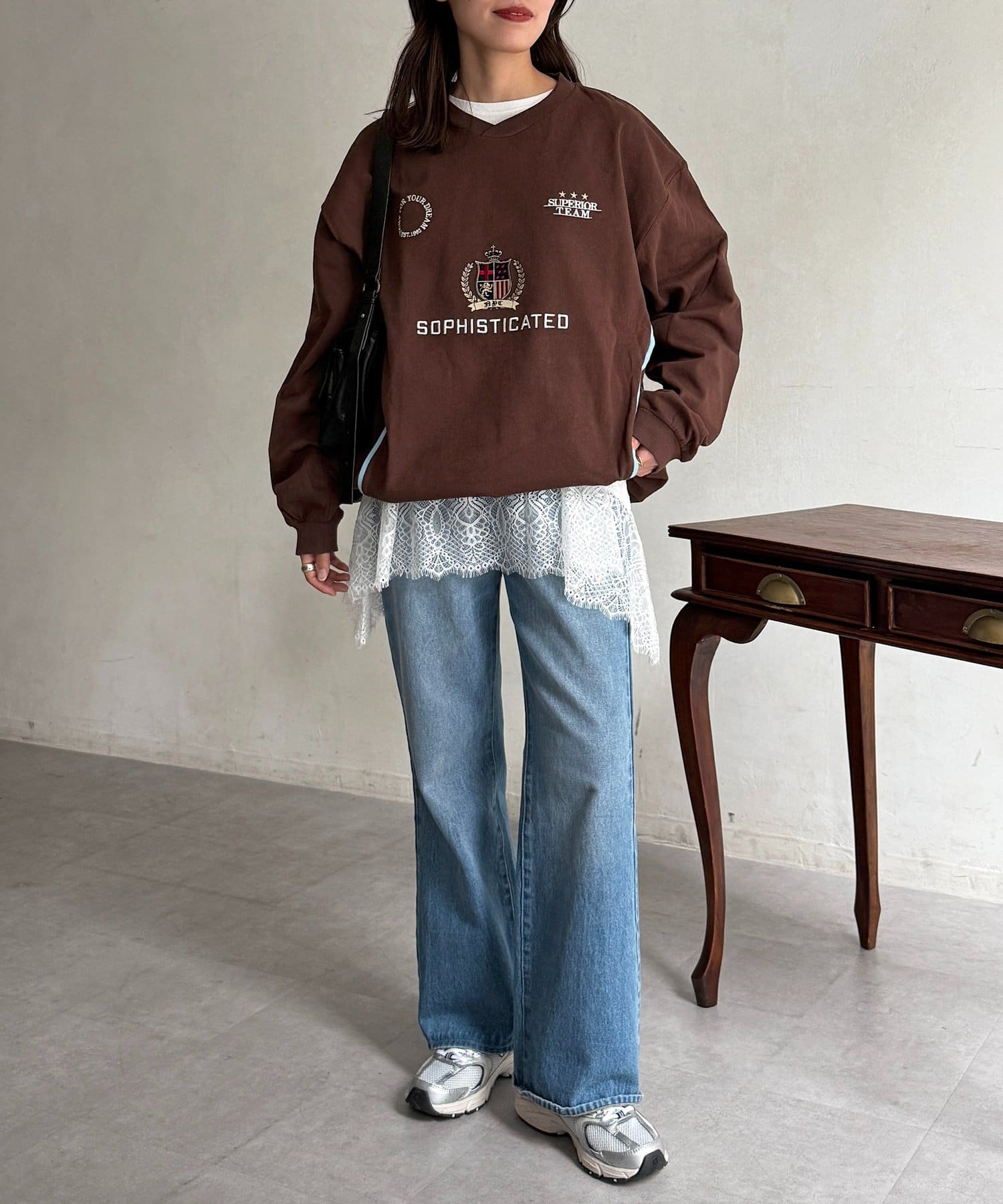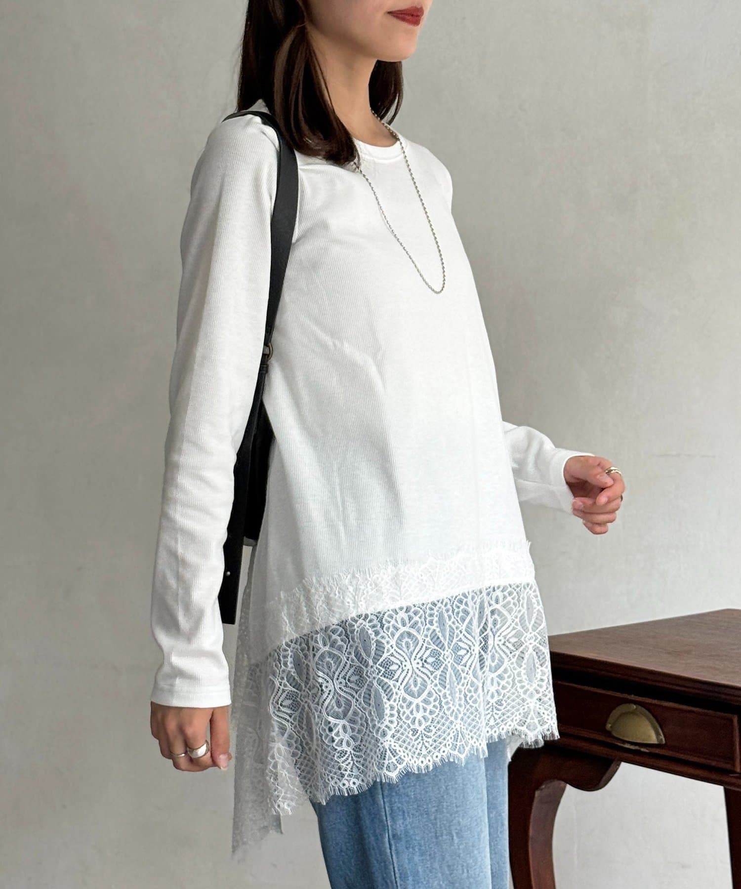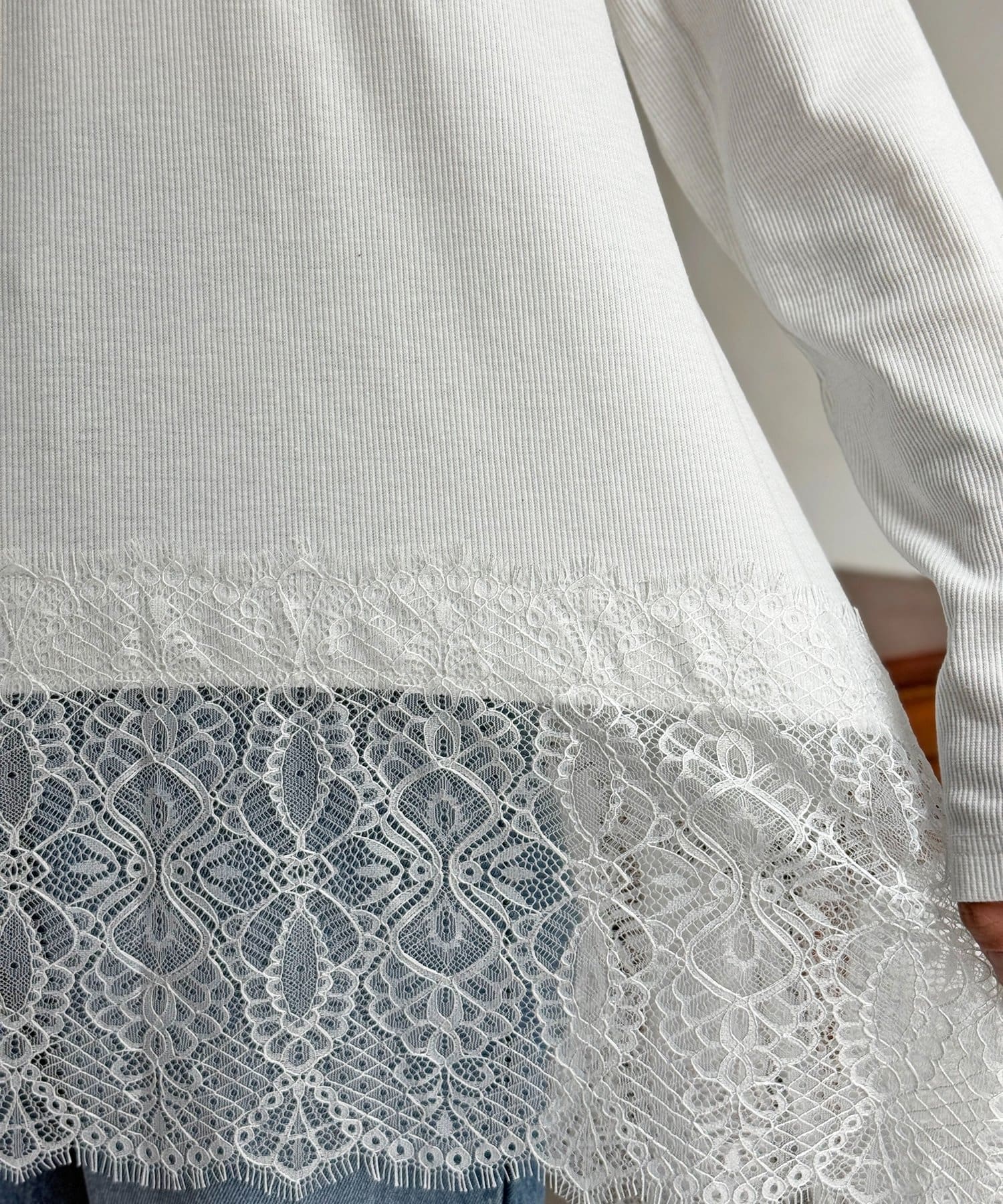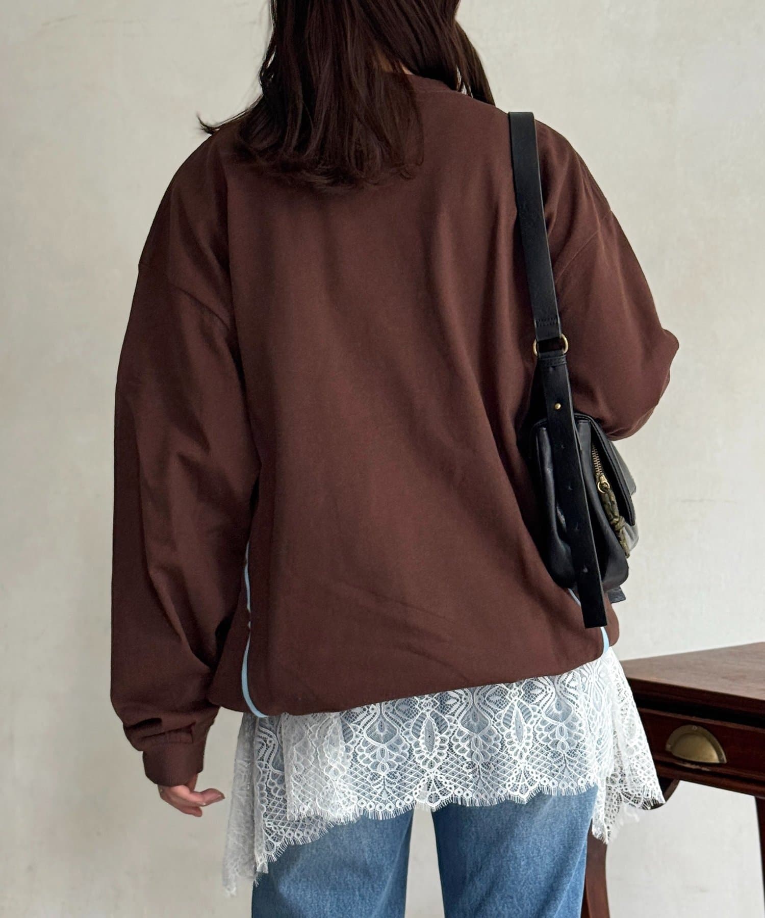 ・クロップド丈のスウェットやパーカーと合わせて、裾のレースを主役にしたトレンドのレイヤードスタイルに。