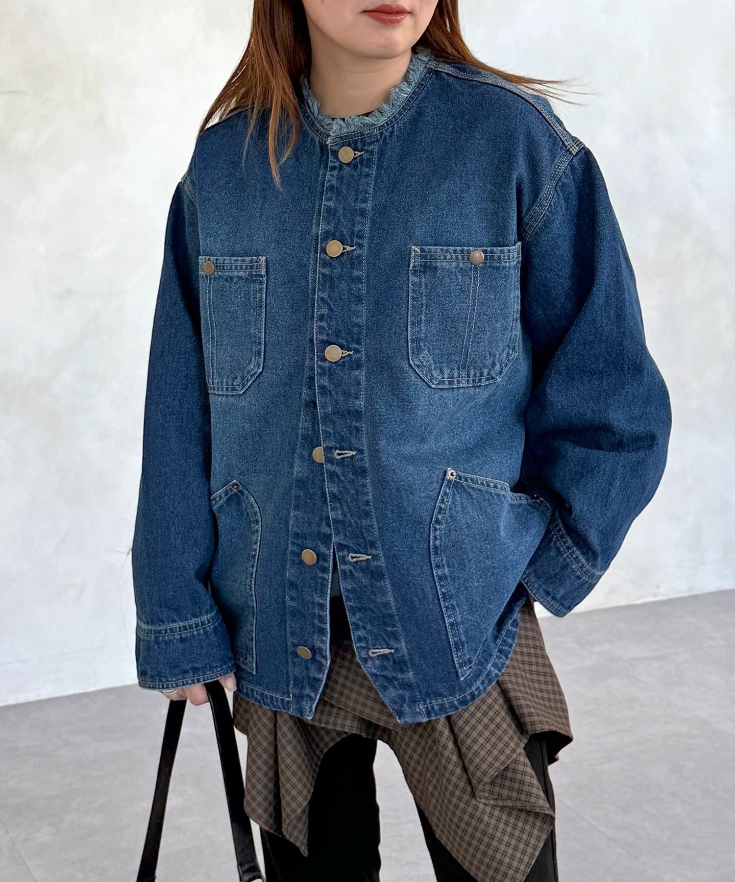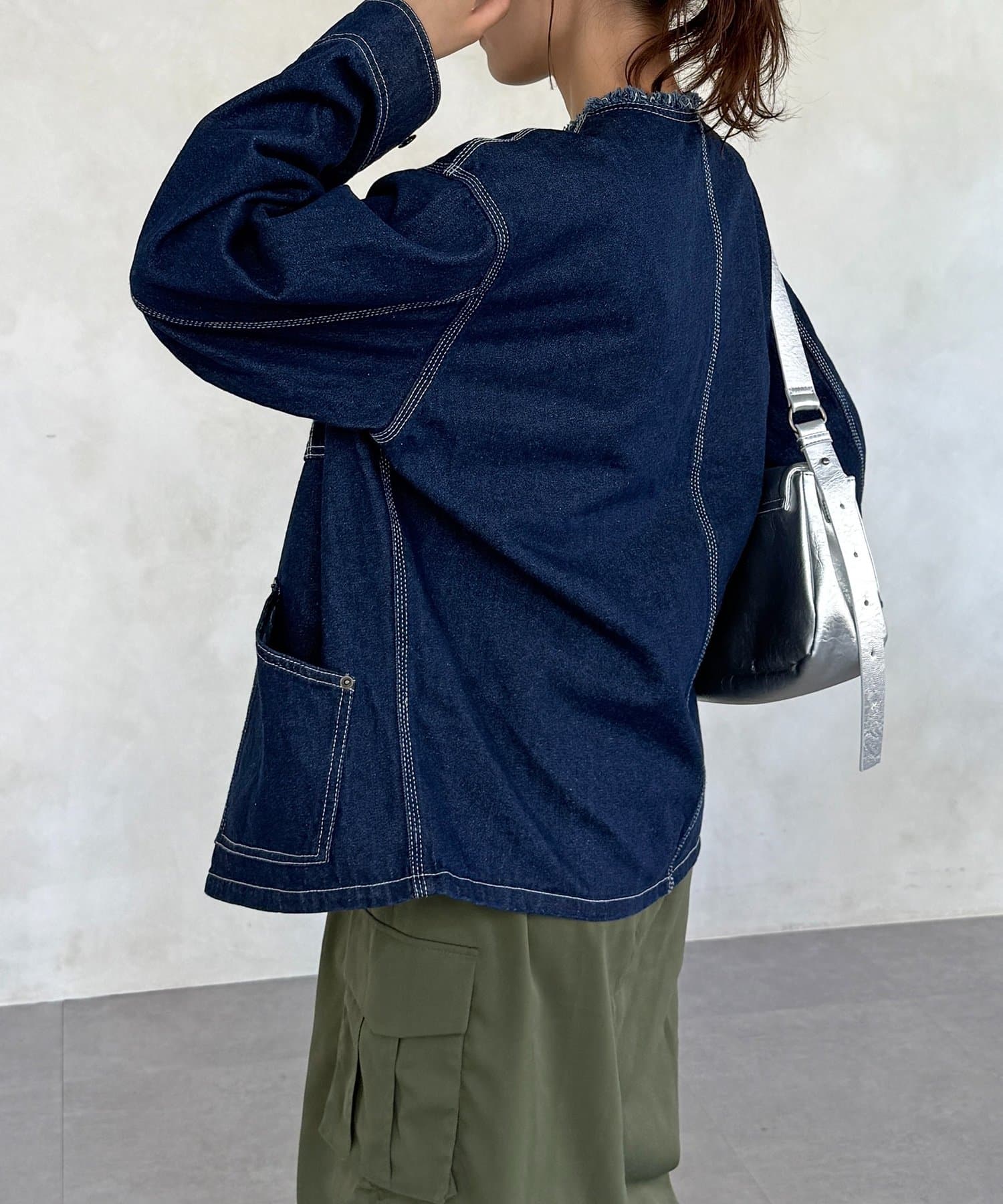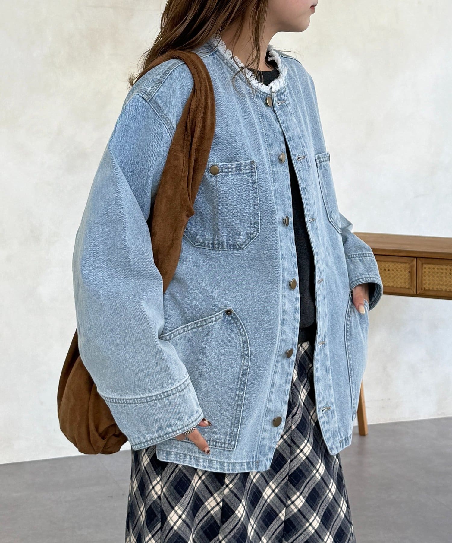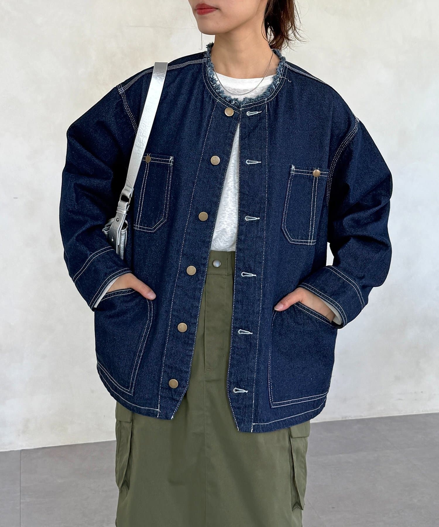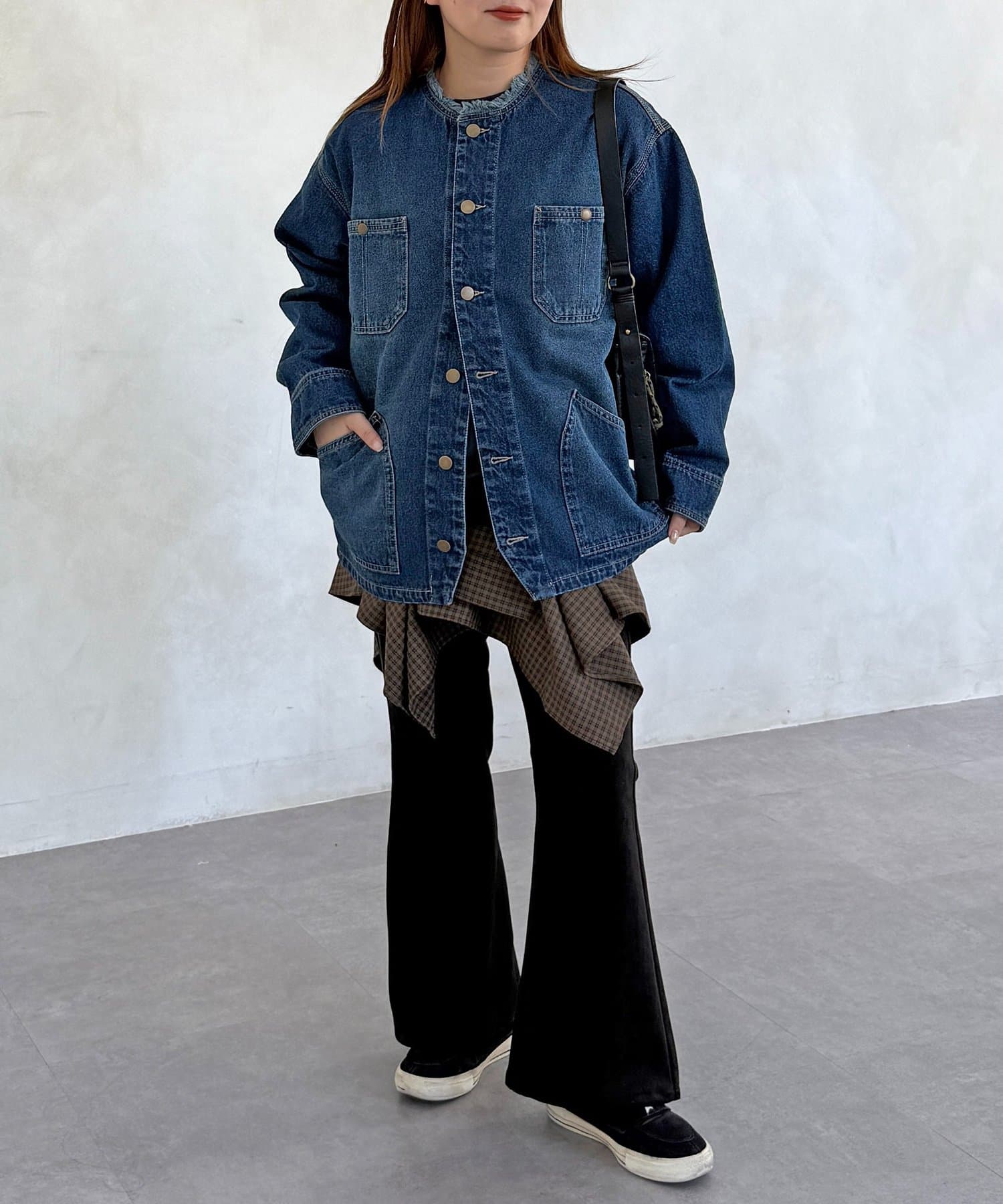 ノーカラーなので、ハイネックやシャツなどインナーを選ばず様々なスタイルに合わせやすいのが魅力◎
