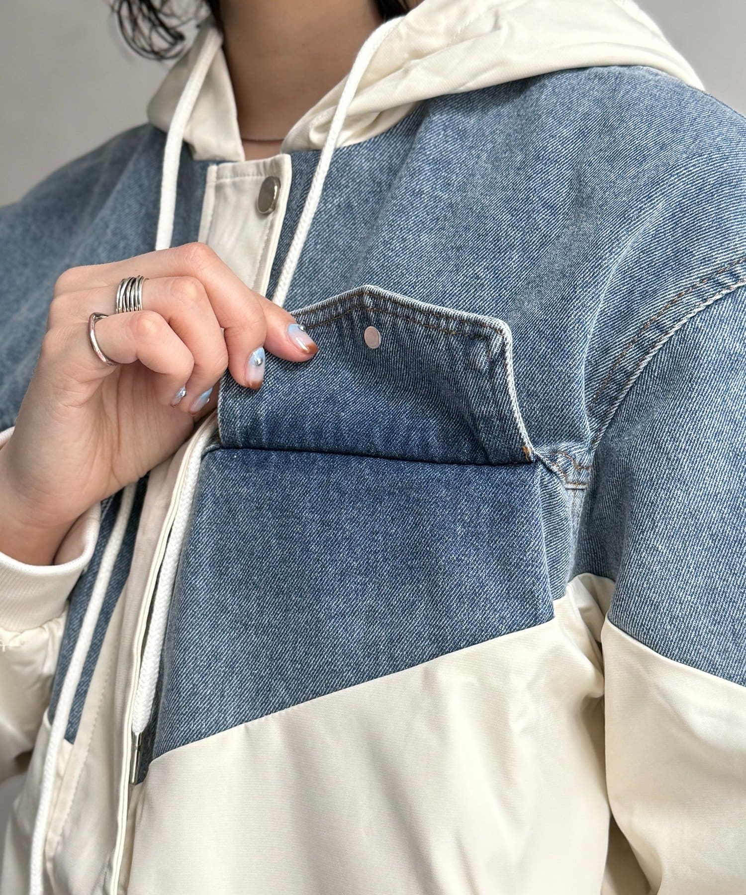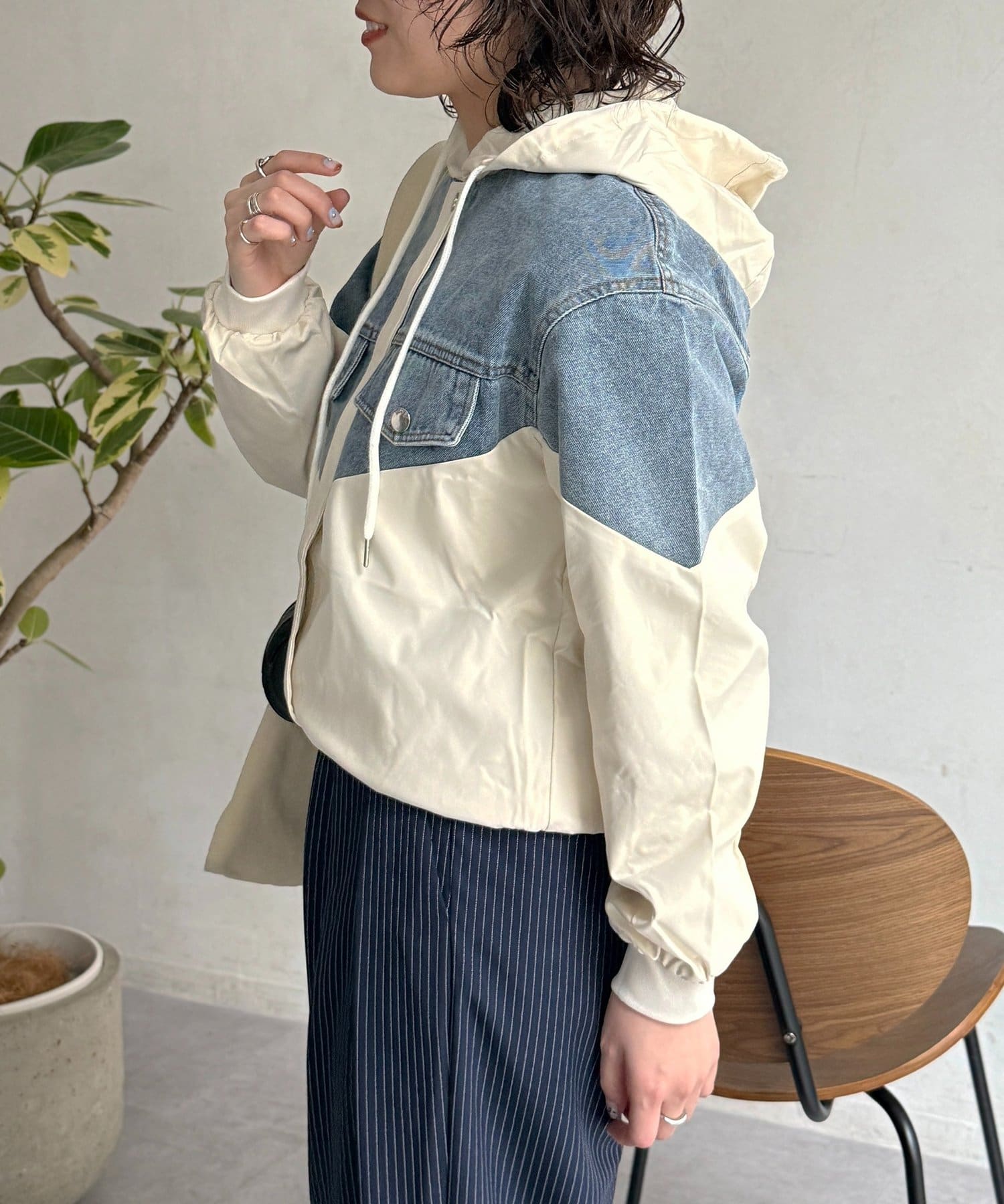 デニムと軽やかな素材をドッキングした、デザイン性の高いフード付きブルゾンです!​​​​​​