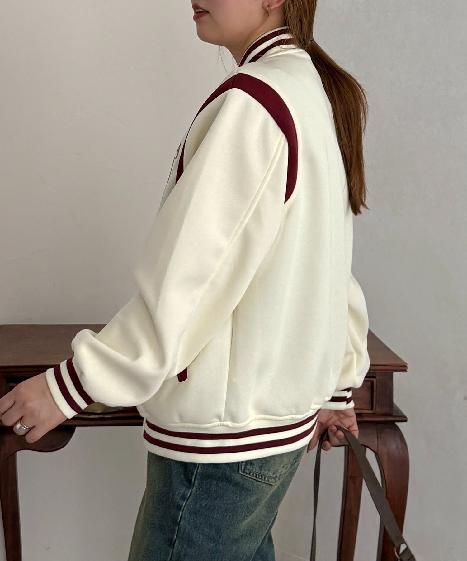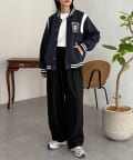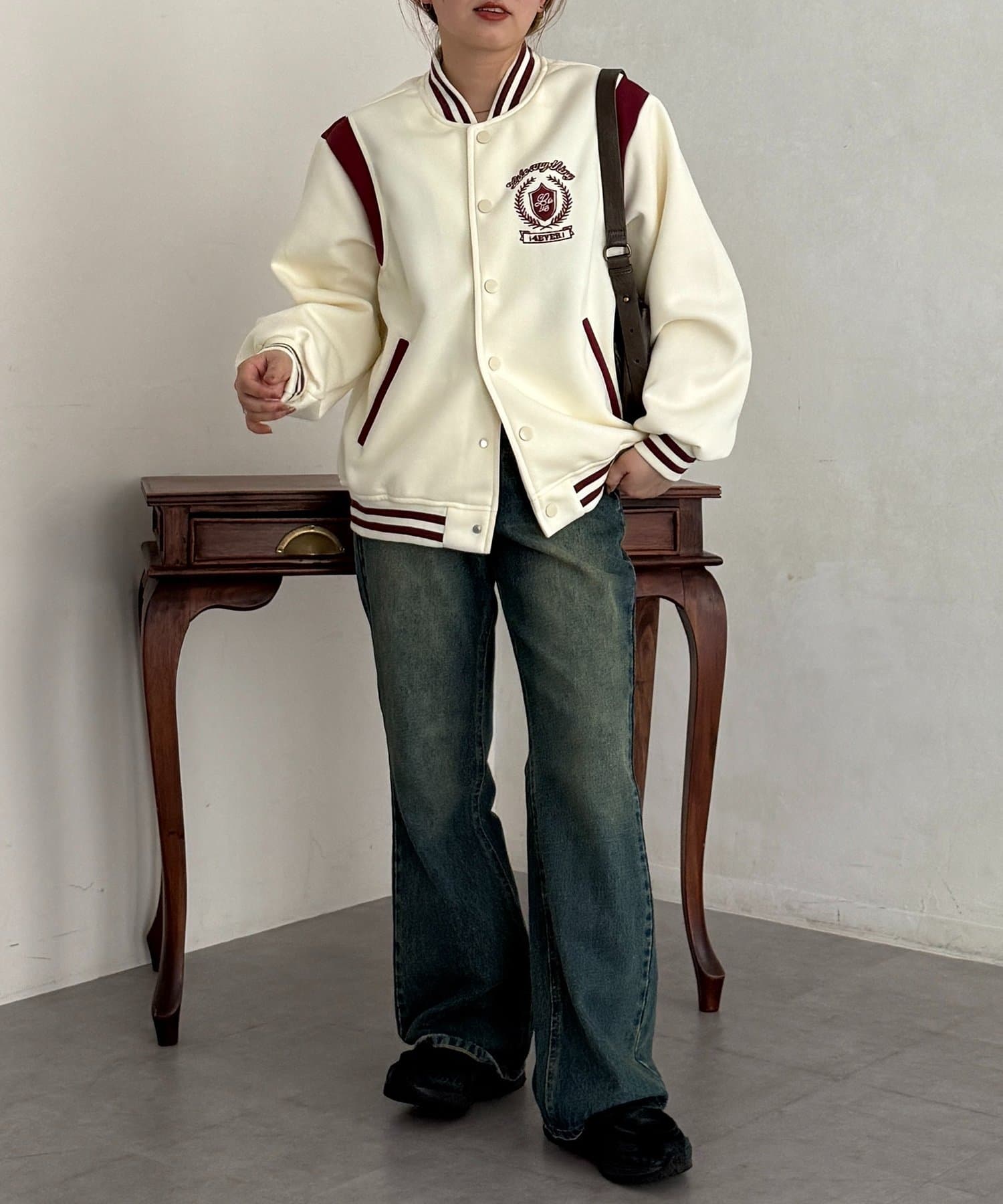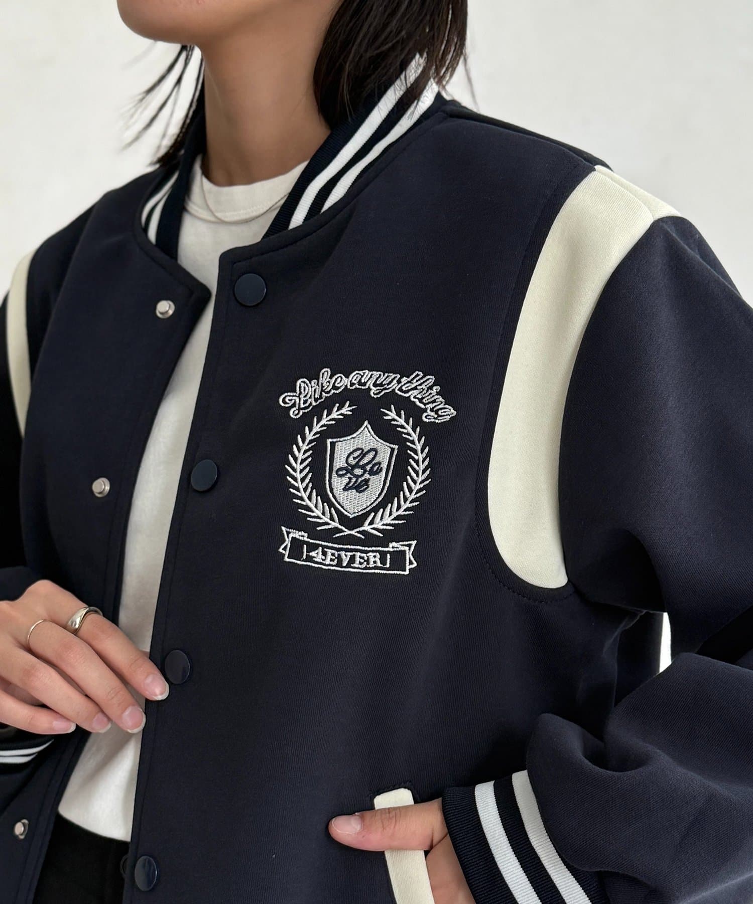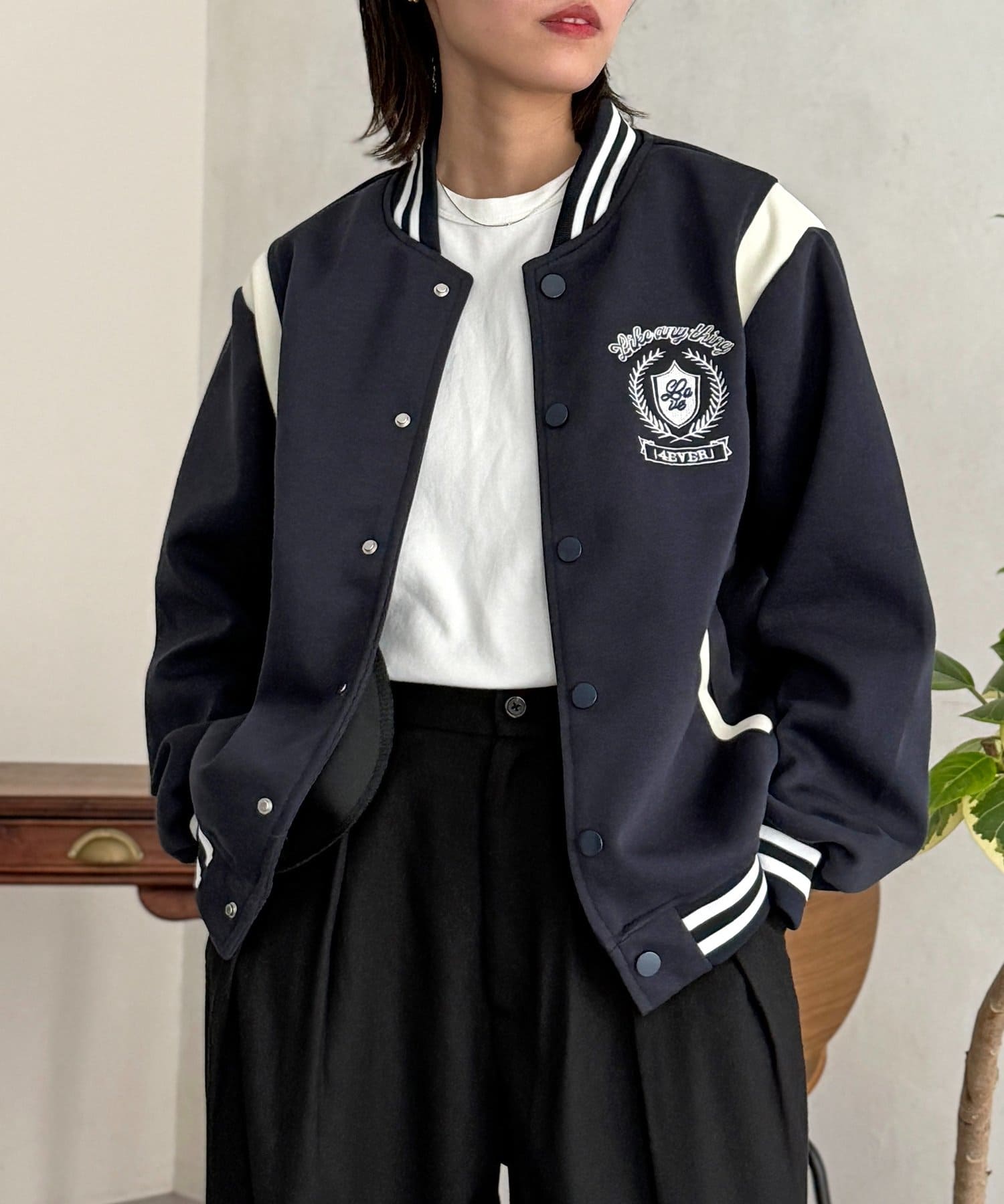 ・胸元のカレッジ風刺繍とライン入りのリブがコーデのアクセントに