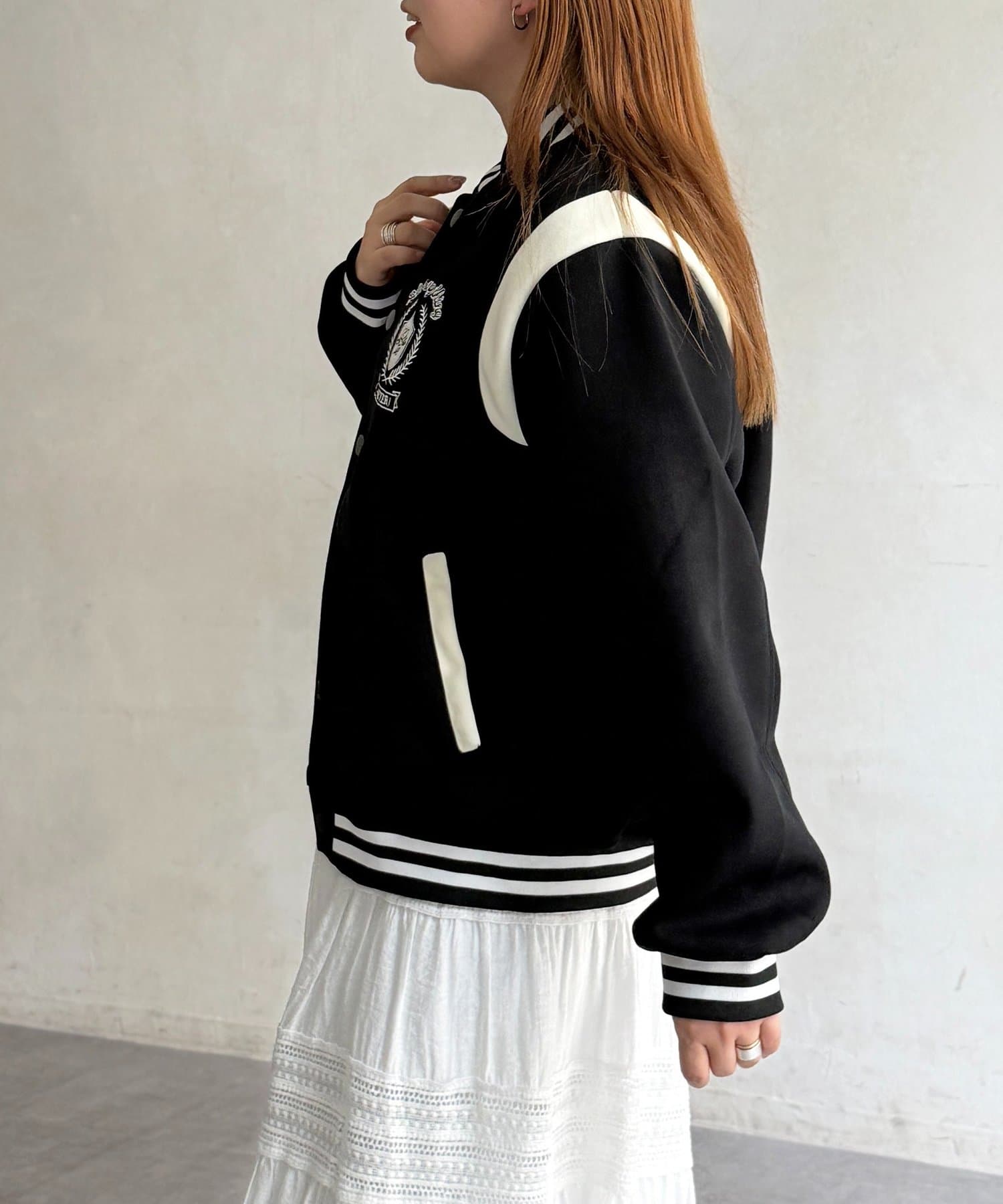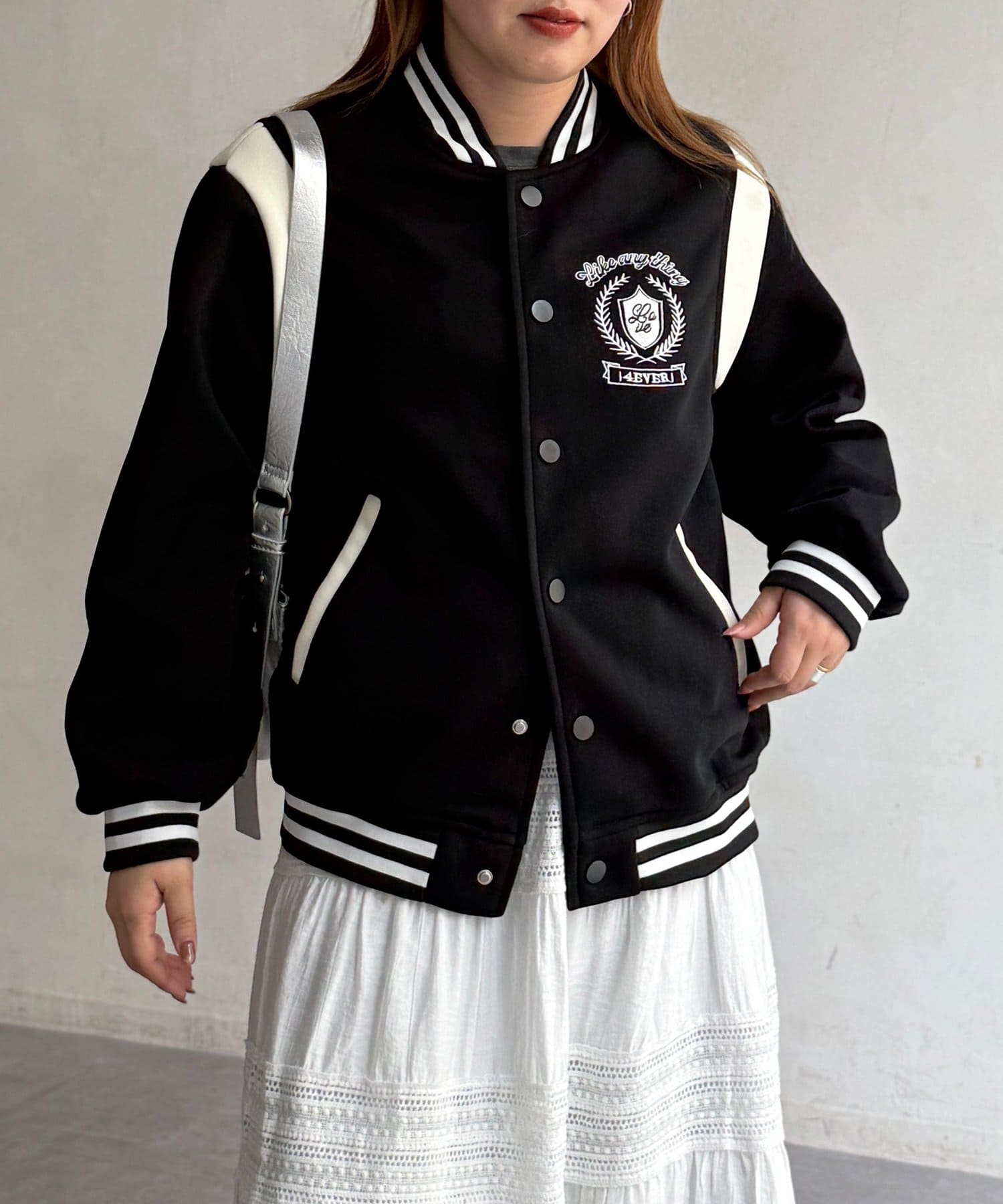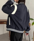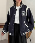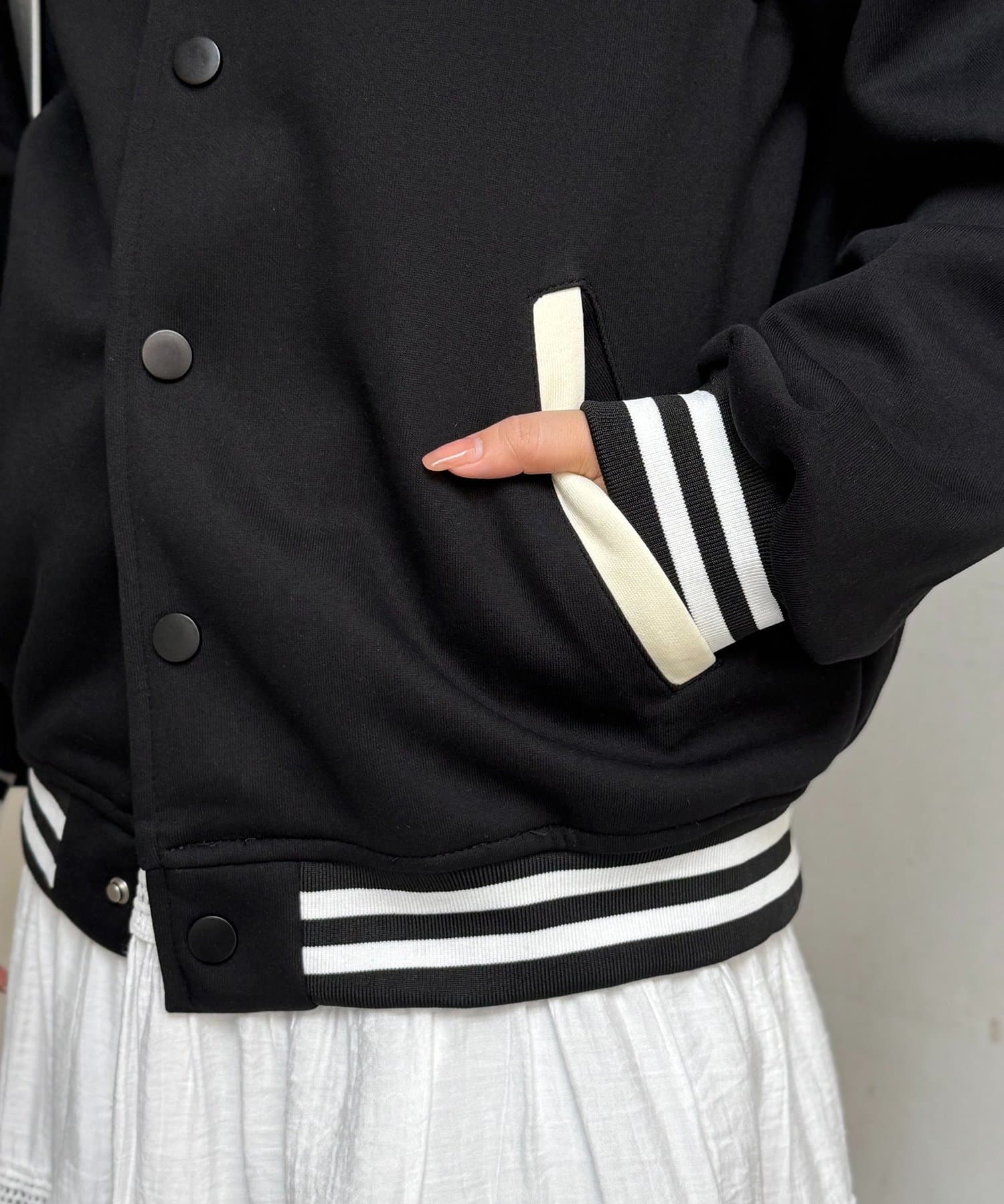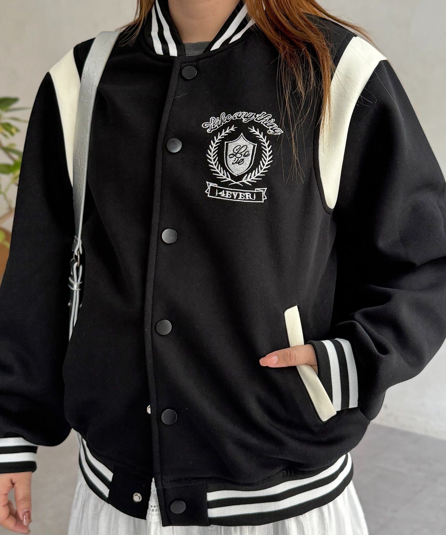 ・胸元のカレッジ風刺繍とライン入りのリブがコーデのアクセントに
