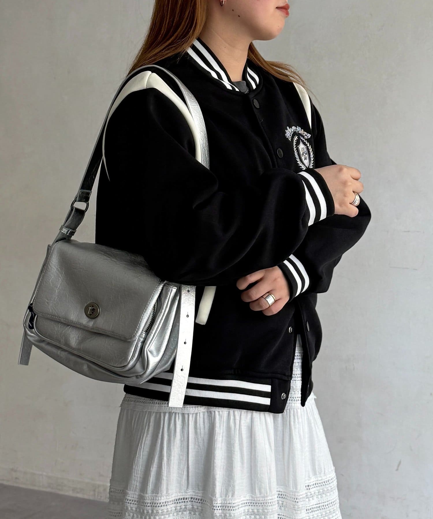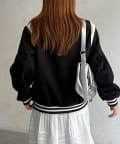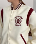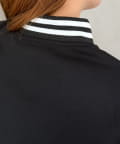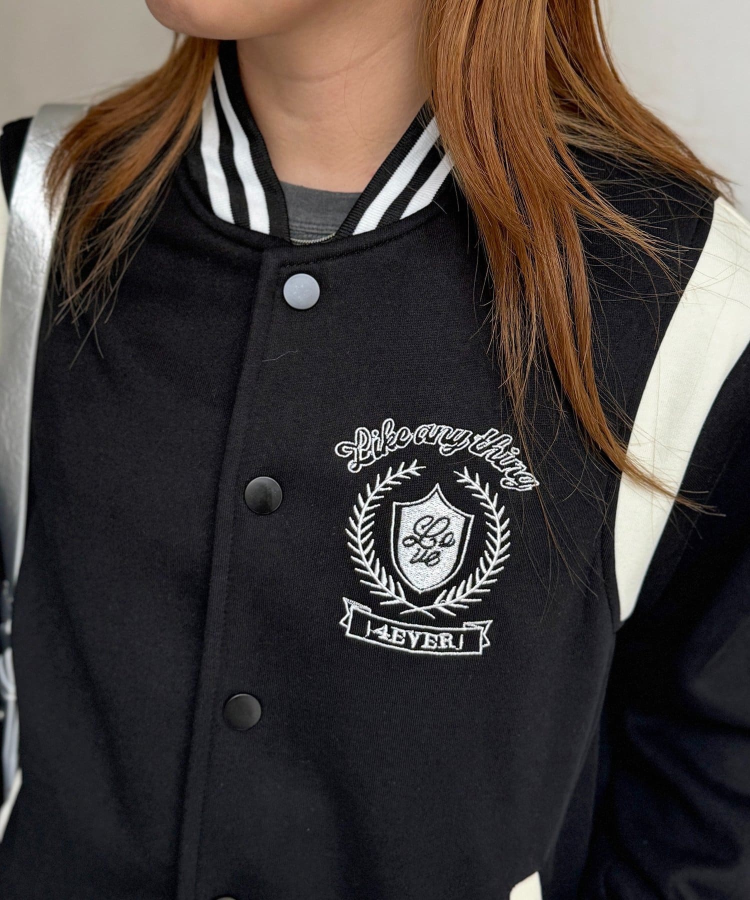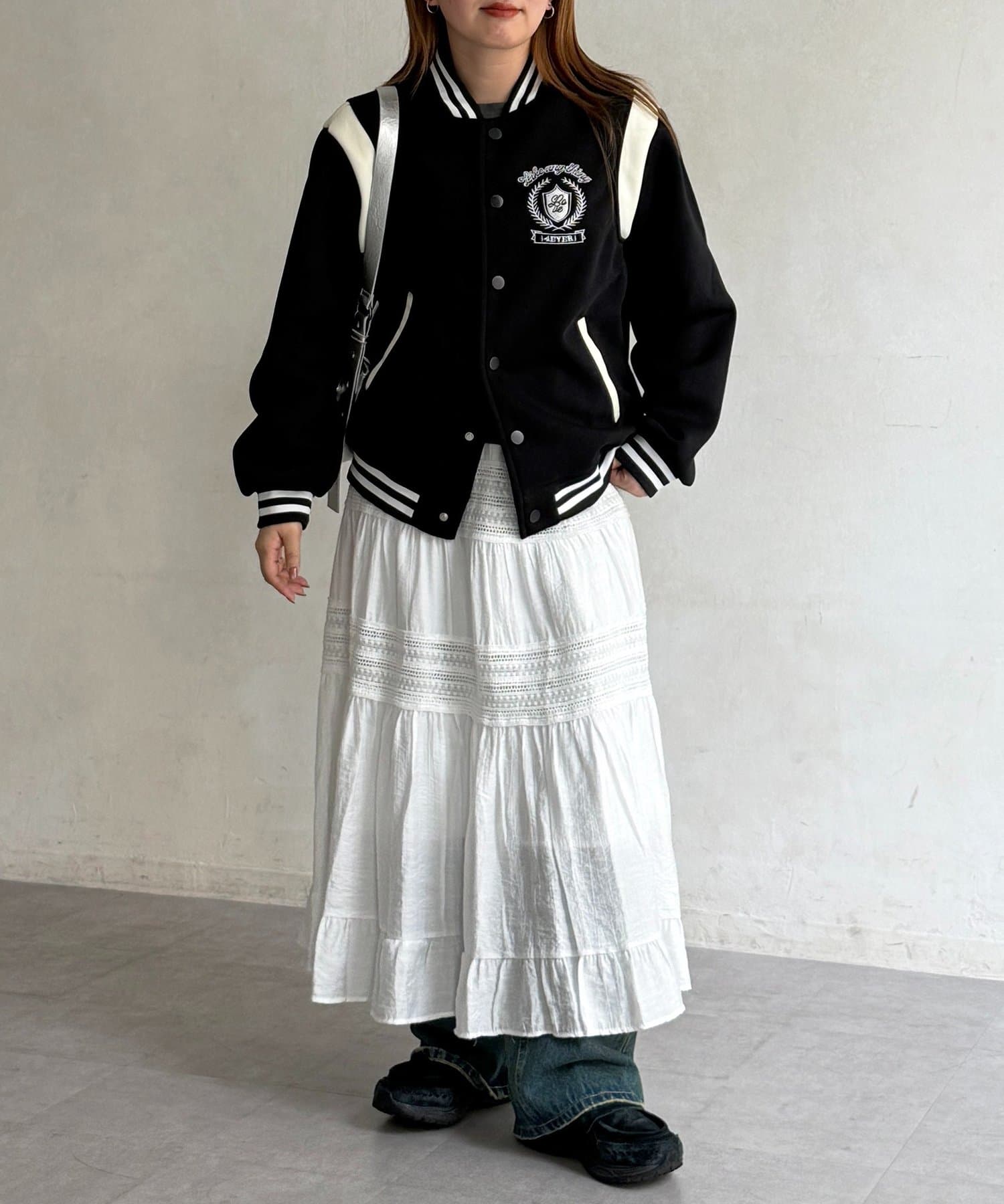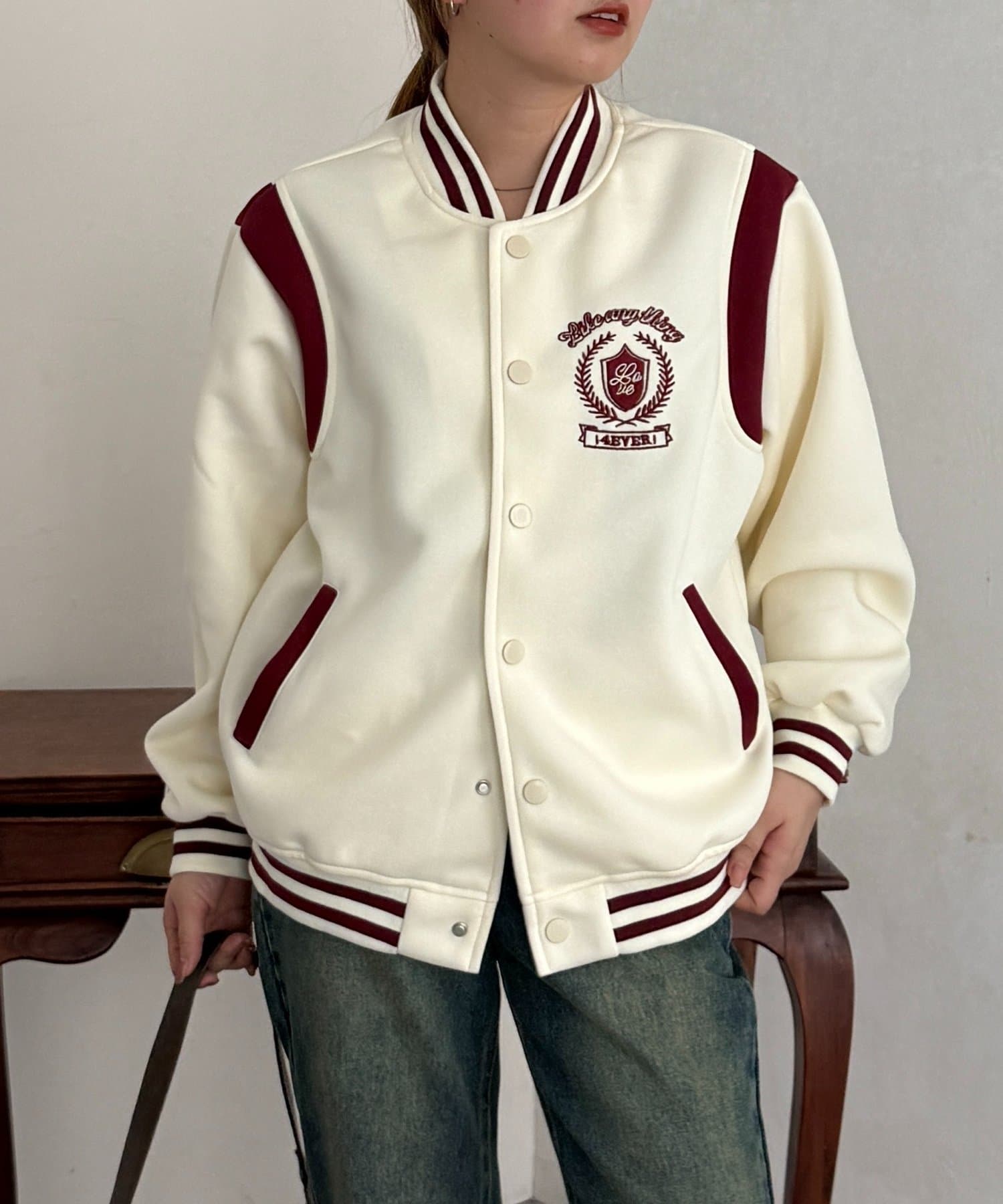 ・胸元のカレッジ風刺繍とライン入りのリブがコーデのアクセントに