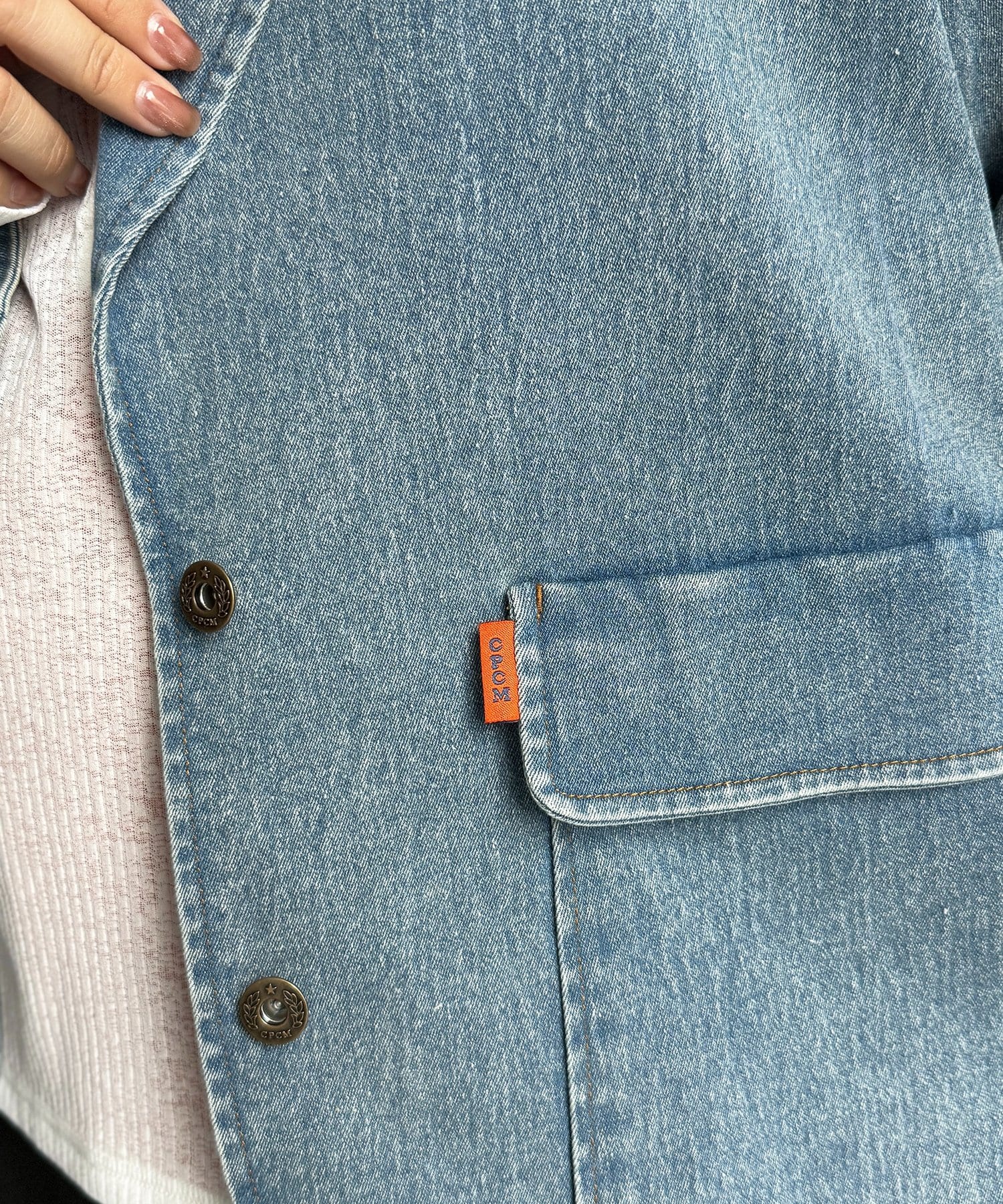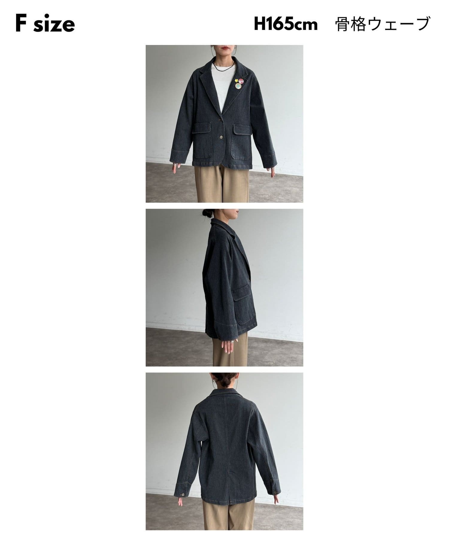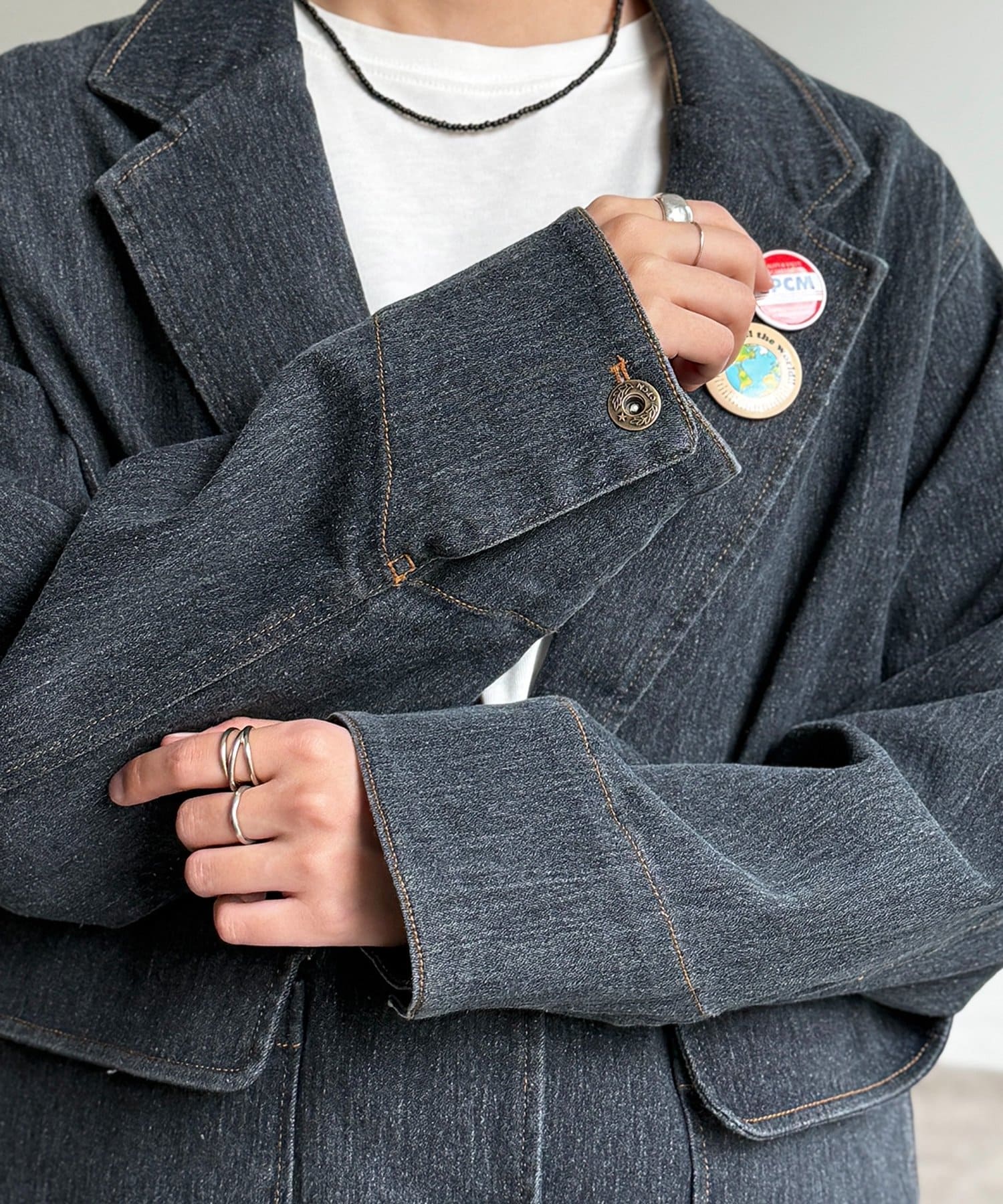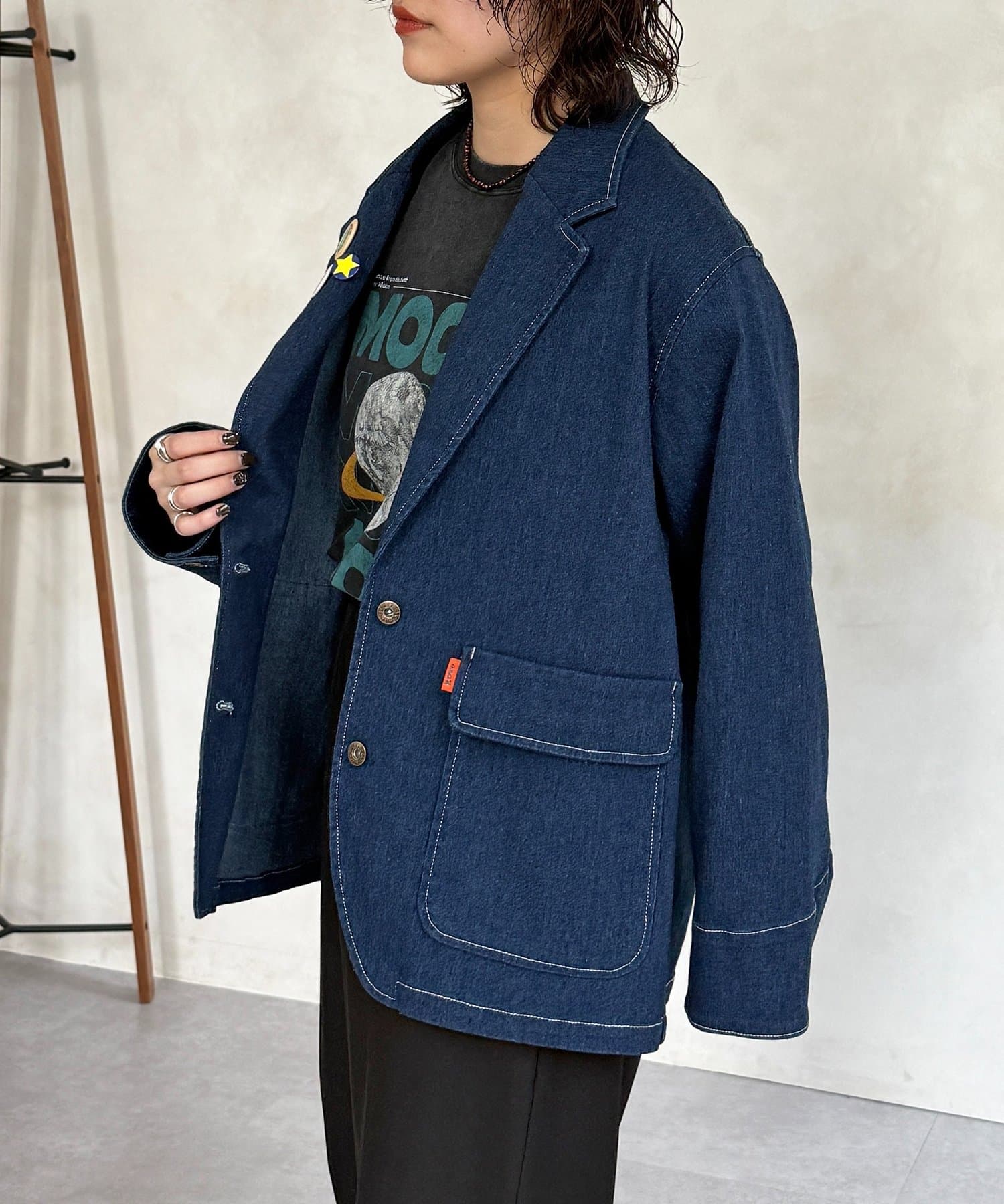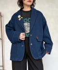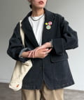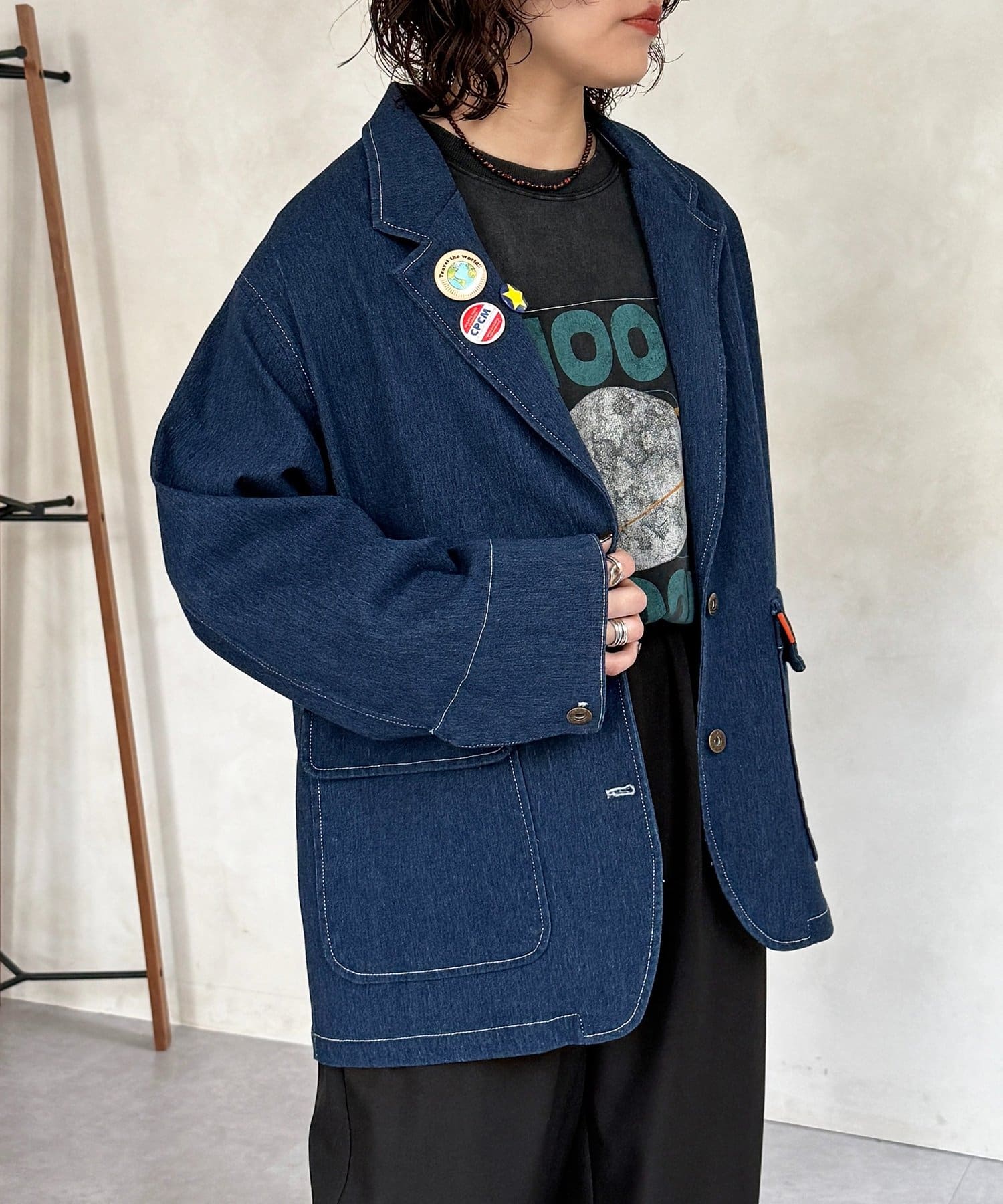 缶バッジ付きデニムテーラードジャケット