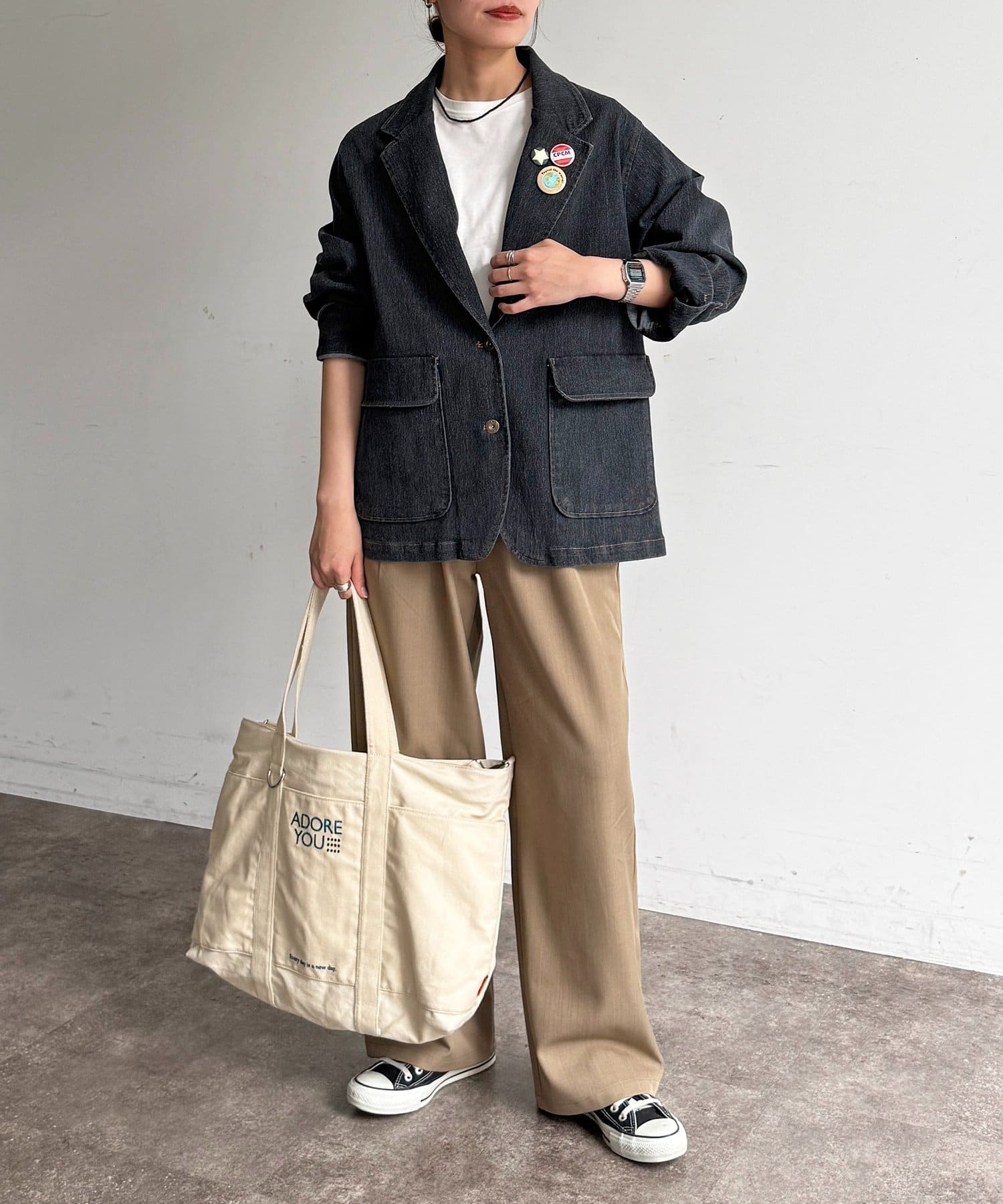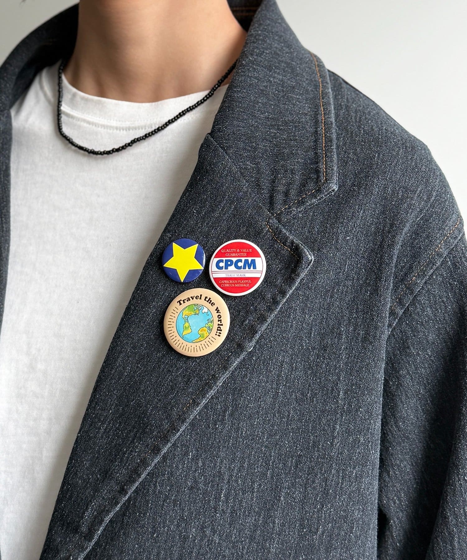 胸元の缶バッジがアクセントになり、シンプルな着こなしも個性的にアップデートしてくれます!