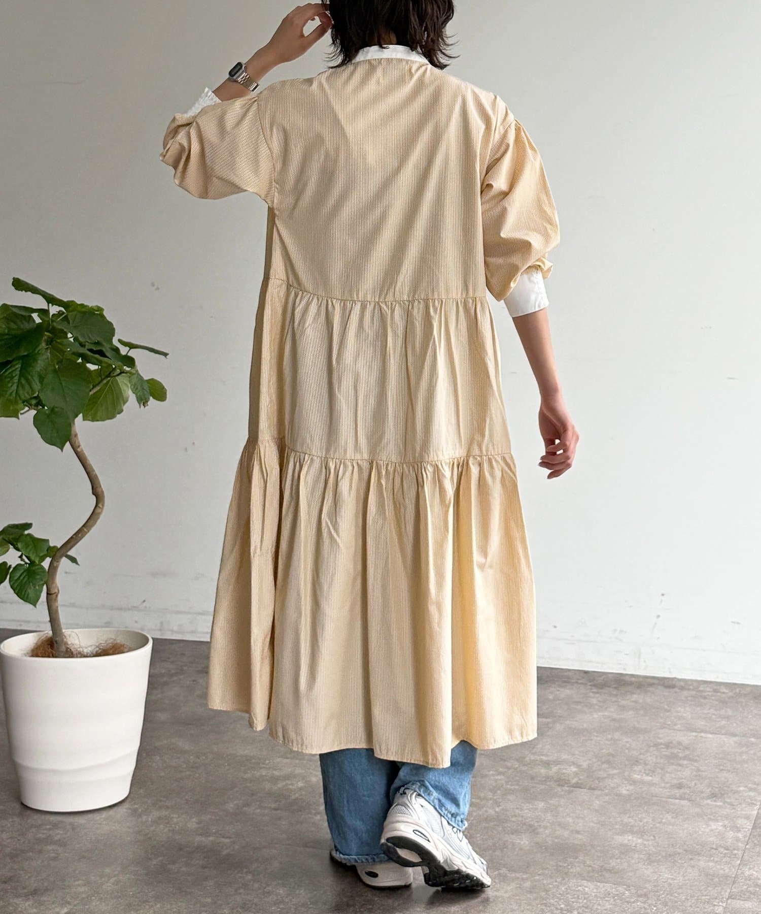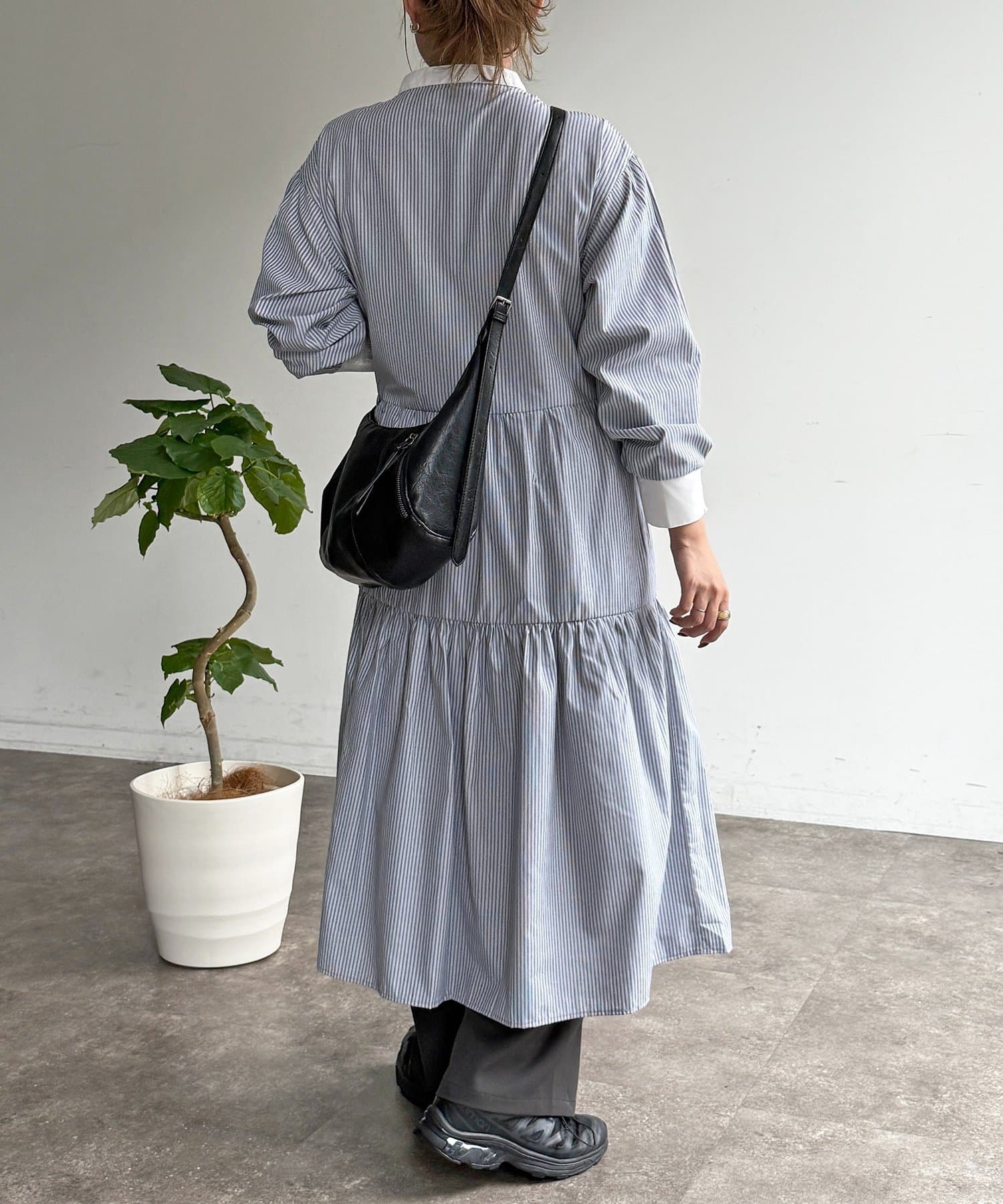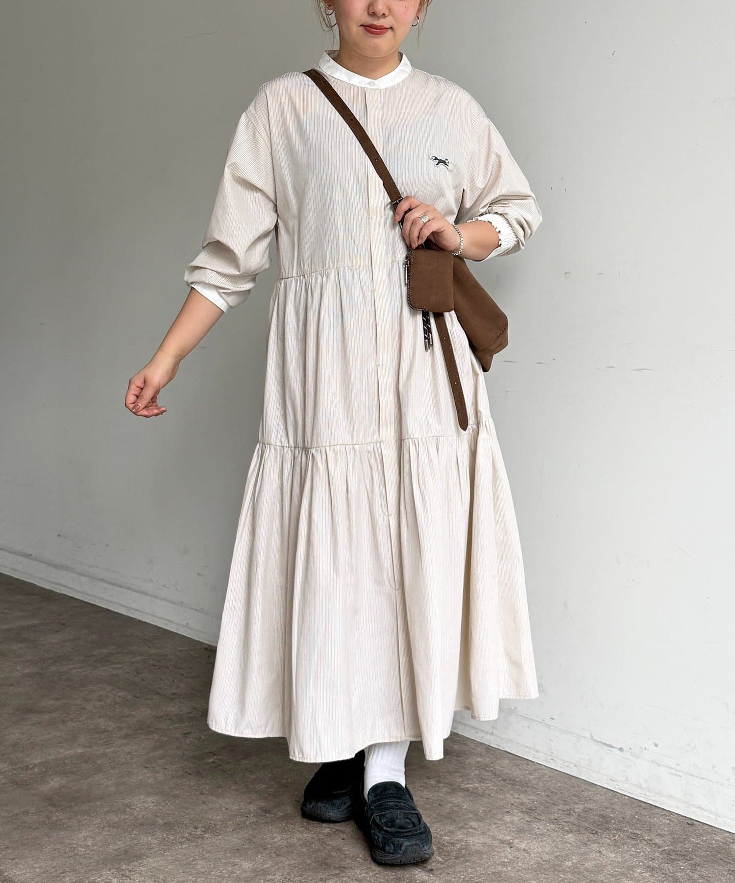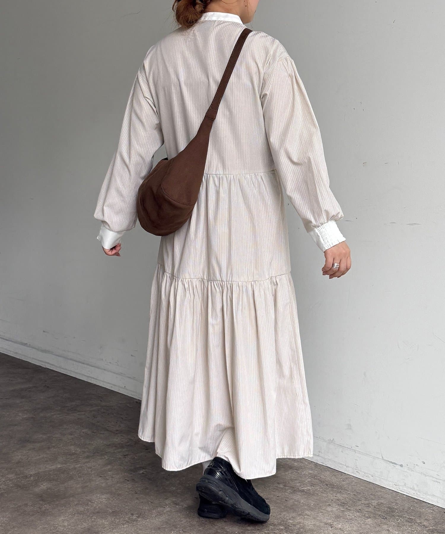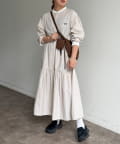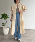 ・ボタンを閉じてワンピースとして着用し、きれいめなリラックスコーデに