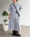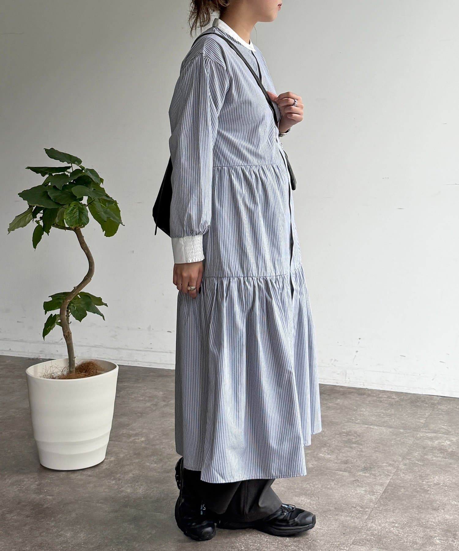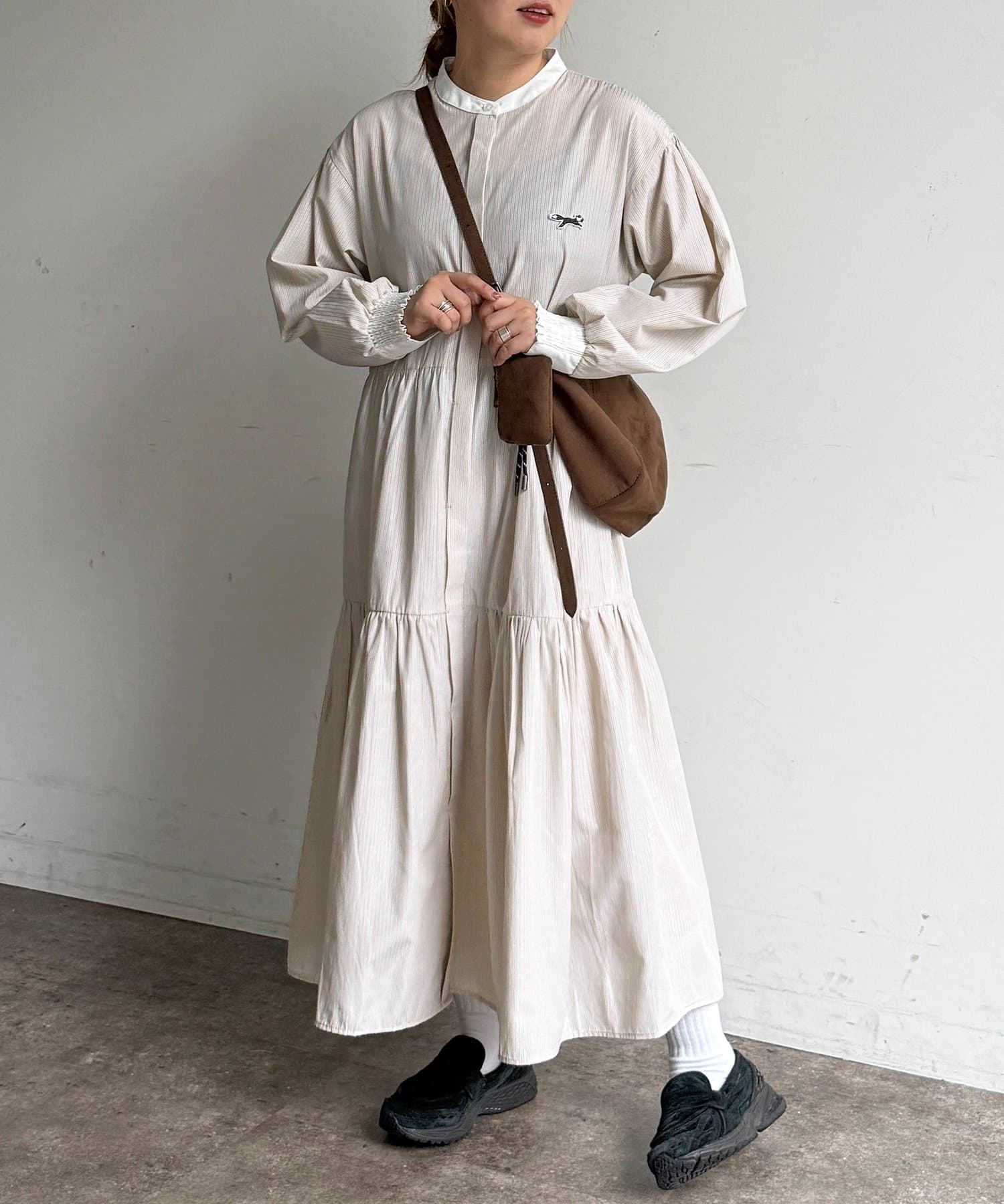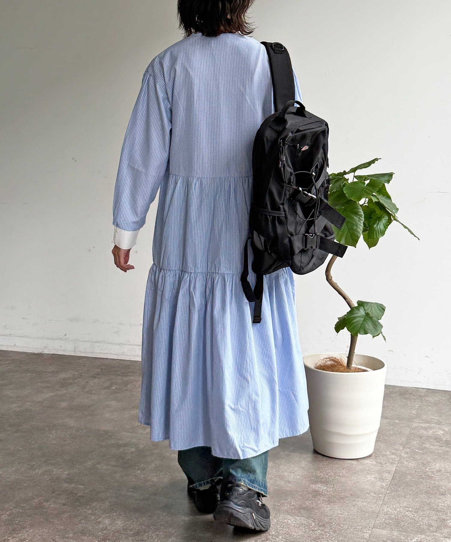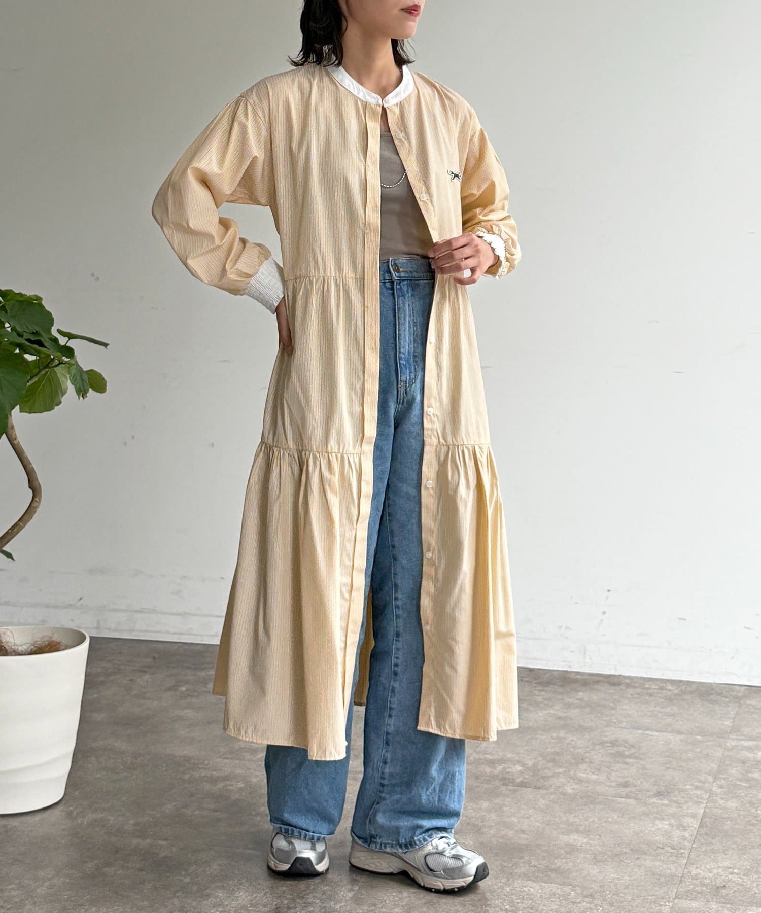 ・ボタンを閉じてワンピースとして着用し、きれいめなリラックスコーデに