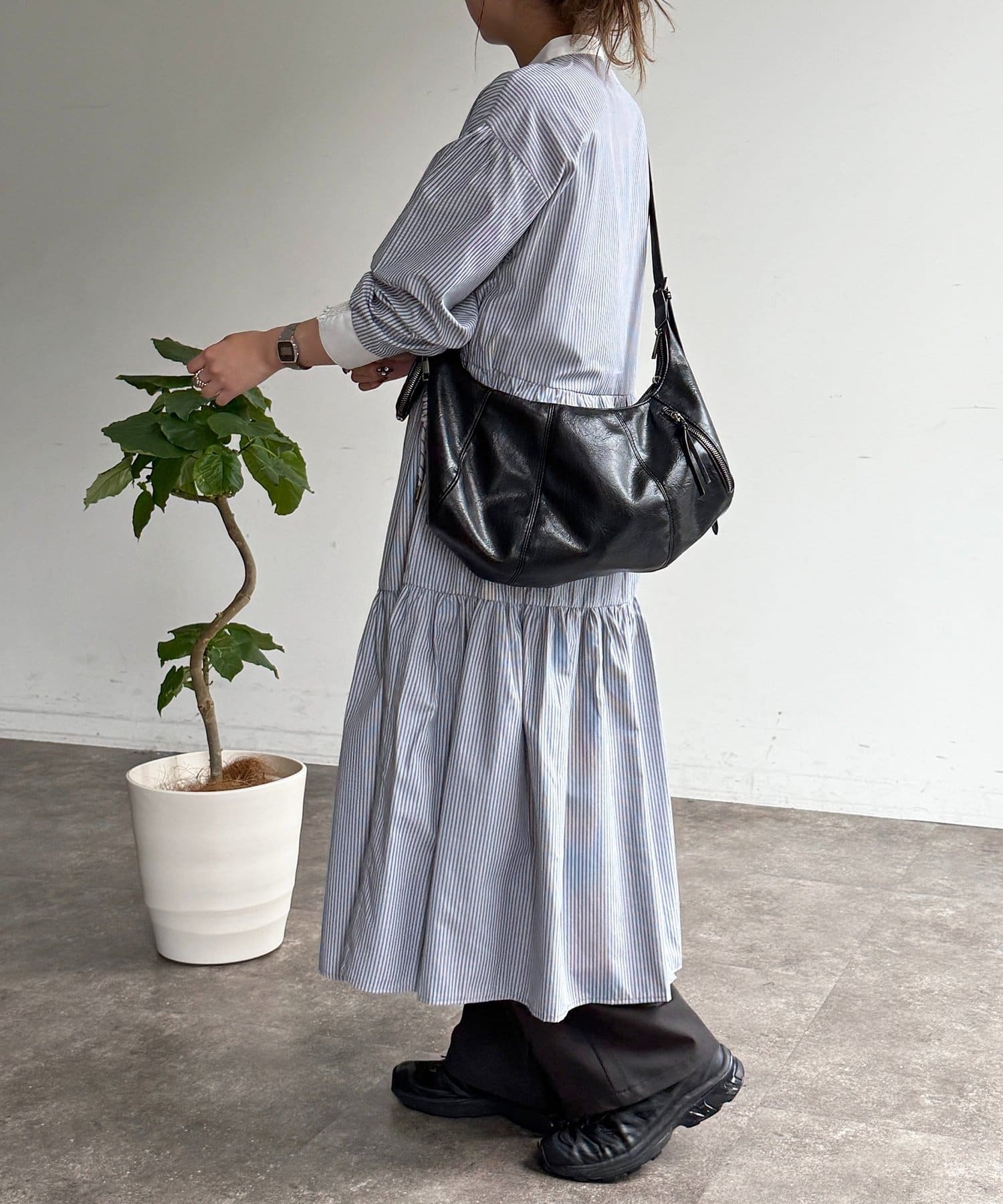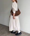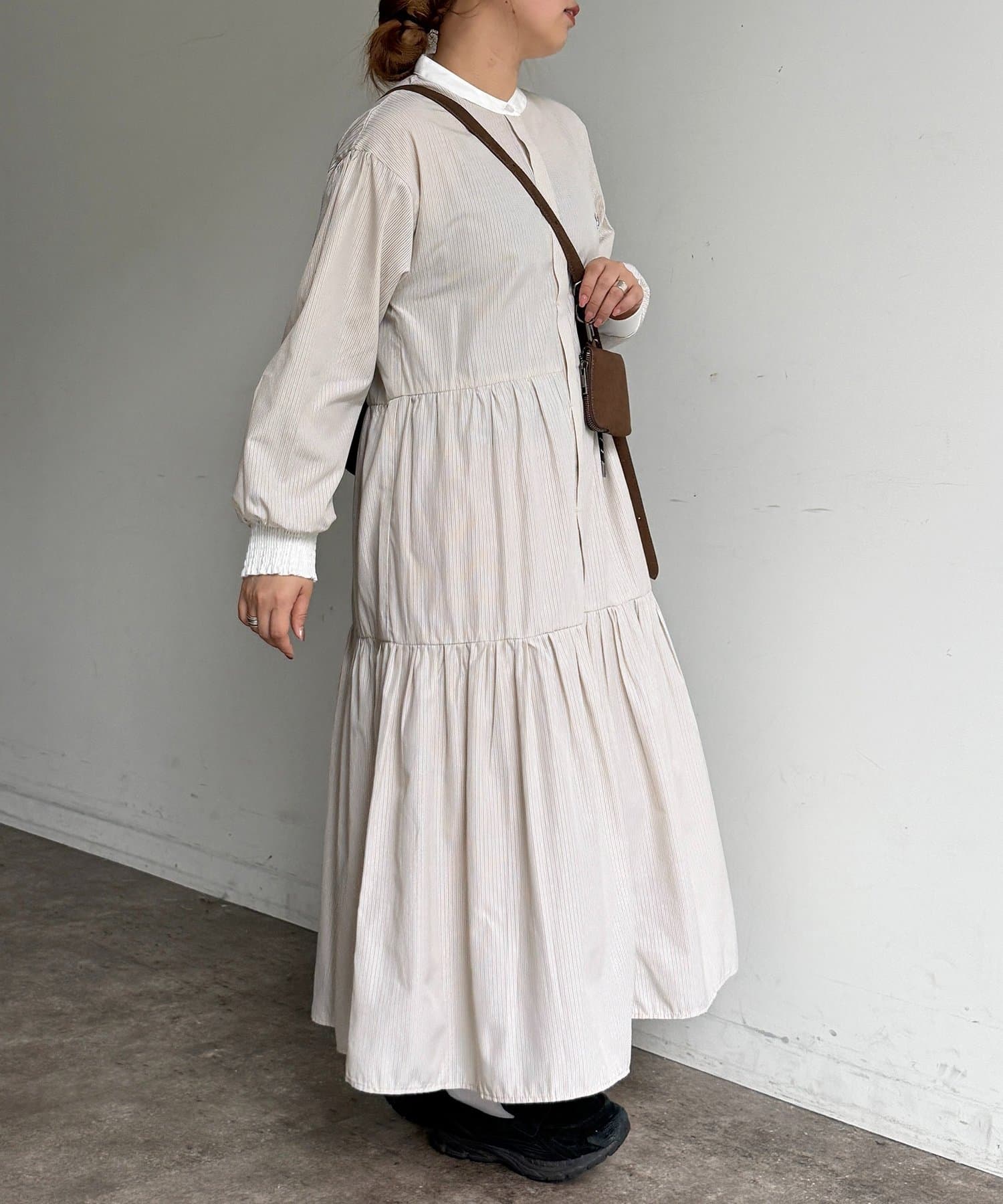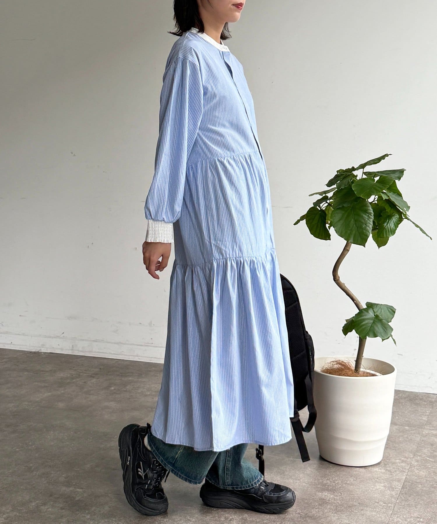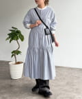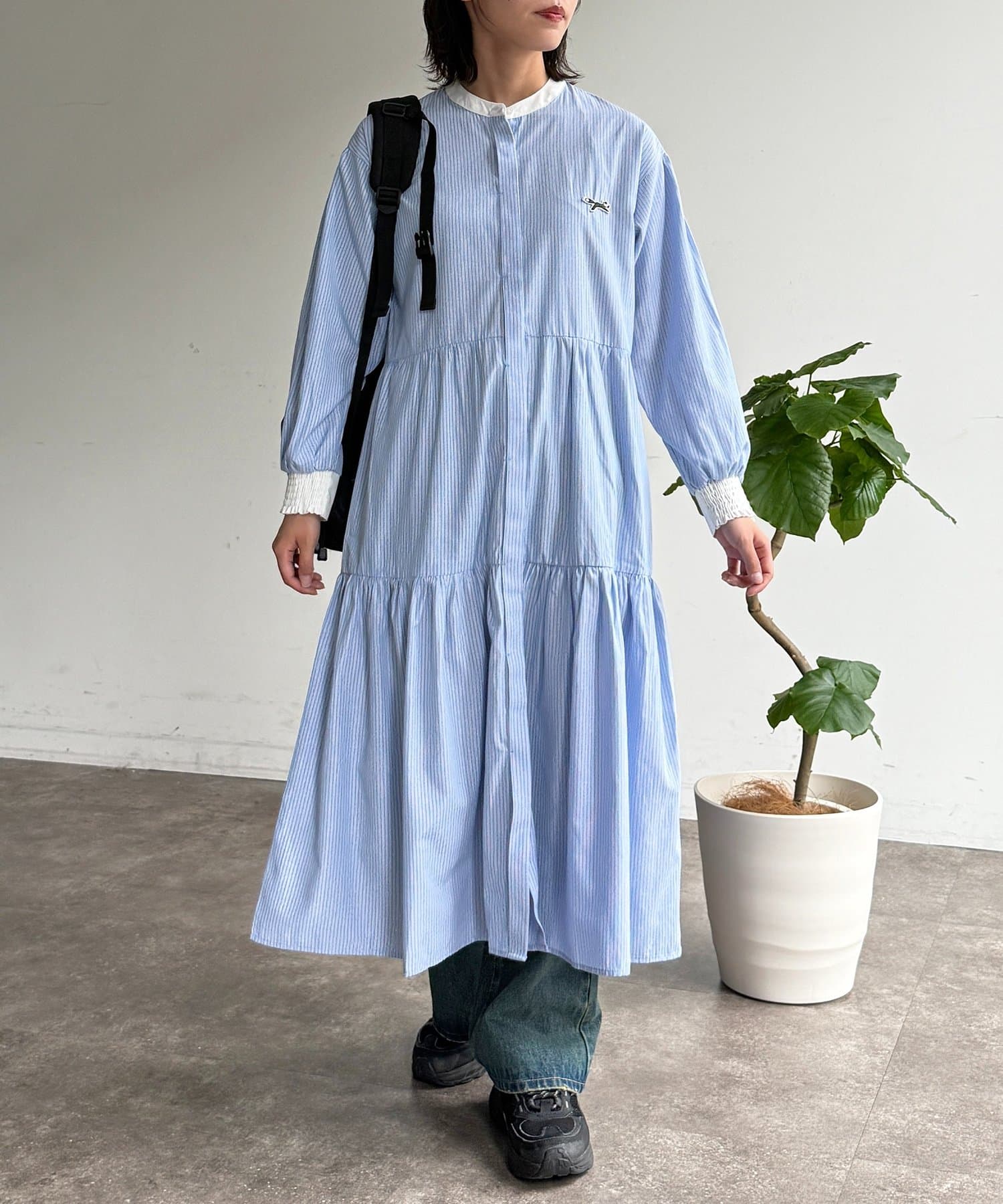 ・ボタンを閉じてワンピースとして着用し、きれいめなリラックスコーデに