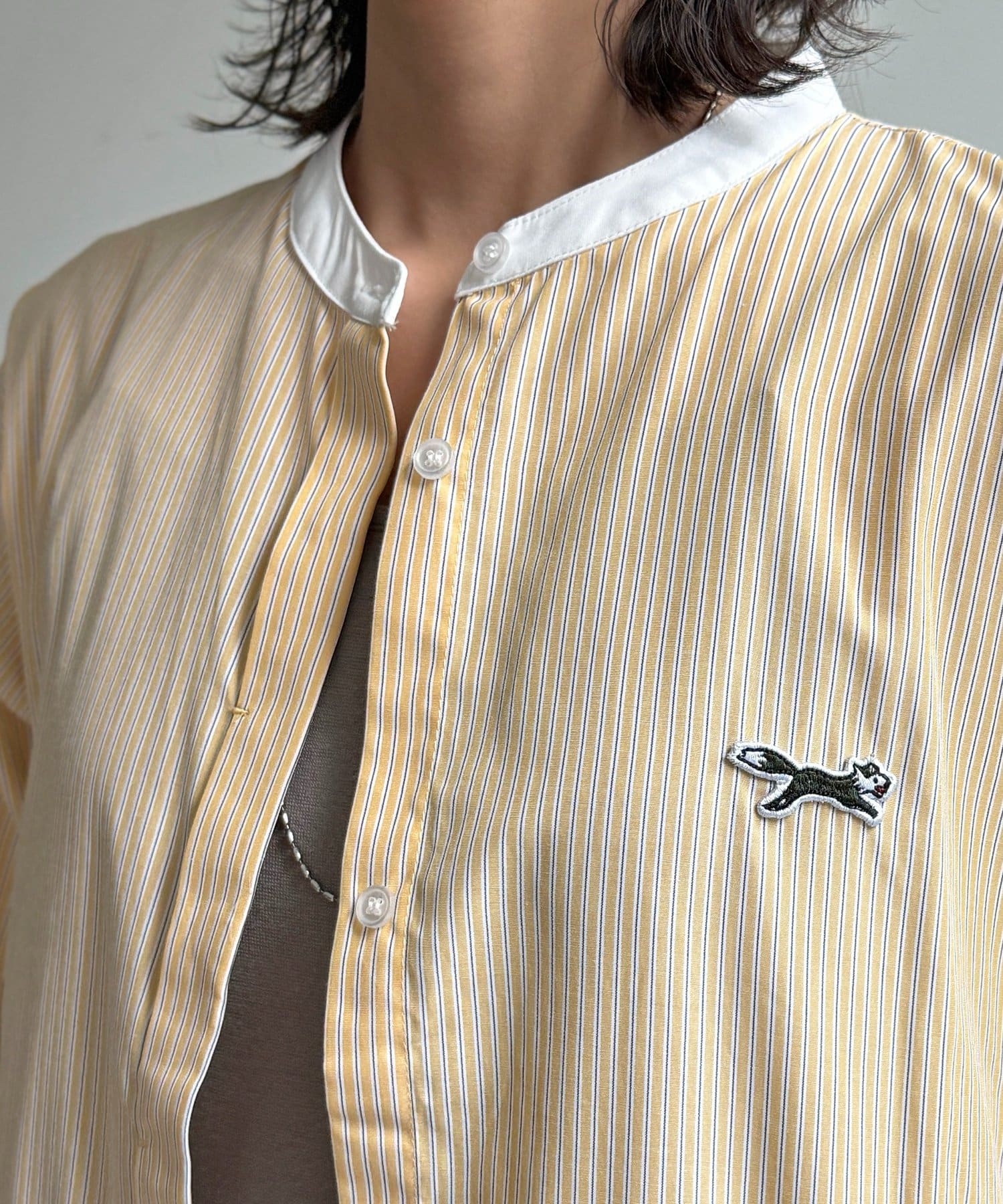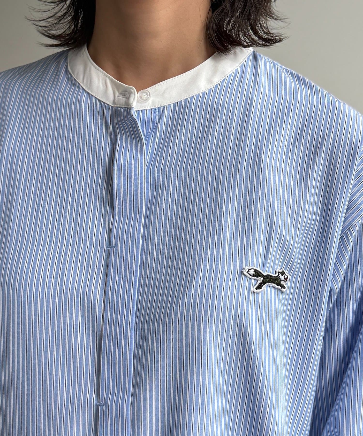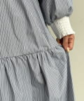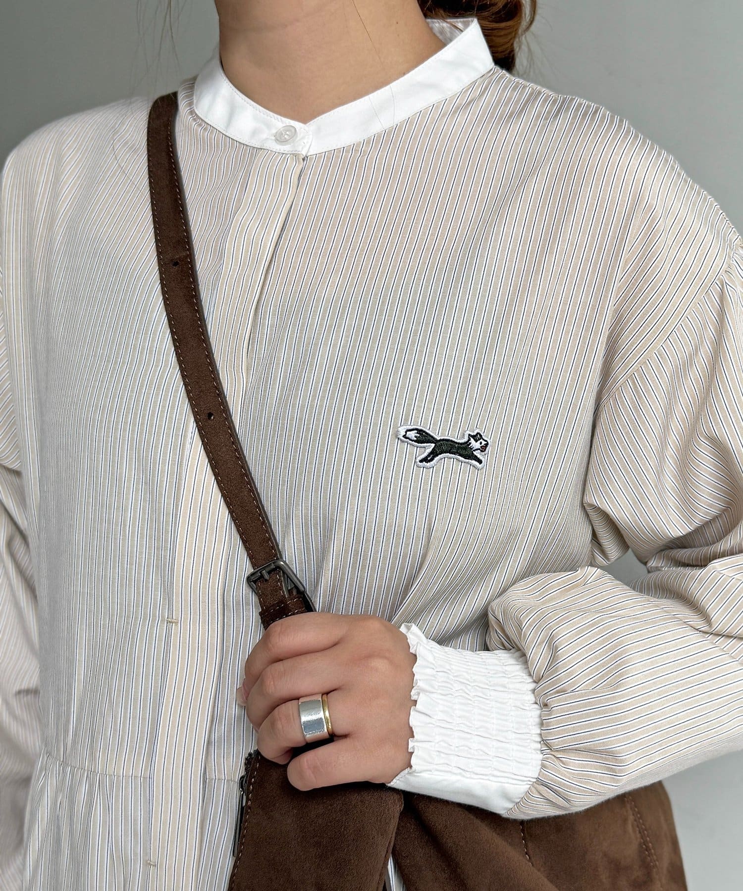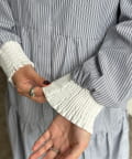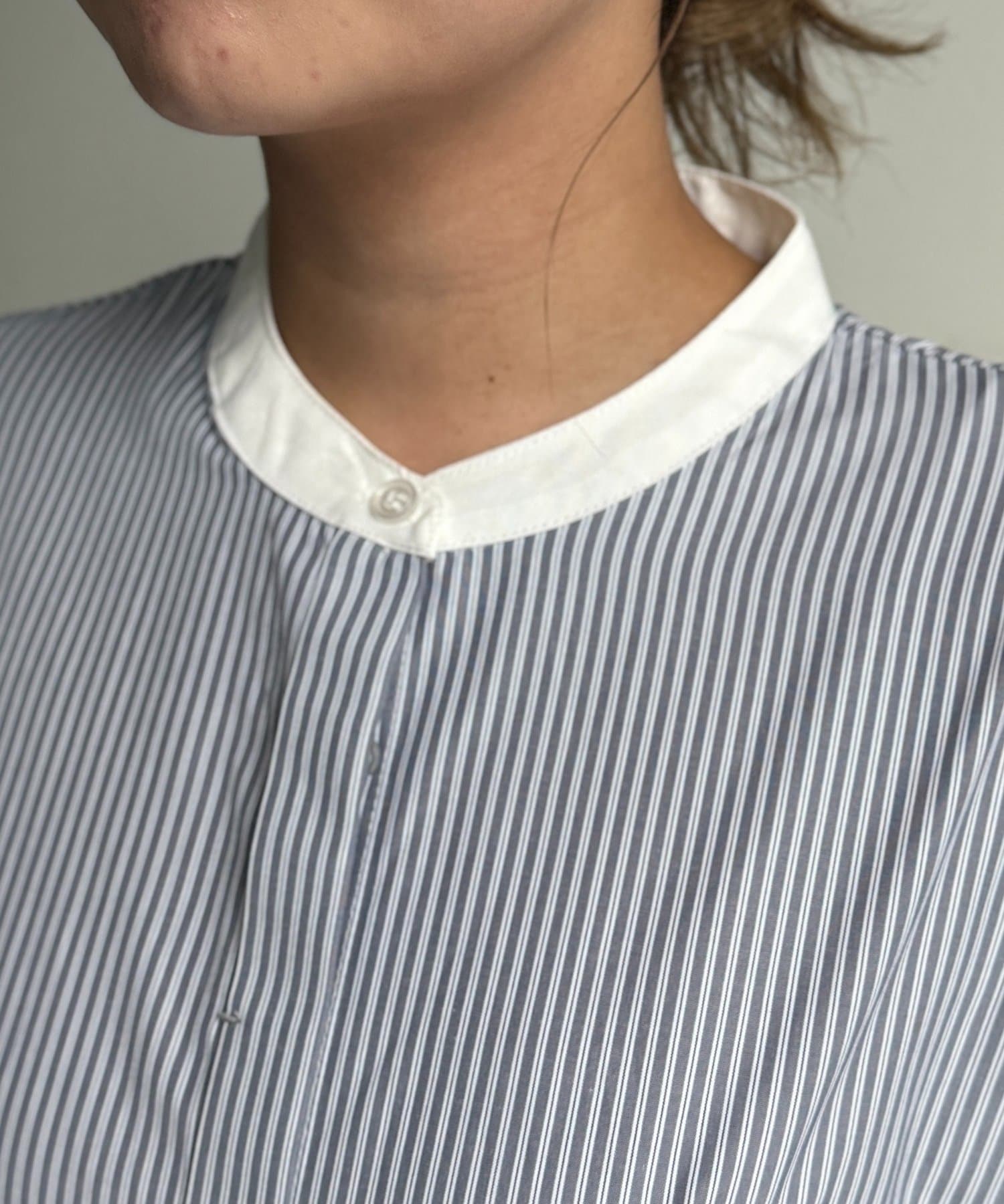 ・袖口のシャーリングやクレリックのバンドカラーが、甘すぎない上品さをプラス