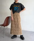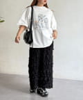 ・ロゴTシャツやスニーカーを合わせて、甘辛ミックスなカジュアルスタイルに。スカートの存在感が引き立ちます。