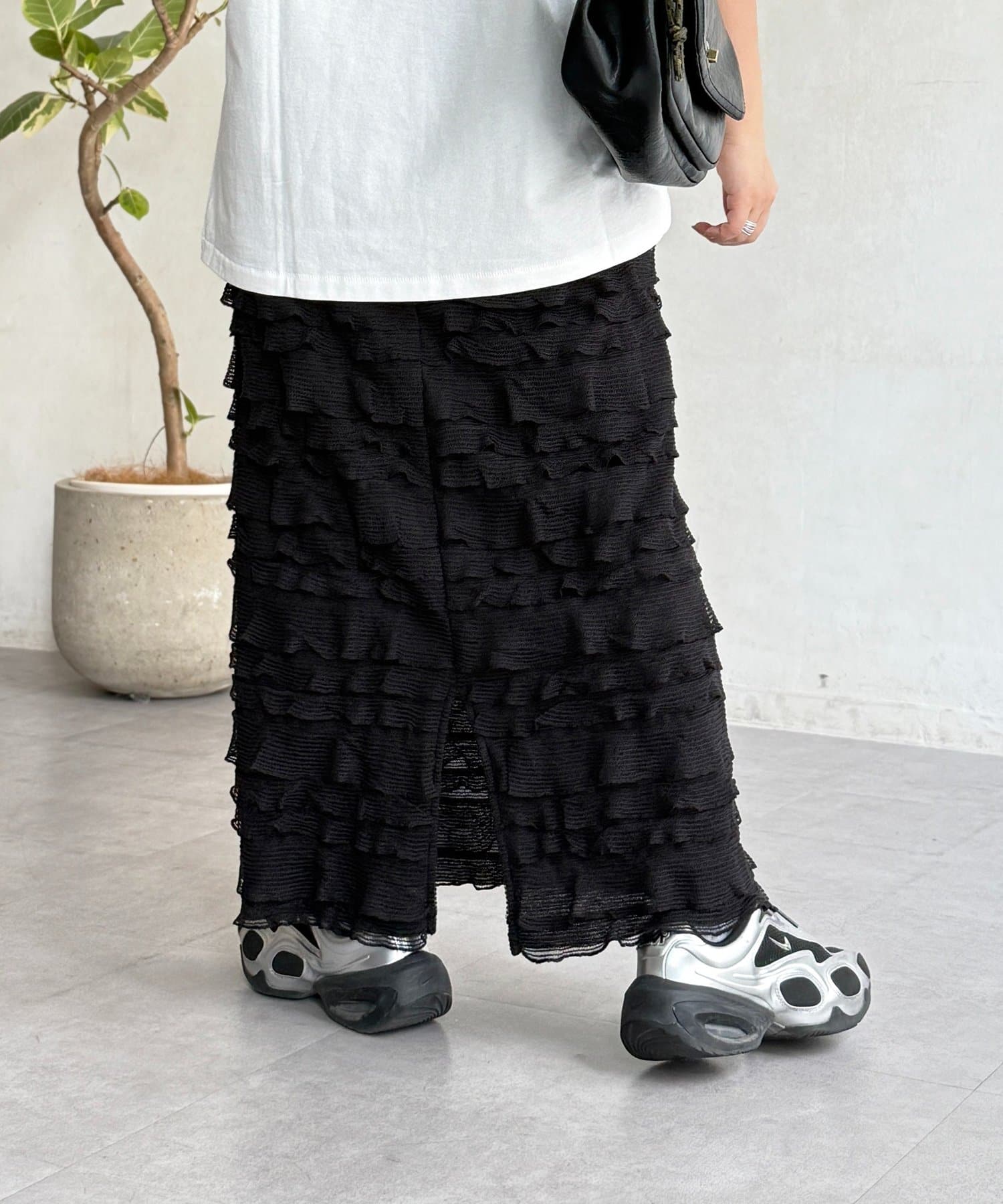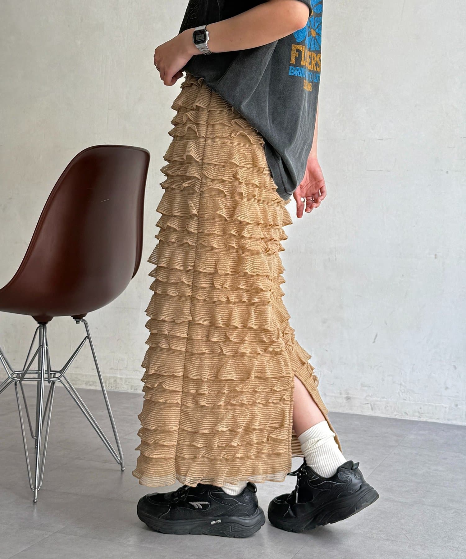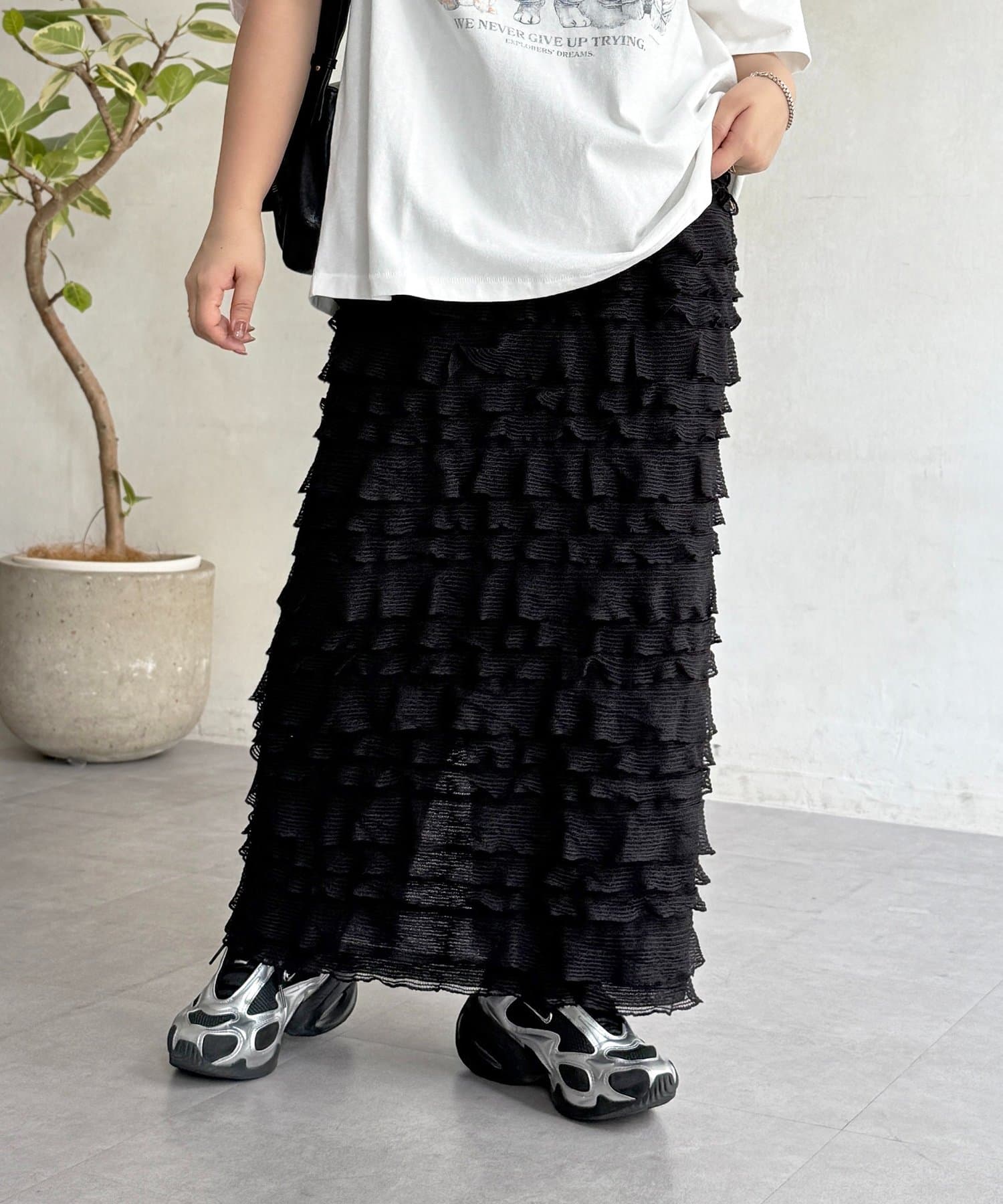 主役級の存在感。大人カジュアルに着こなす段々フリルスカート