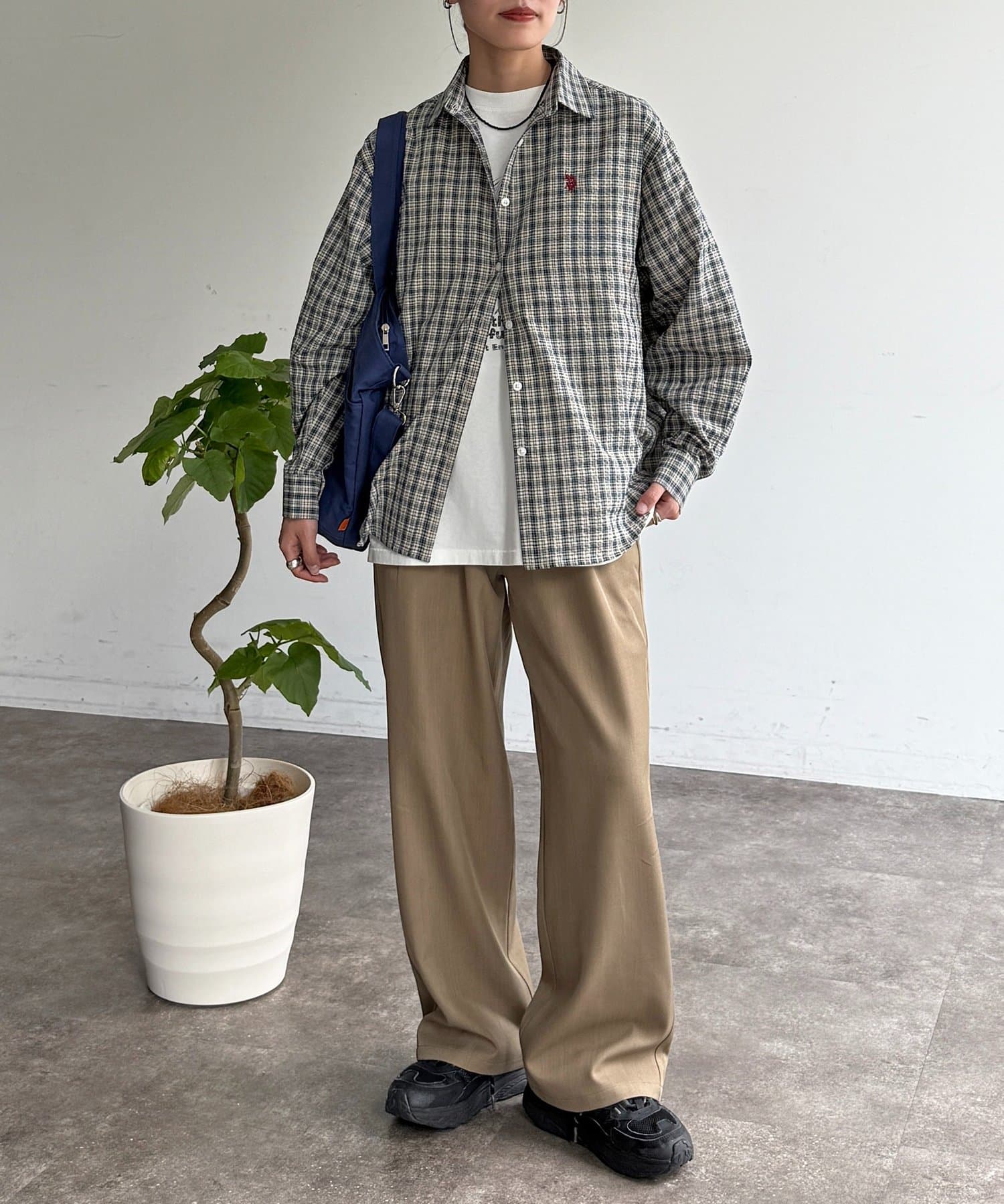 ・Tシャツと合わせて、ラフなカジュアルスタイルに。ボトムスはワイドパンツでトレンド感をプラス。