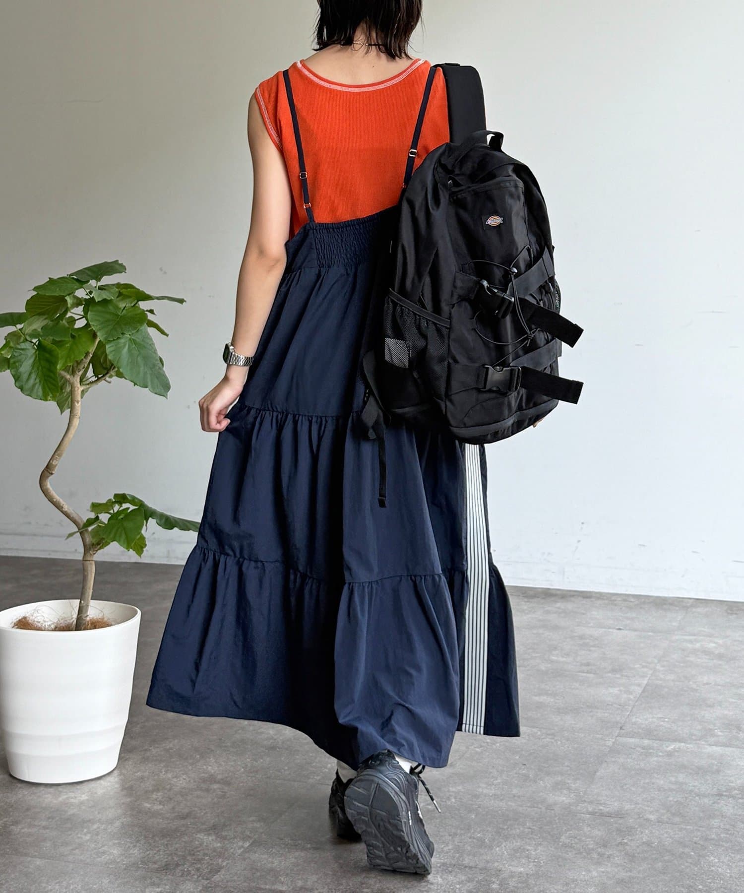 ・カラフルなタンクトップをインナーに、スニーカーとバックパックを合わせたアクティブなカジュアルスタイル