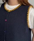 配色ステッチとカラーボタンが目を惹く、遊び心のあるニットベスト