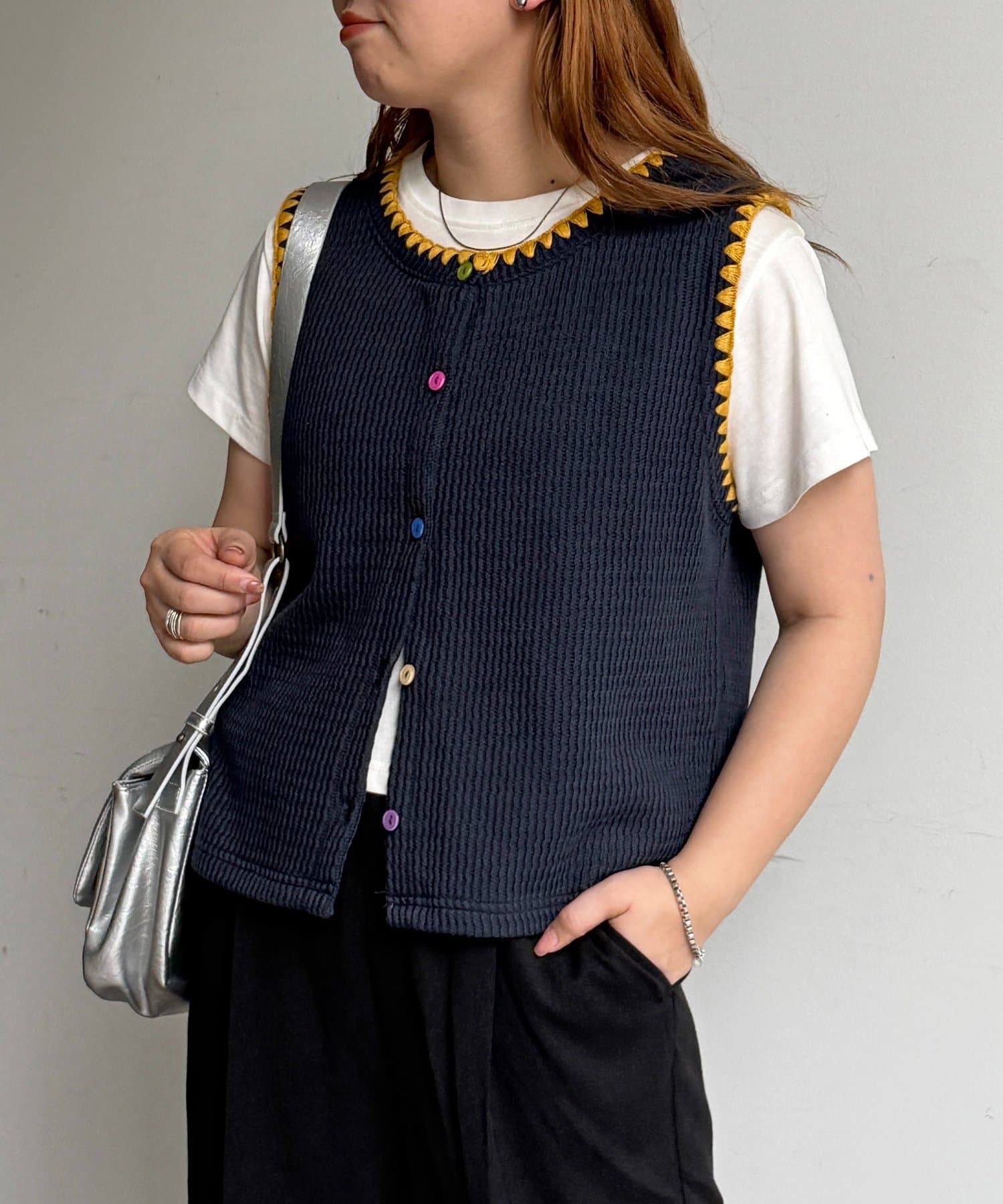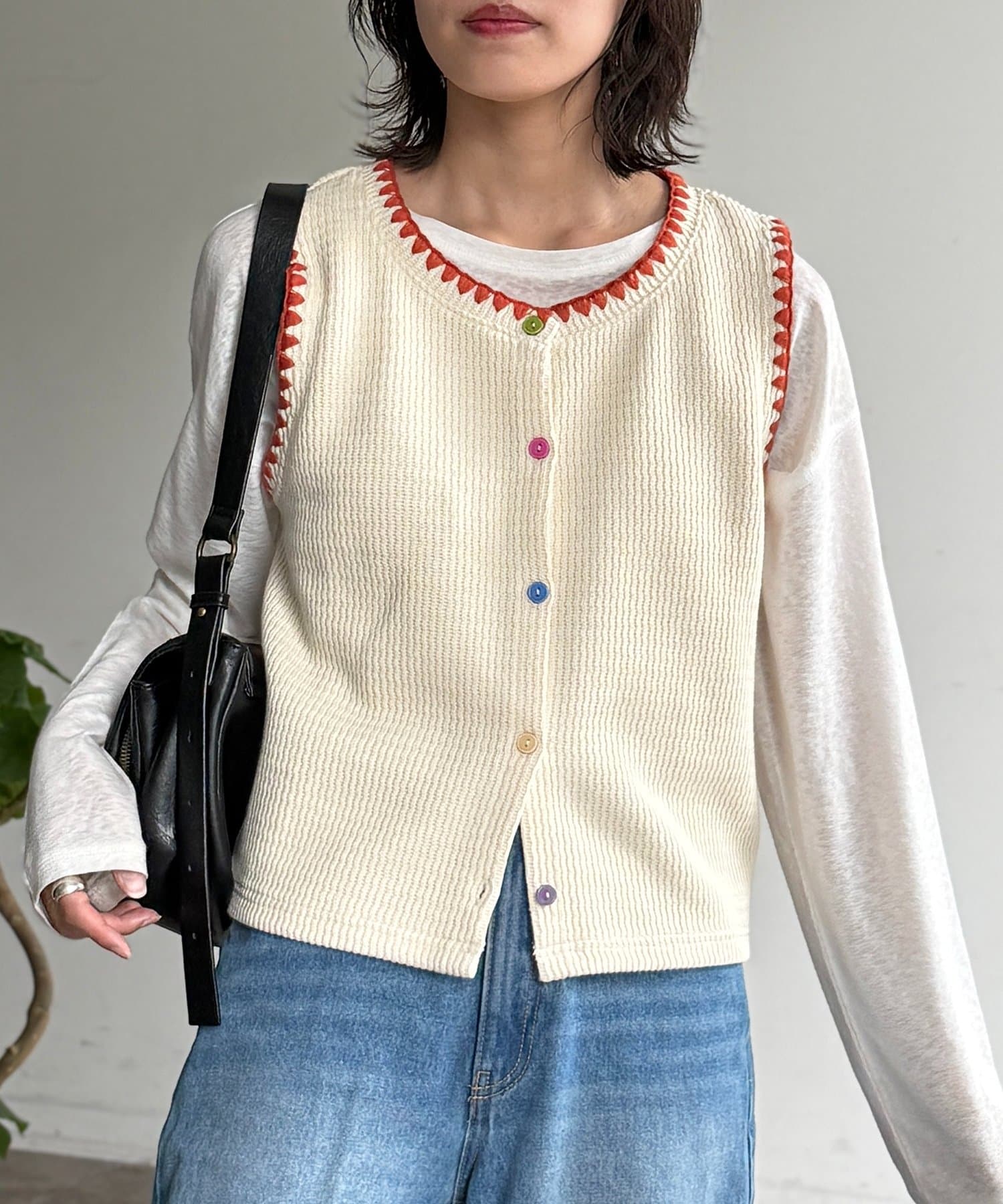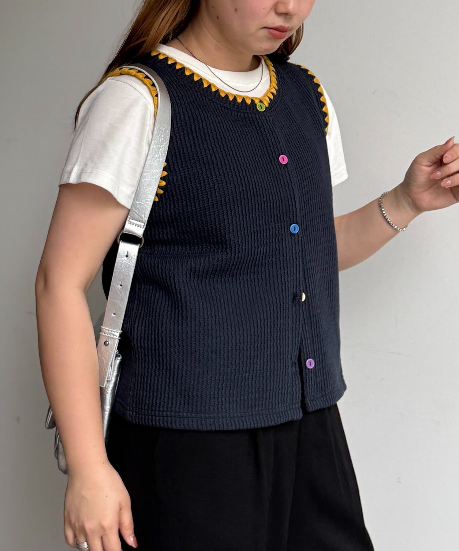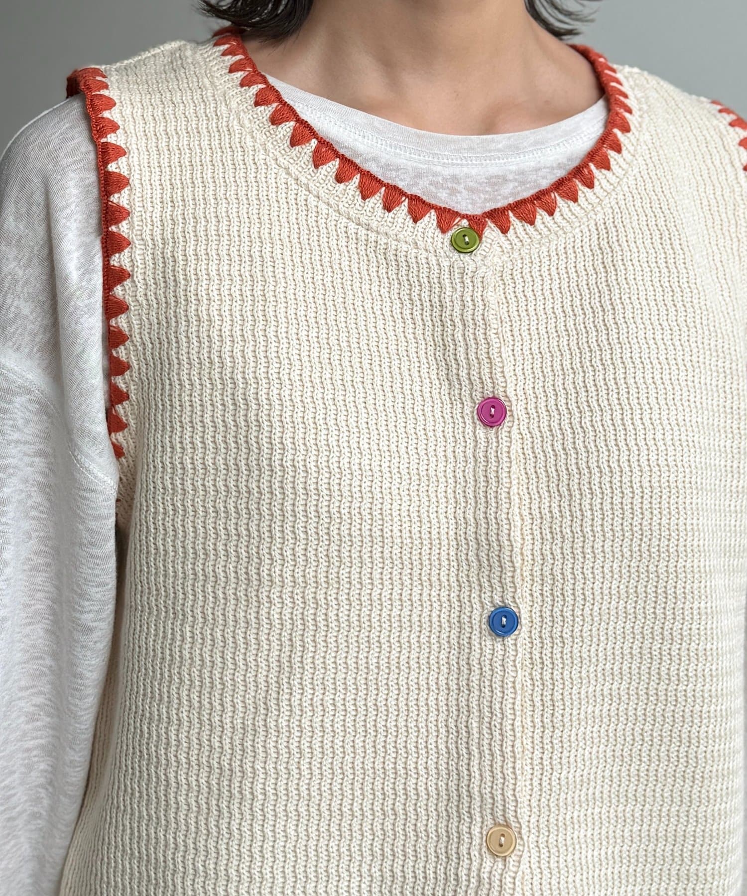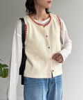 配色ステッチとカラーボタンが目を惹く、遊び心のあるニットベスト