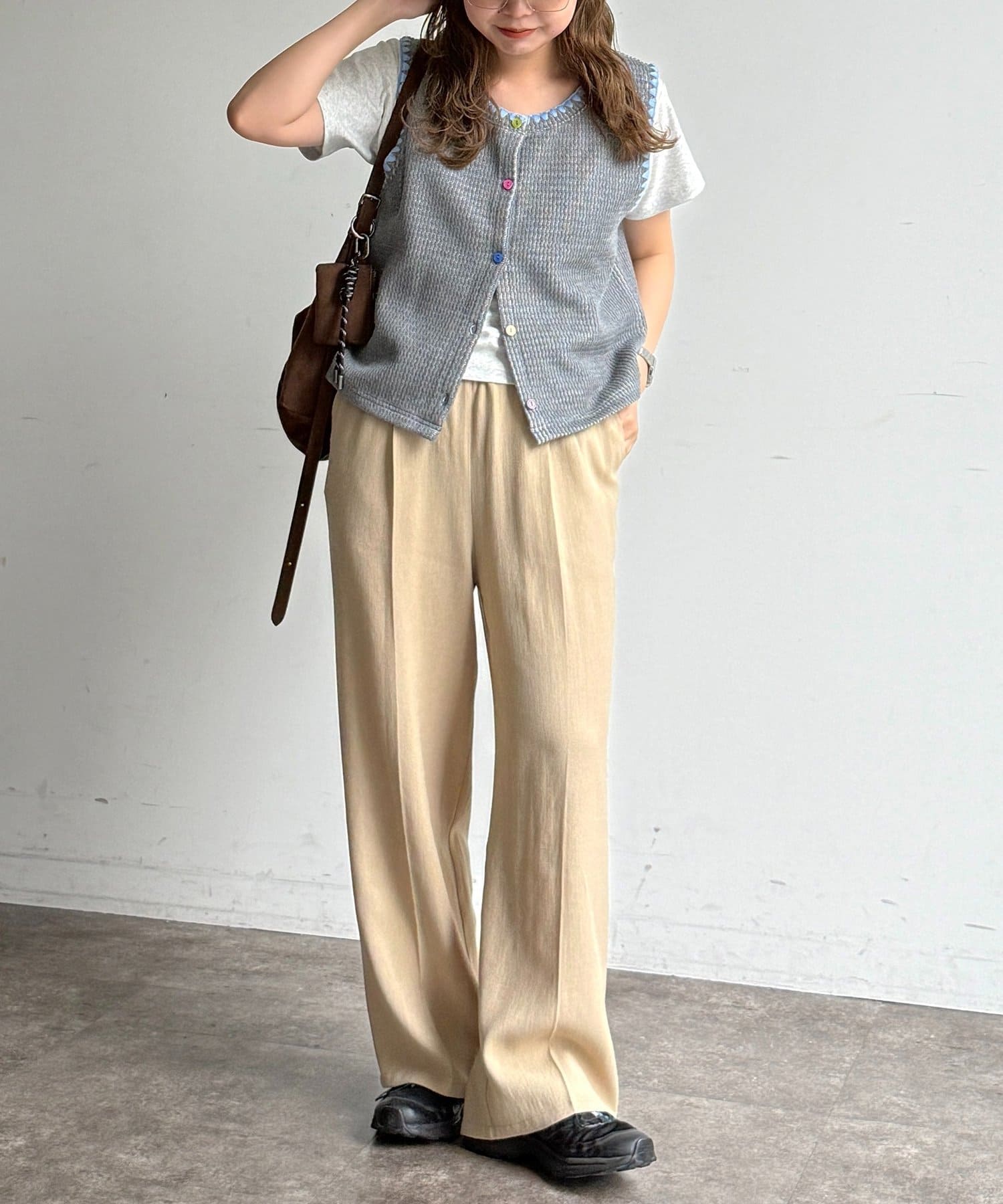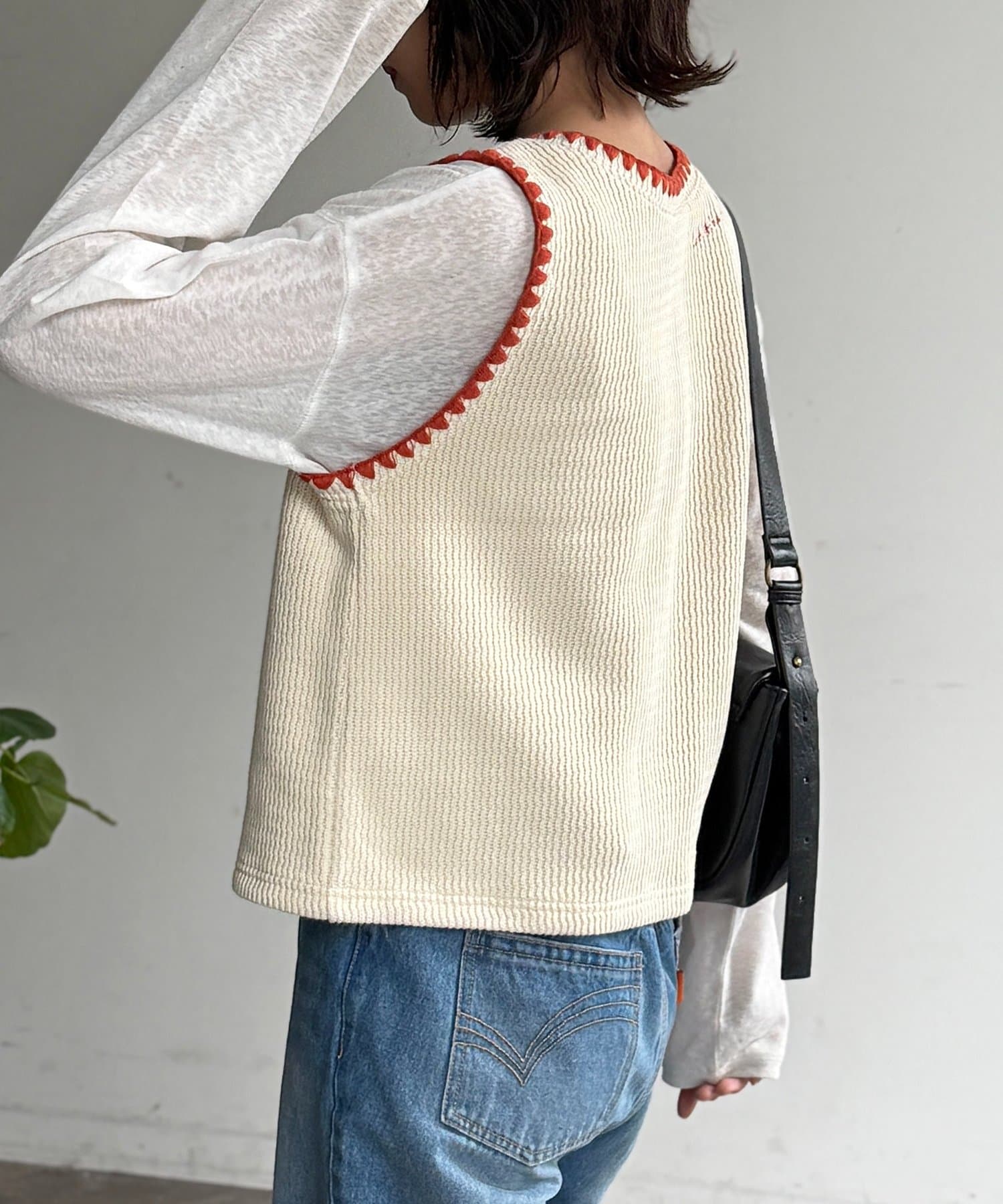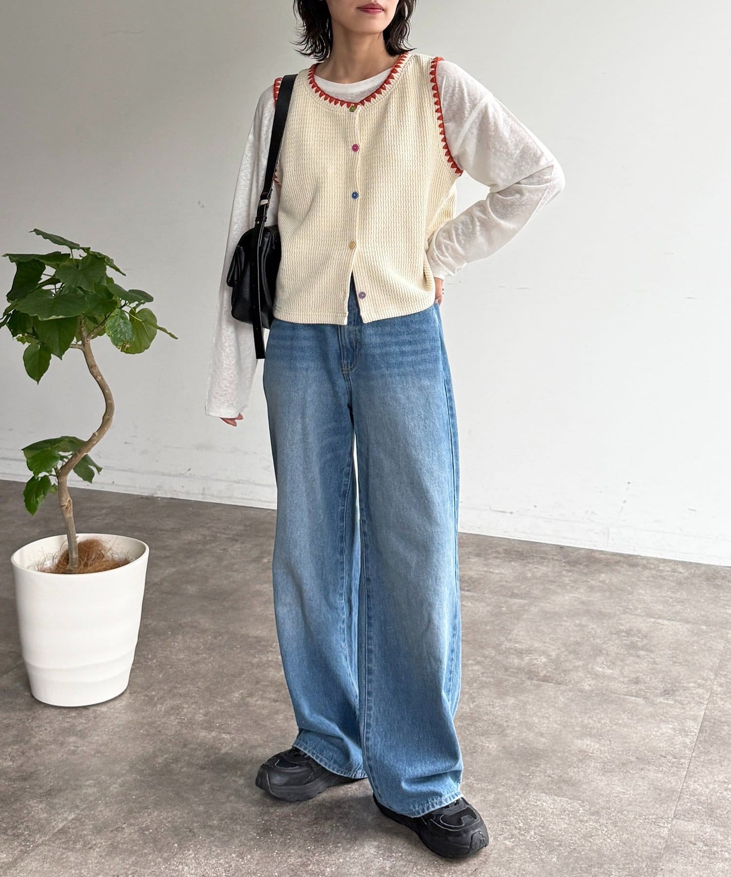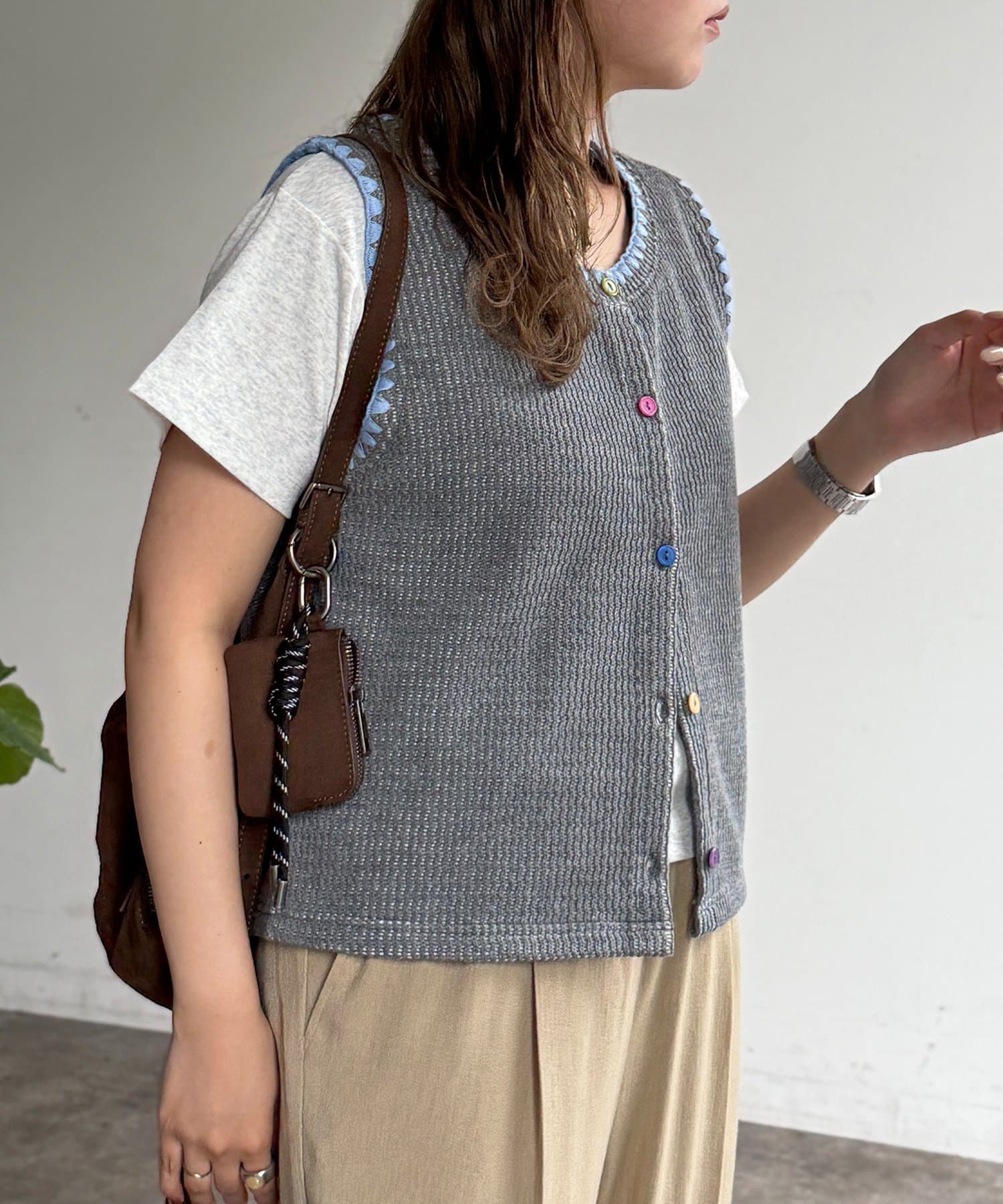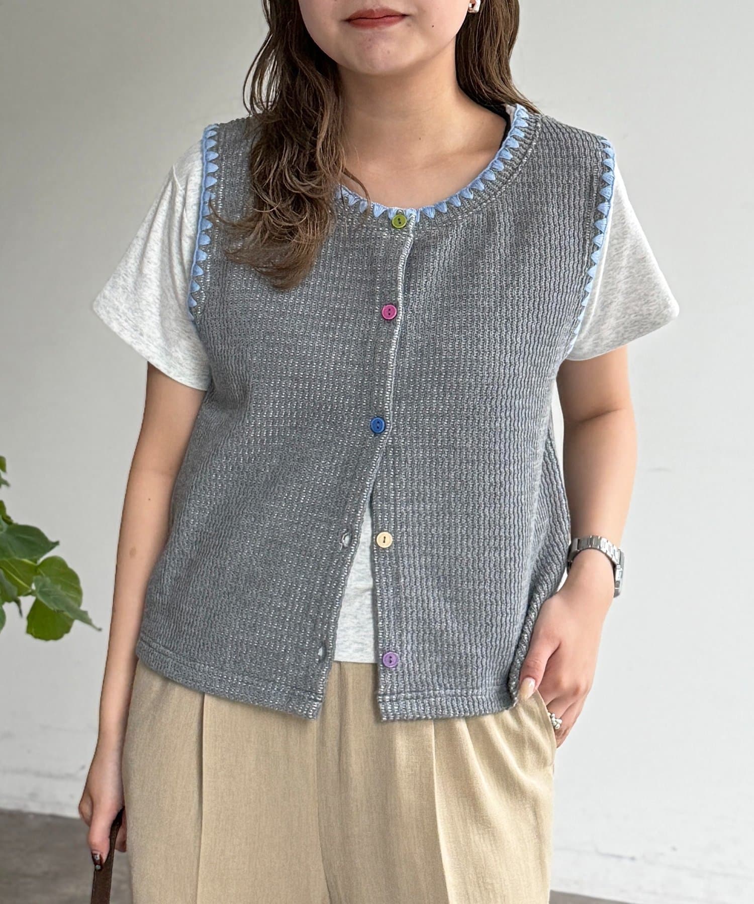配色ステッチとカラーボタンが目を惹く、遊び心のあるニットベスト