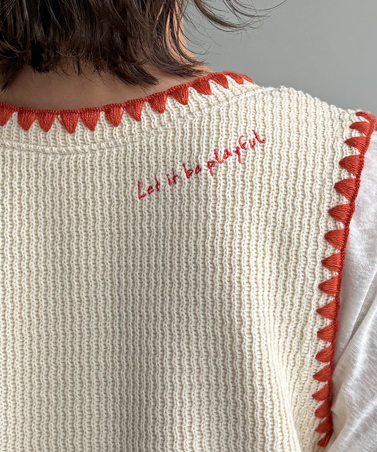 襟元とアームホールにあしらわれた配色ステッチと、ランダムなカラーボタンが顔周りを華やかに彩ります。