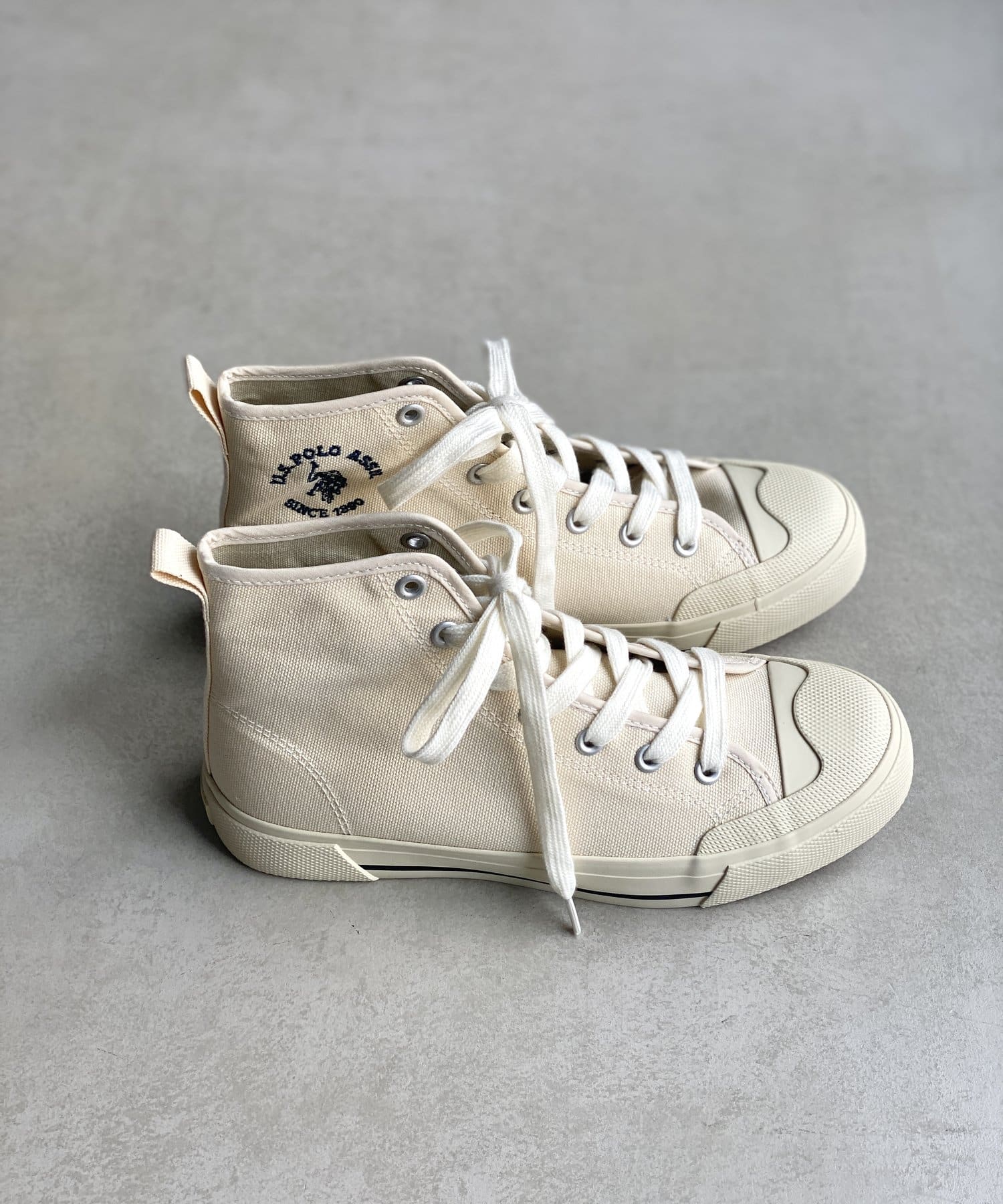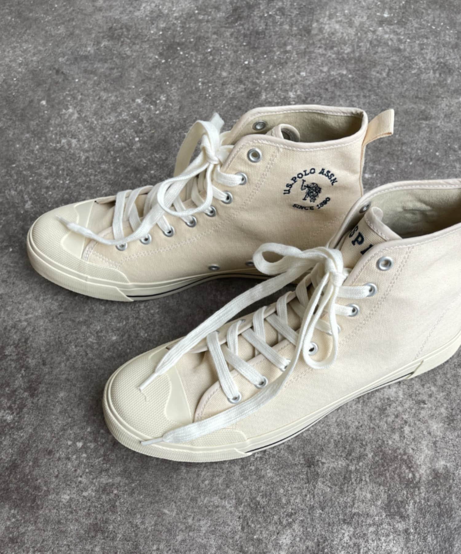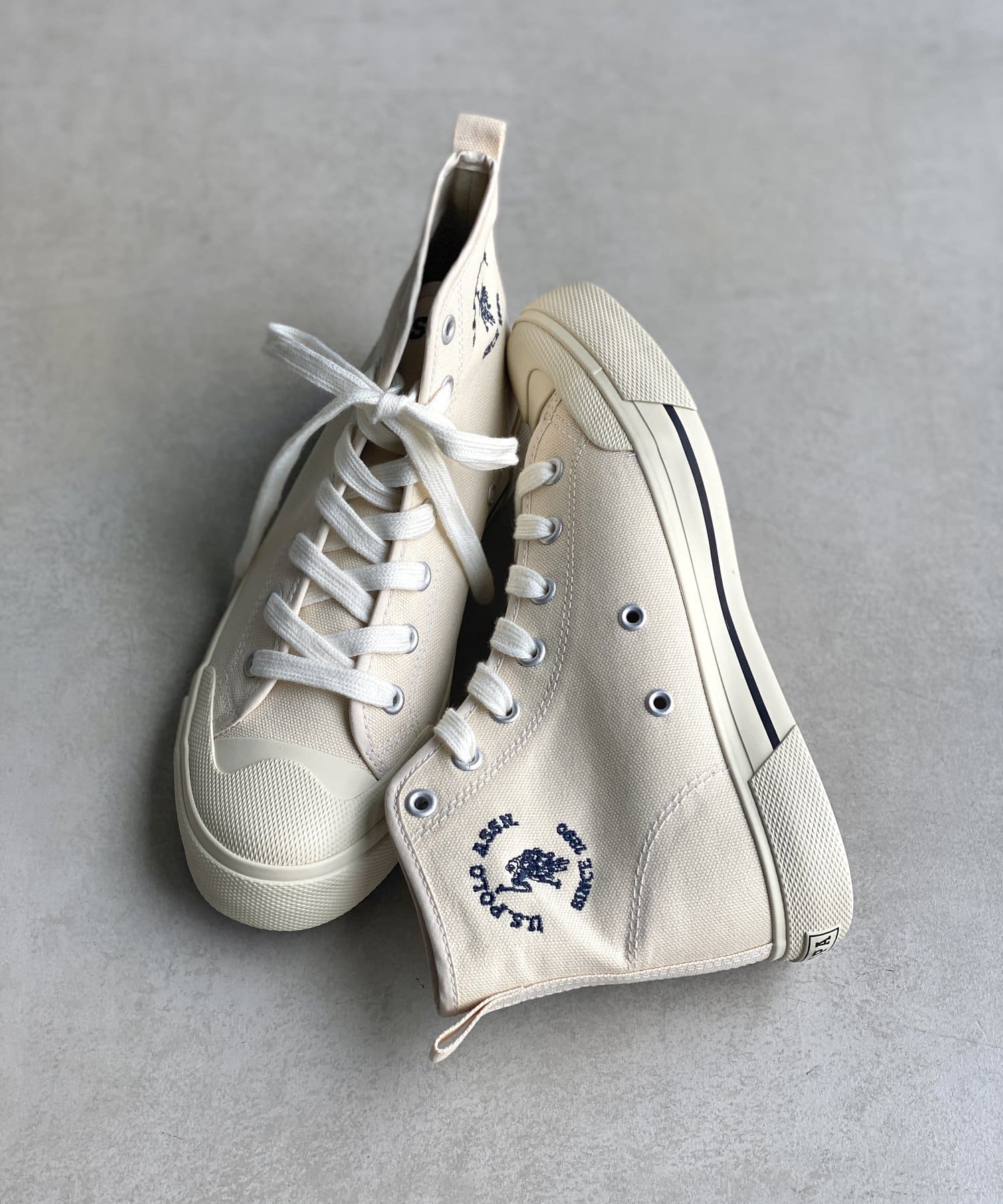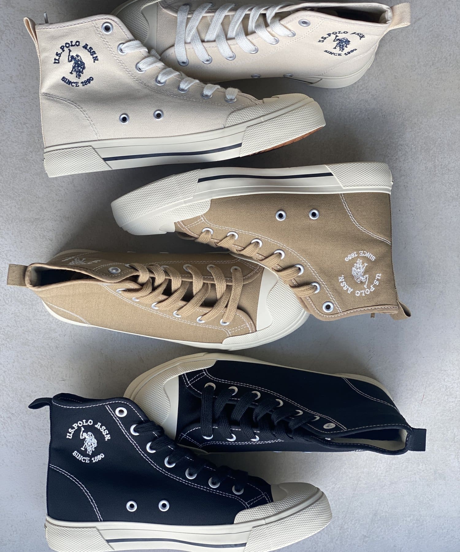 毎シーズン大人気のユーエスポロアッスンから、ベーシックで使い勝手の良い、ロゴデザインが目をひくハイカットスニーカーがリリースしました!オールシーズンお使い頂けるキャンバス素材で、デイリーユースにもぴったりなデザインです!ベーシックなカラーリングで幅広いスタイルにあわせやすいアイテムで流行り廃りなく定番アイテムとして長く愛用頂けます◎