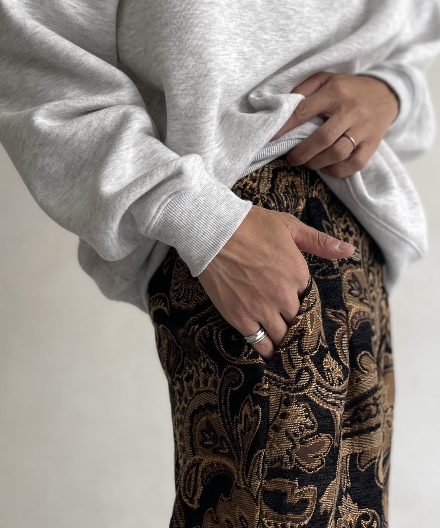スタイリングのポイントになる総柄デザインは、印象的でありながらも落ち着いたトーンでシンプルなスタイリングも格上げしてくれます。