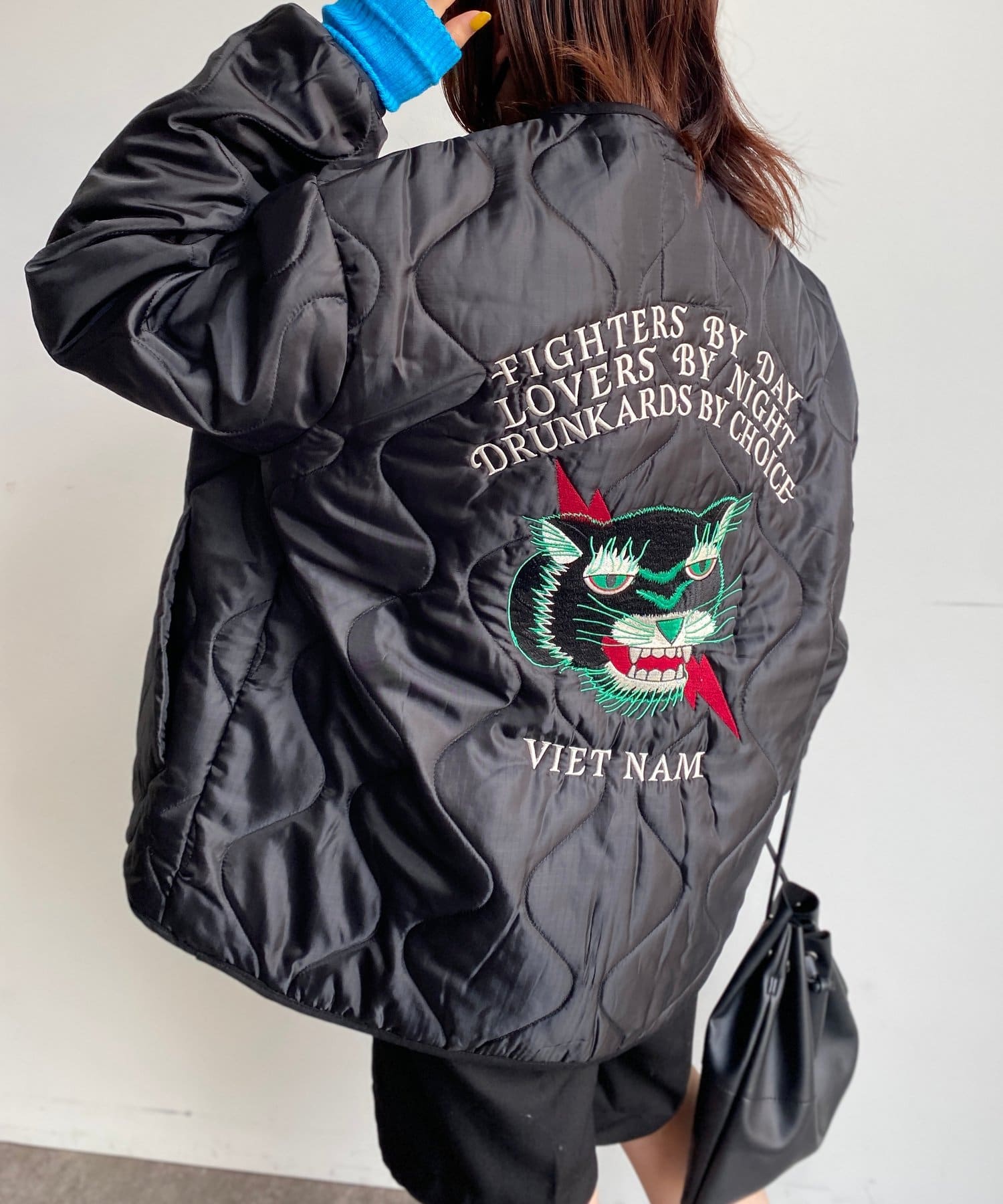 毎シーズン注目されているキルティングライナー。CPCMらしく拘りのあるデザインで登場しました。他と差をつけるトラ刺繍がインパクト大です!ミリタリーテイストな雰囲気でルーズなトップスとも相性が良く、着回しがきく汎用性が高い1着です。デニムパンツやカーゴパンツ、Y2Kファッションとして、ミニボトムやアームウォーマーなどのトレンドアイテムと合わせたスタイリングがおすすめ。